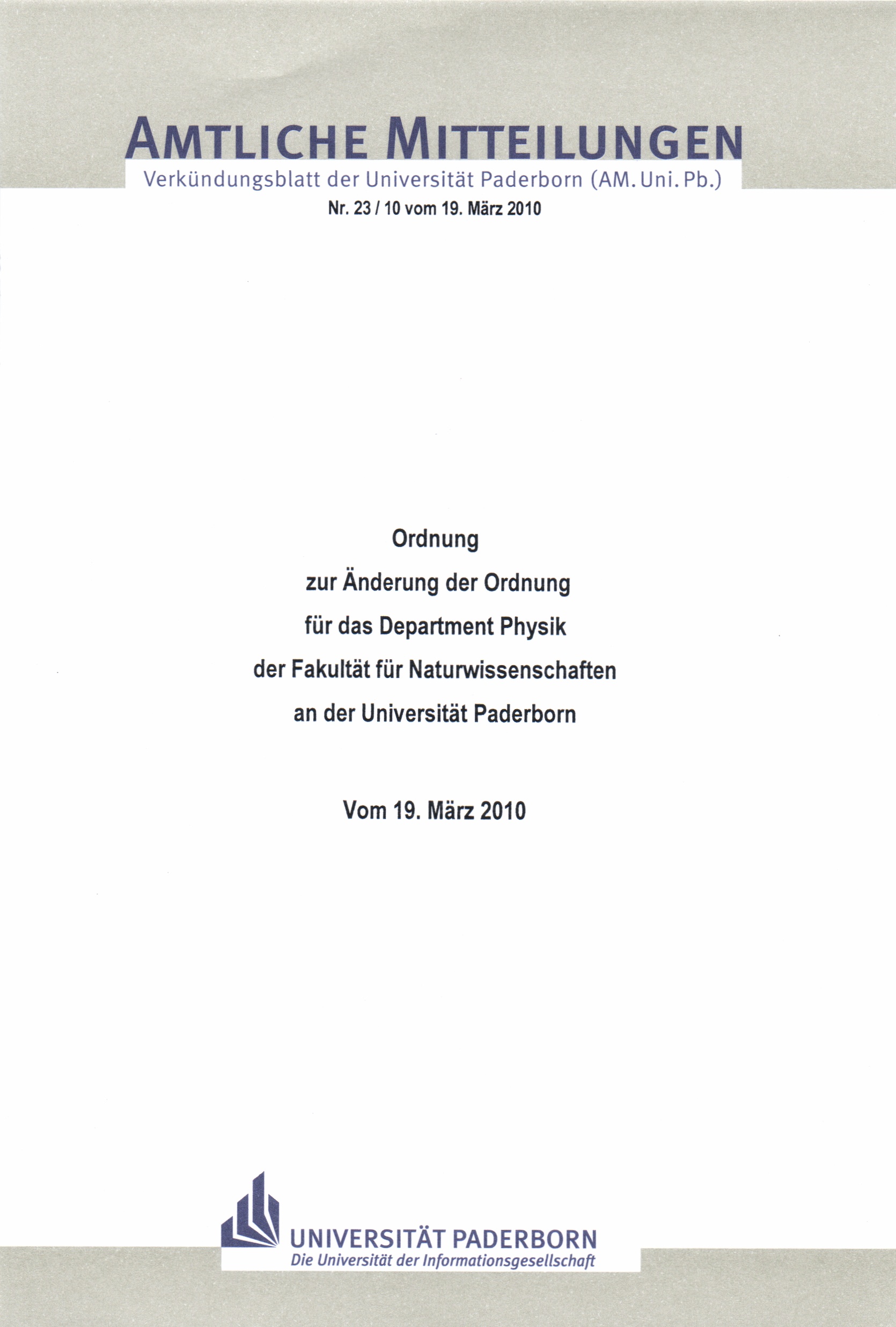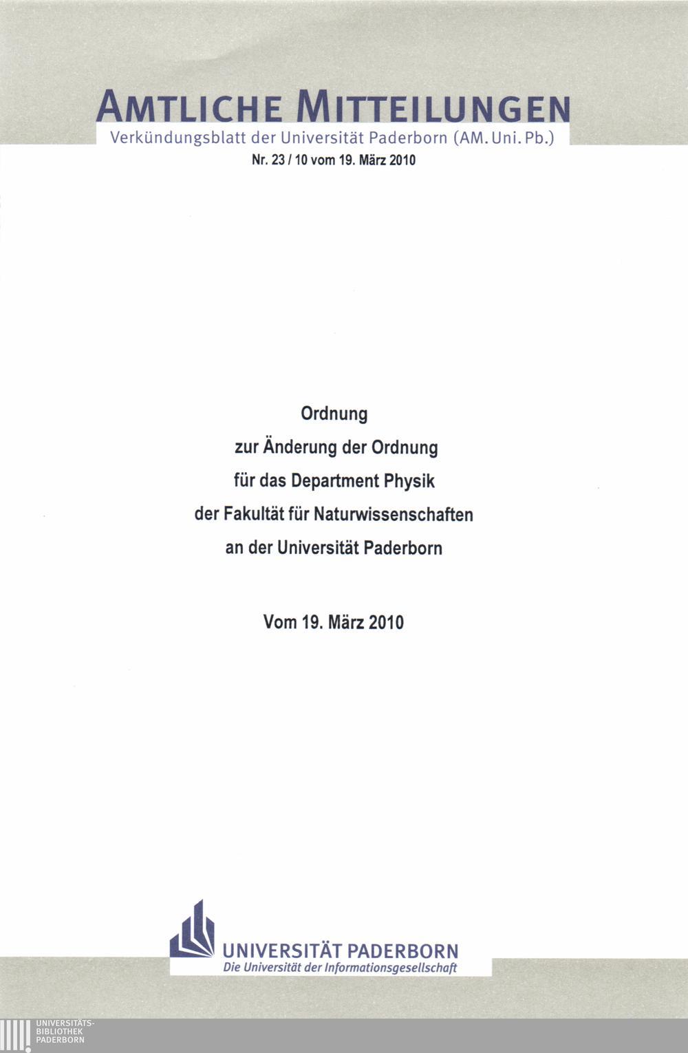Ordnung zur Änderung der Ordnung für das Department Physik der Fakultät für Naturwissenschaften an der Universität Paderborn : vom 19. März 2010