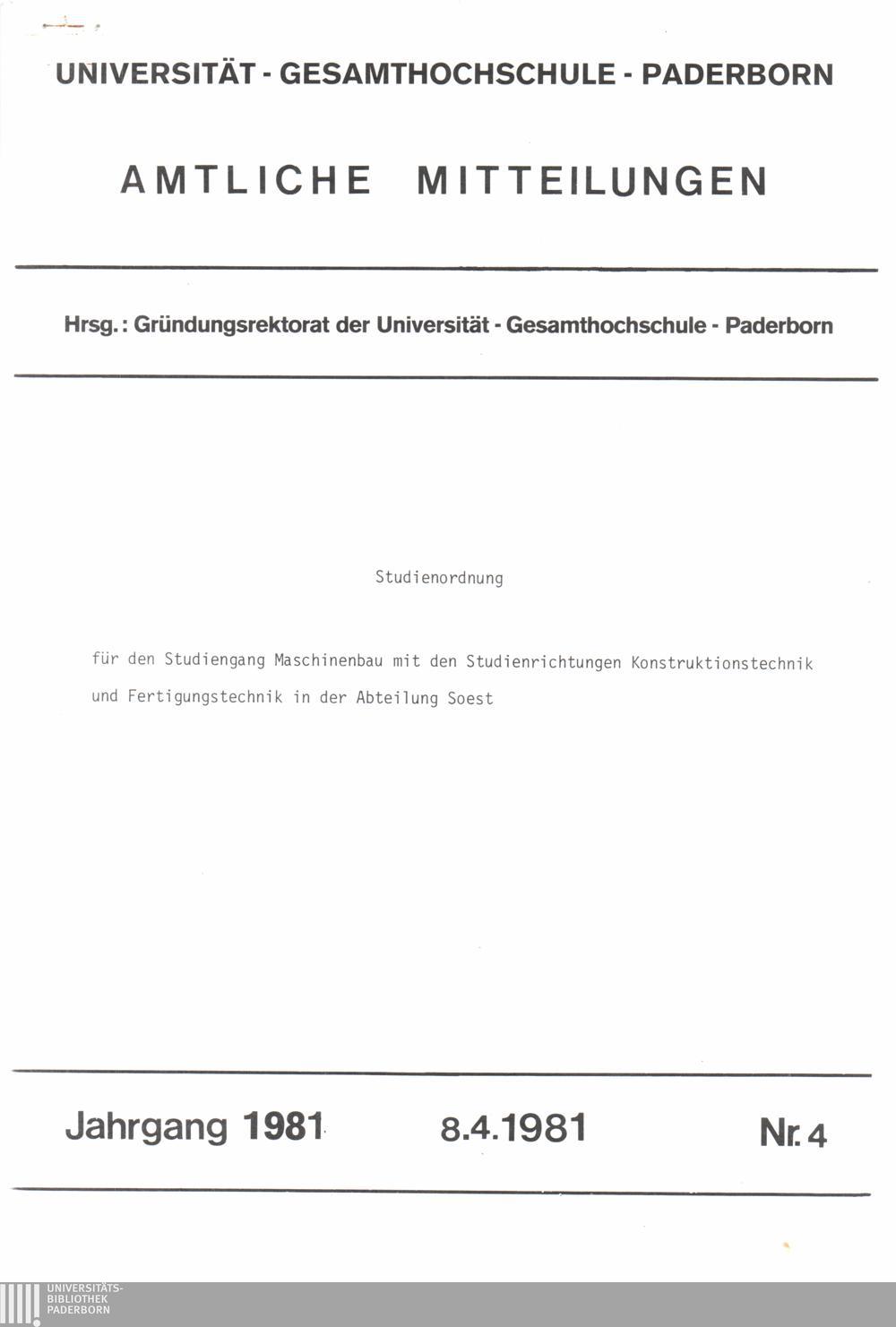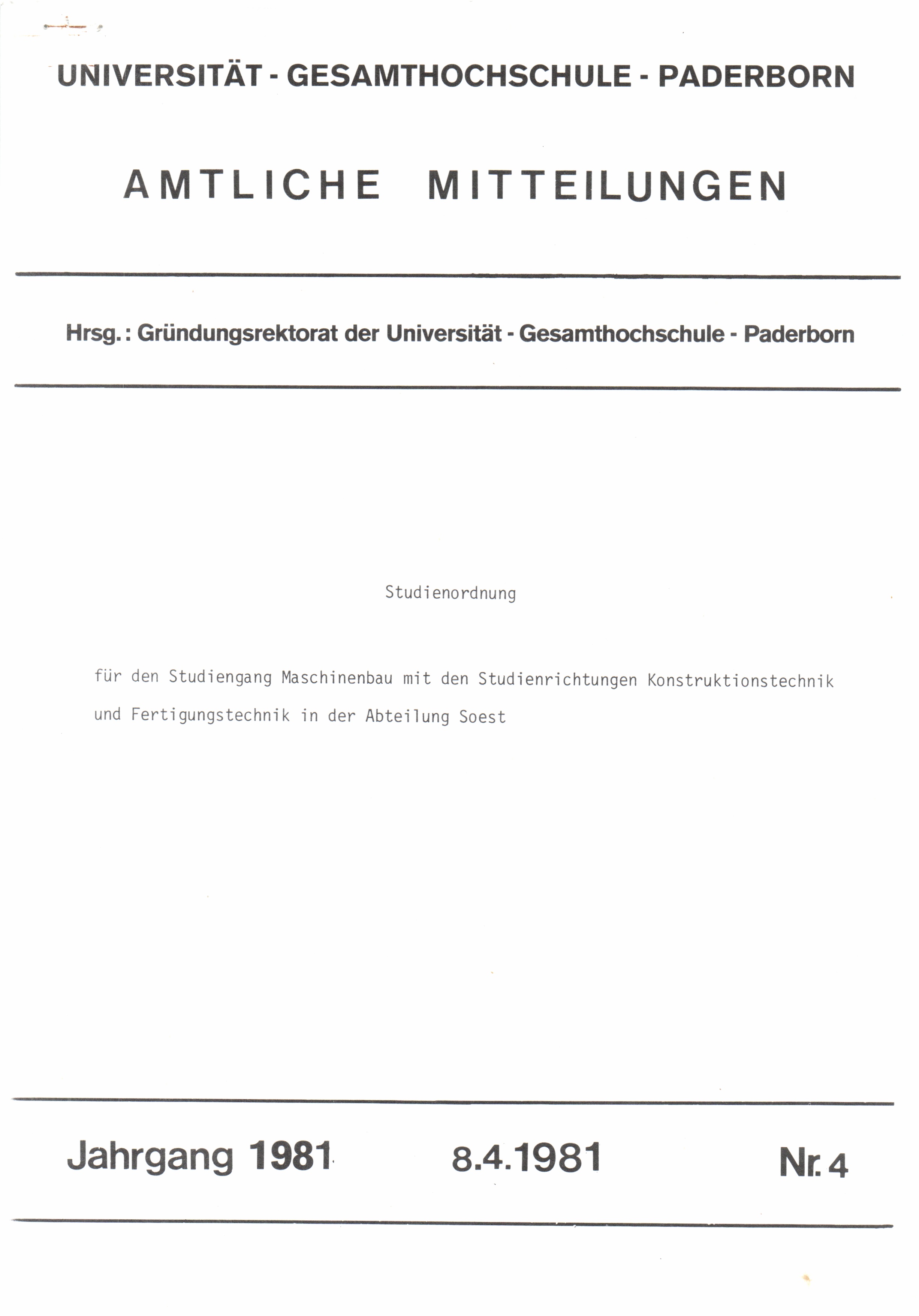 Studienordnung für den Studiengang Maschinenbau mit den Studienrichtungen Konstruktionstechnik und Fertigungstechnik in der Abteilung Soest : 8.4.1981