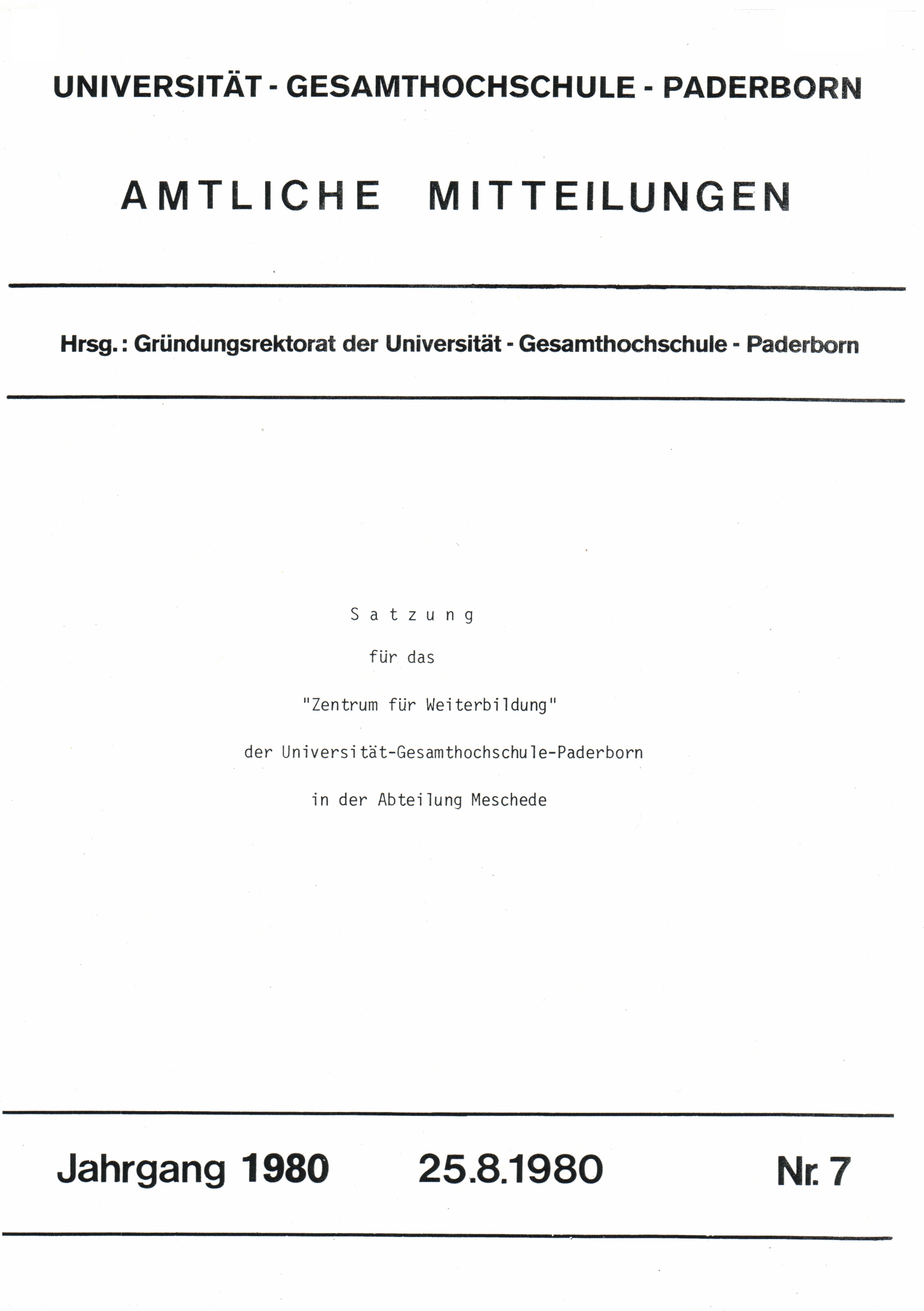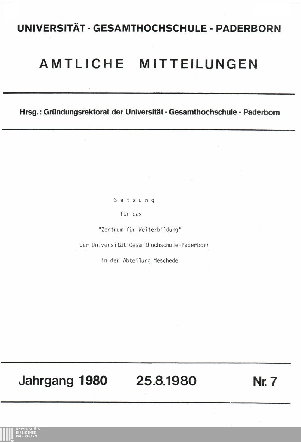 Satzung für das "Zentrum für Weiterbildung" der Universität-Gesamthochschule-Paderborn in der Abteilung Meschede : 25.8.1980