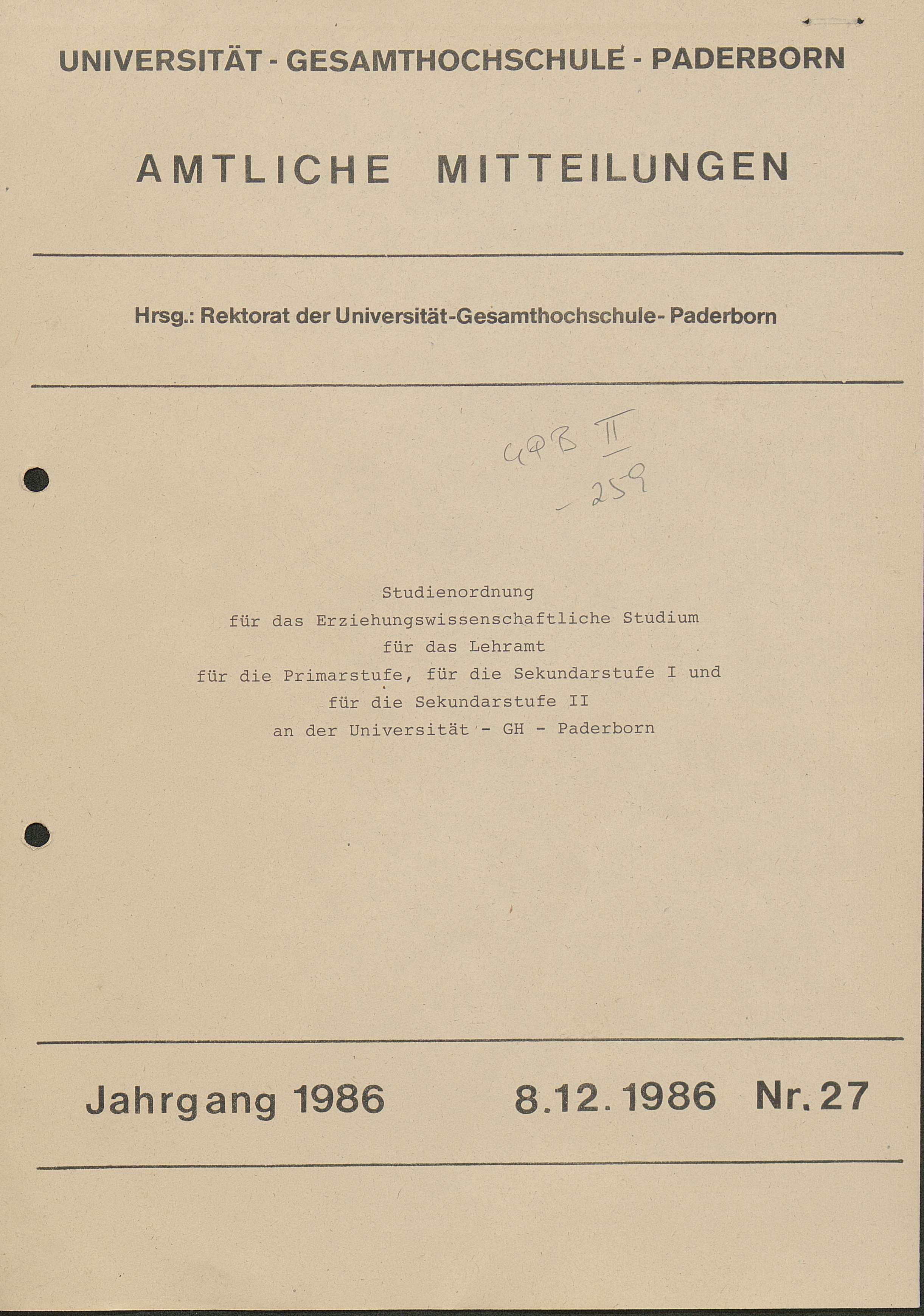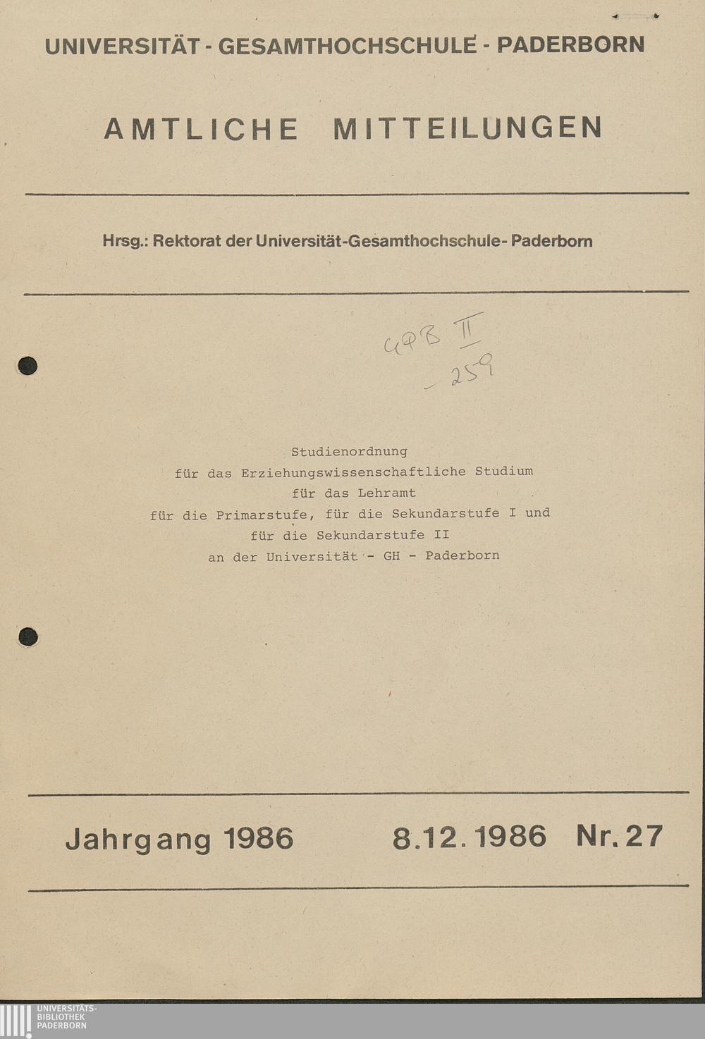 Studienordnung für das Erziehungswissenschaftliche Studium für das Lehramt für die Primarstufe, für die Sekundarstufe I und für die Sekundarstufe II an der Universität-GH-Paderborn : 8.12.1986