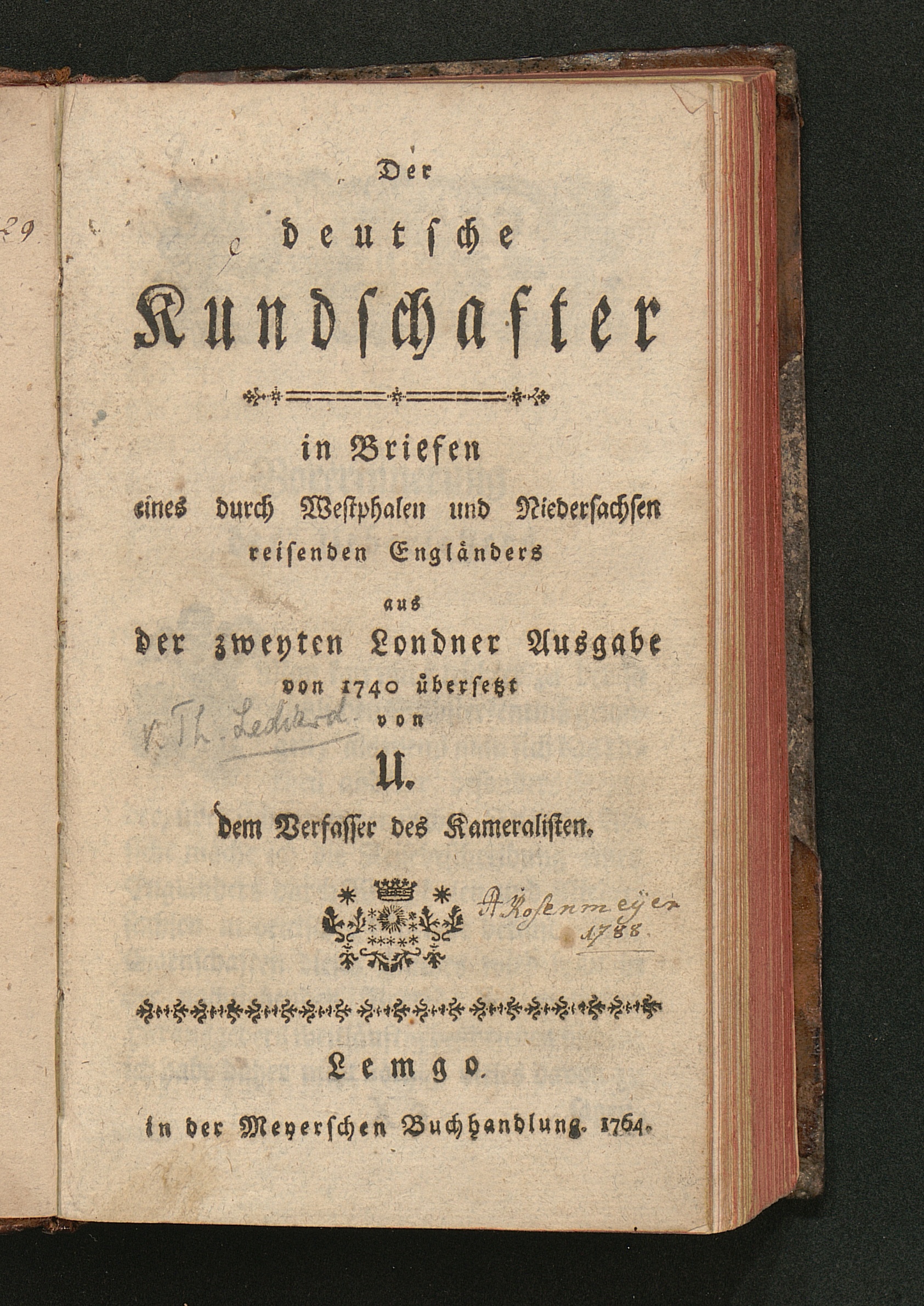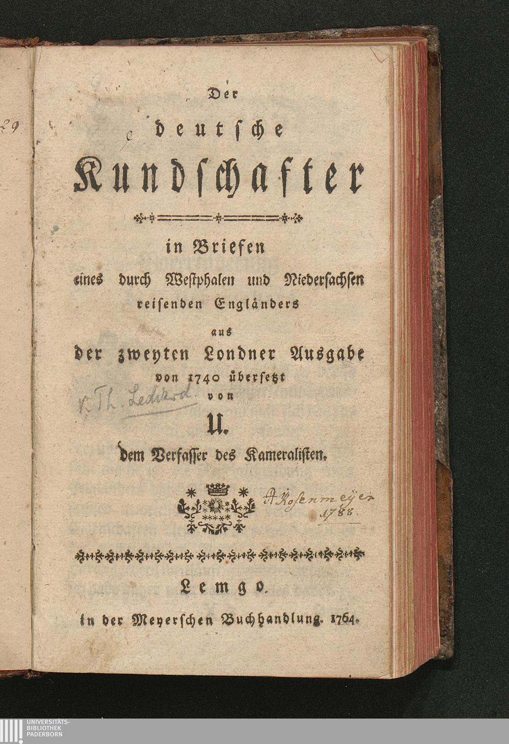 Der deutsche Kundschafter : in Briefen eines durch Westphalen und Niedersachsen reisenden Engländers / [Thomas Lediard]. Aus der zweyten Londner Ausgabe von 1740 übersetzt von U., dem Verfasser des Kameralisten