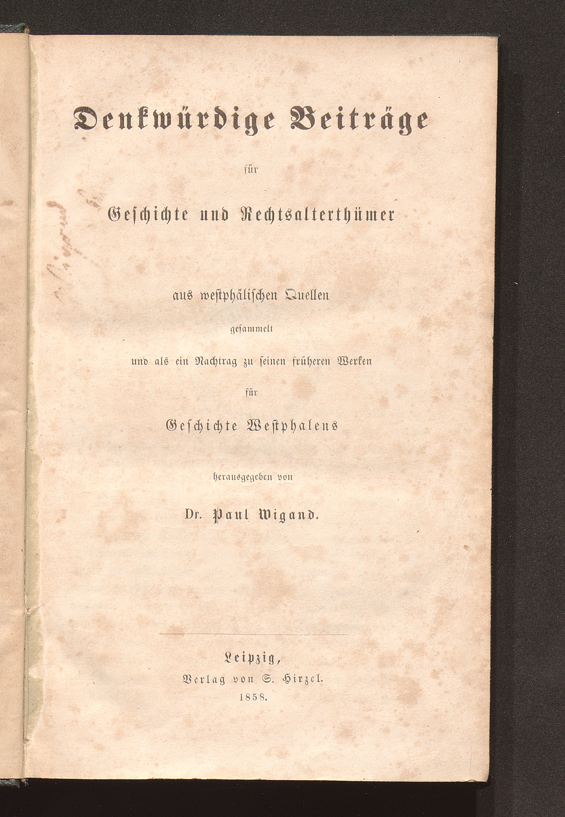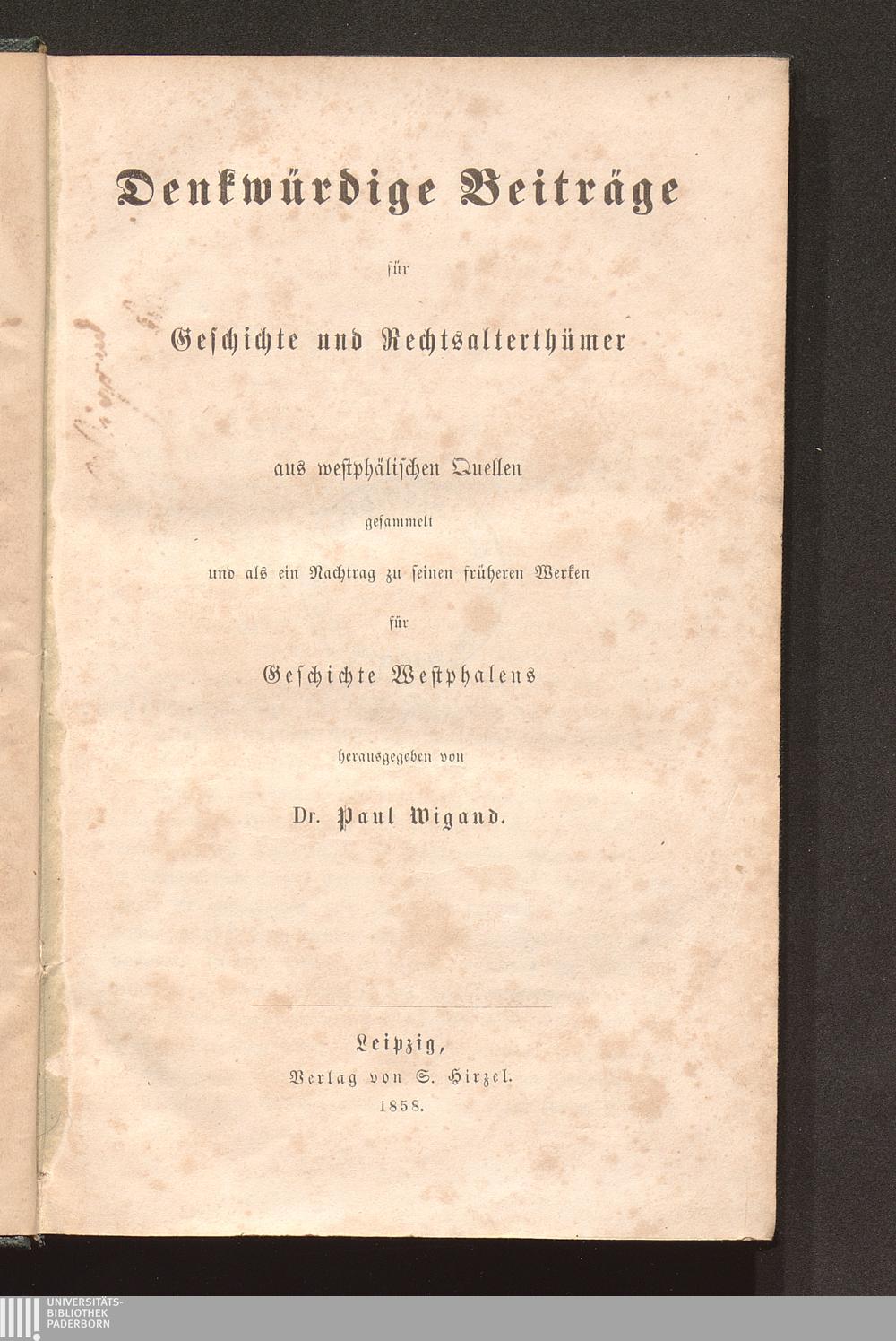 Denkwürdige Beiträge für Geschichte und Rechtsalterthümer / aus westphälischen Quellen gesammelt und als ein Nachtrag zu seinen früheren Werken für Geschichte Westphalens hrsg. von Paul Wigand