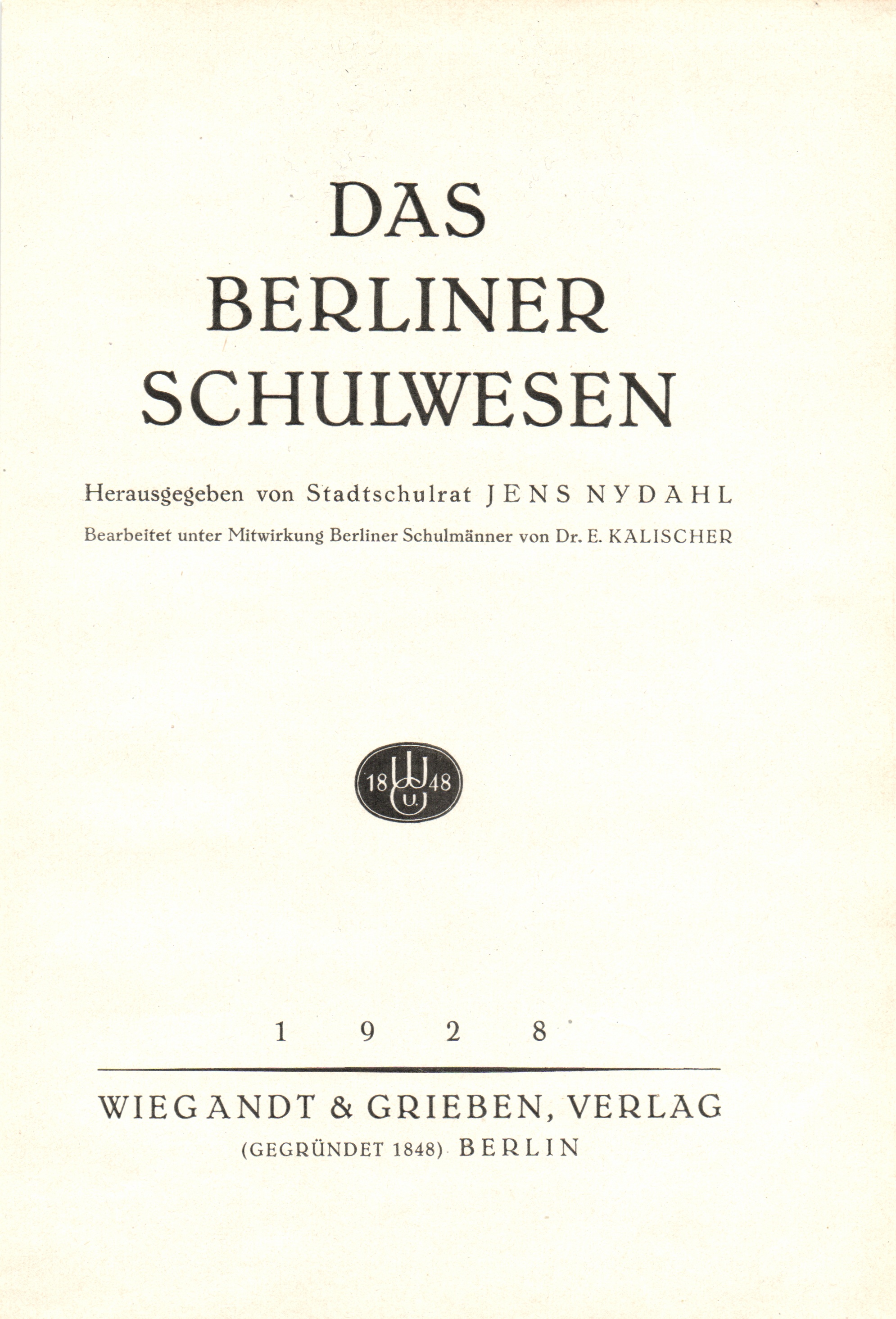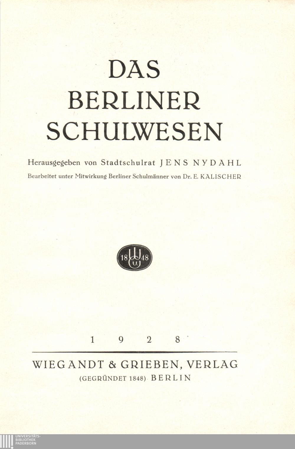 Das Berliner Schulwesen / hrsg. von Jens Nydahl. Bearb. ... von E. Kalischer