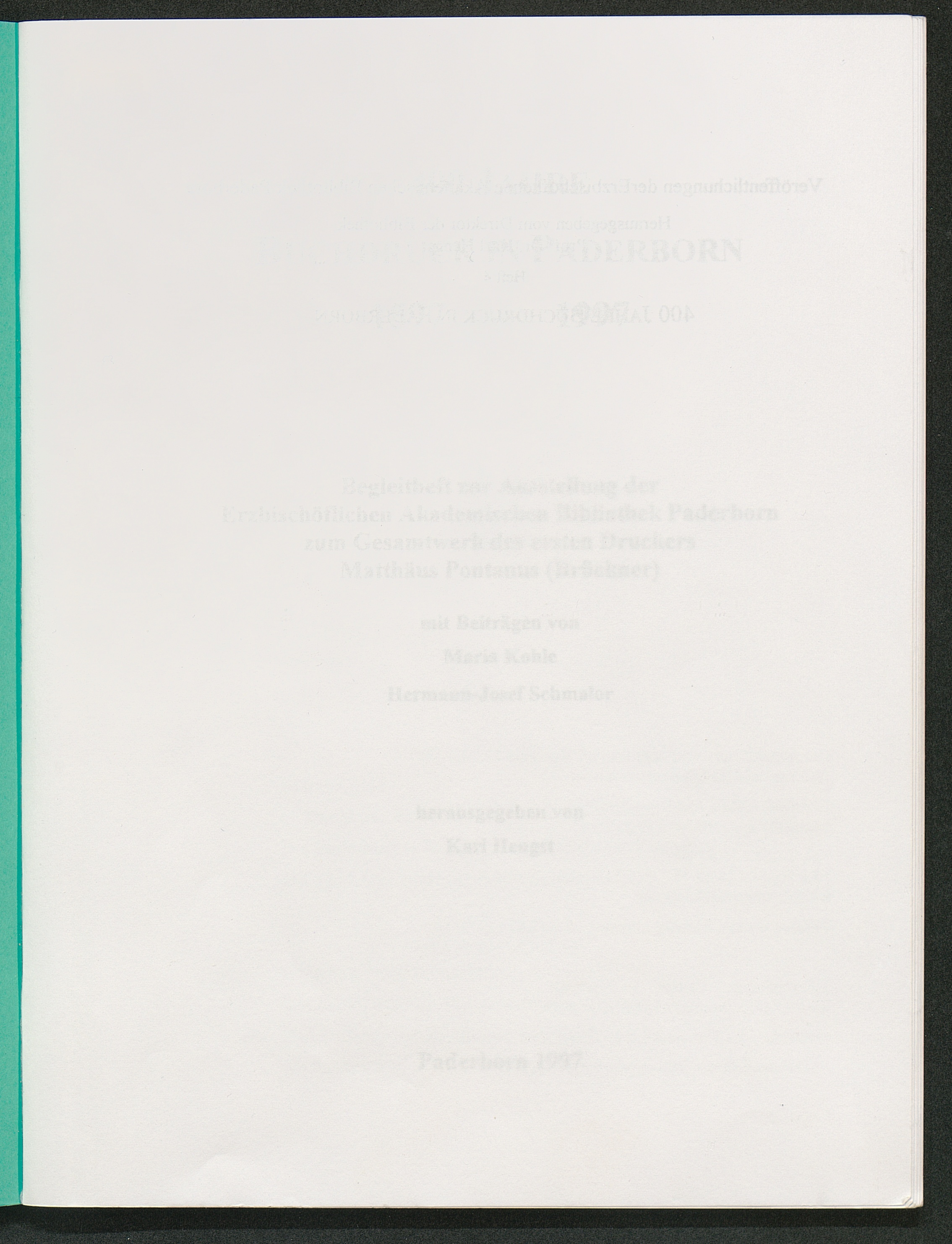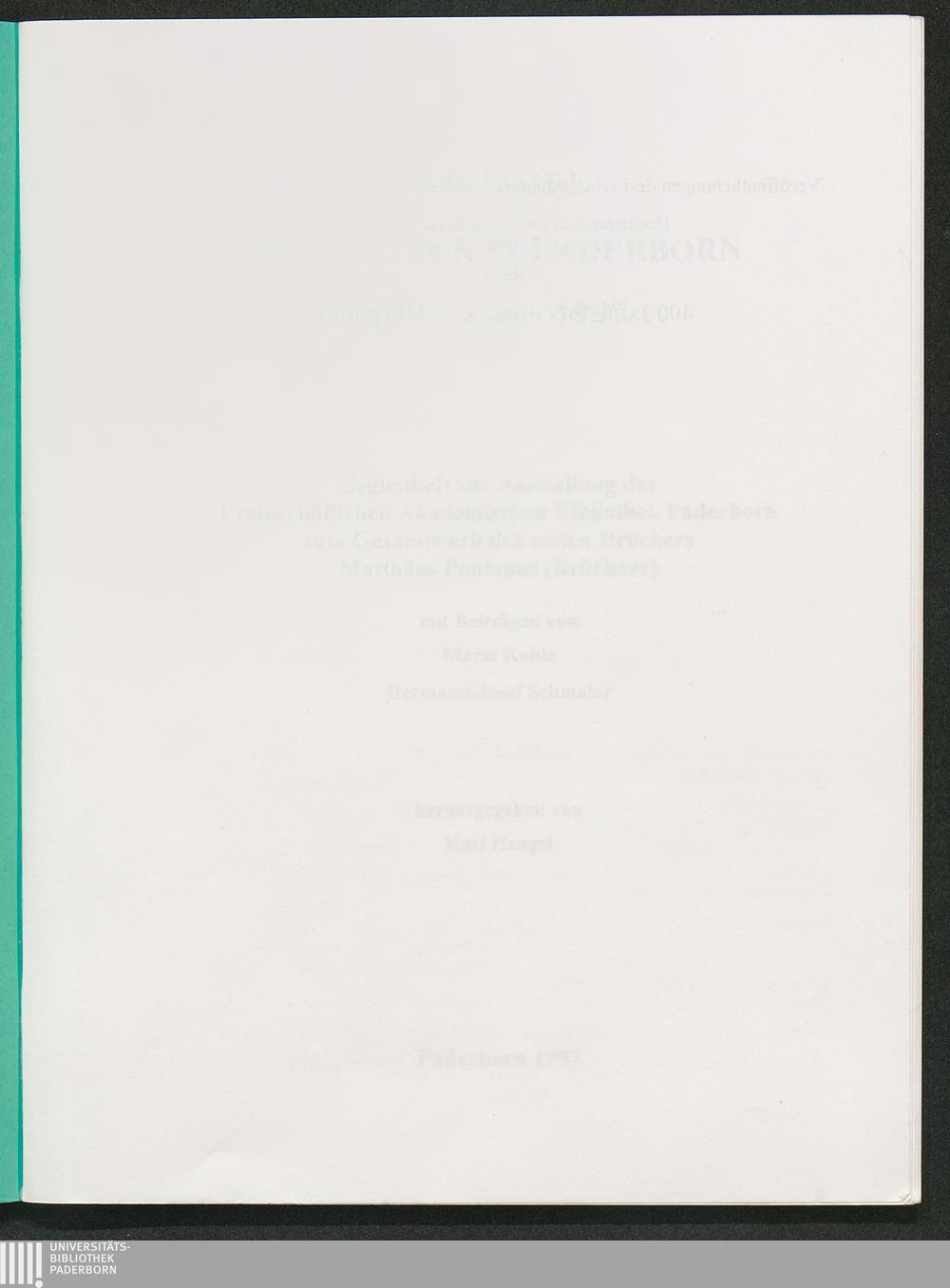 400 Jahre Buchdruck in Paderborn : 1597 - 1997 ; Begleitheft zur Ausstellung der Erzbischöflichen Akademischen Bibliothek Paderborn zum Gesamtwerk des ersten Druckers Matthäus Pontanus (Brückner) ; [die Ausstellung findet statt vom 25. April bis 23. Mai 1997 im Foyer und im Lesesaalbereich der Erzbischöflichen Akademischen Bibliothek Paderborn] / mit Beitr. von Maria Kohle ; Hermann-Josef Schmalor. Hrsg. von Karl Hengst