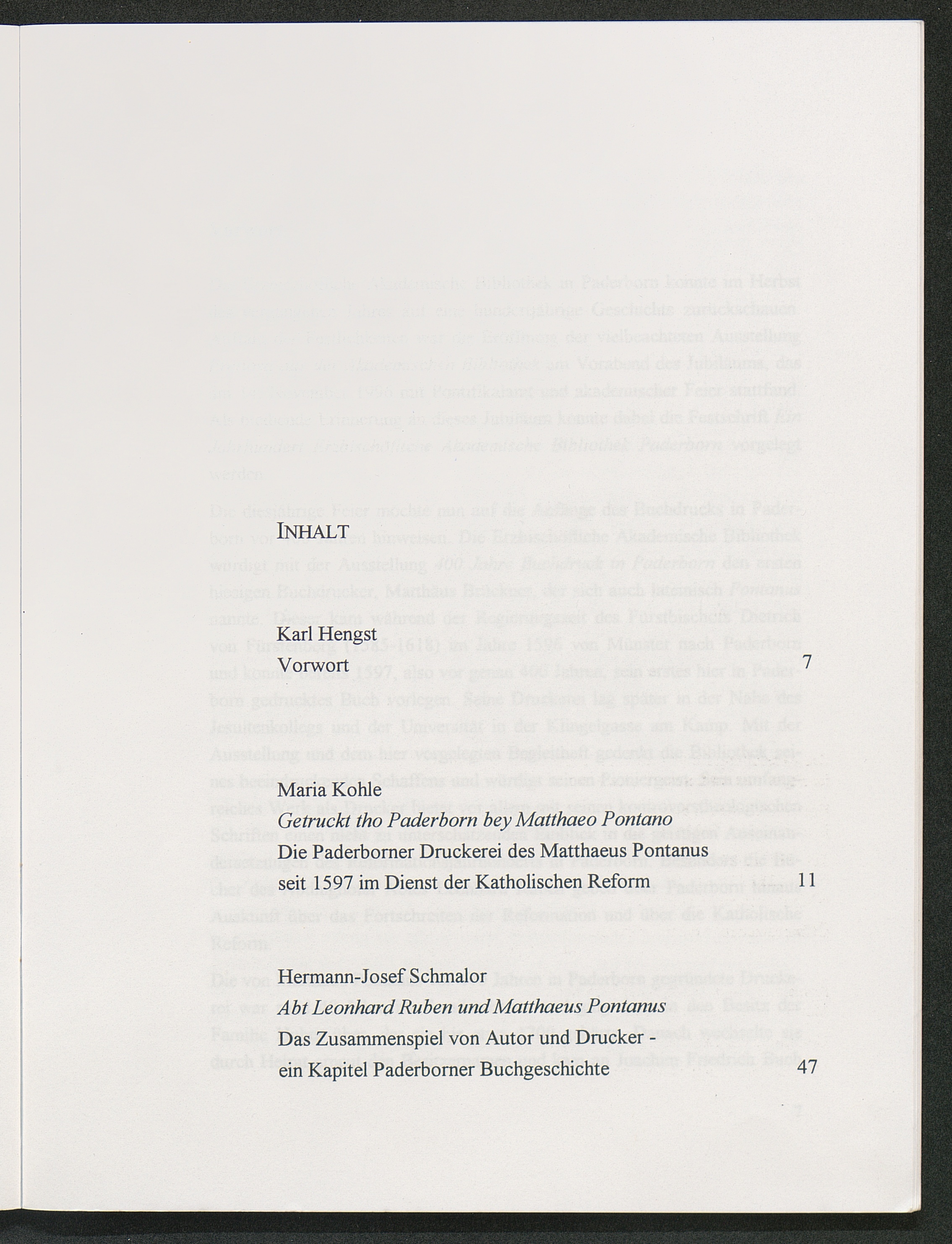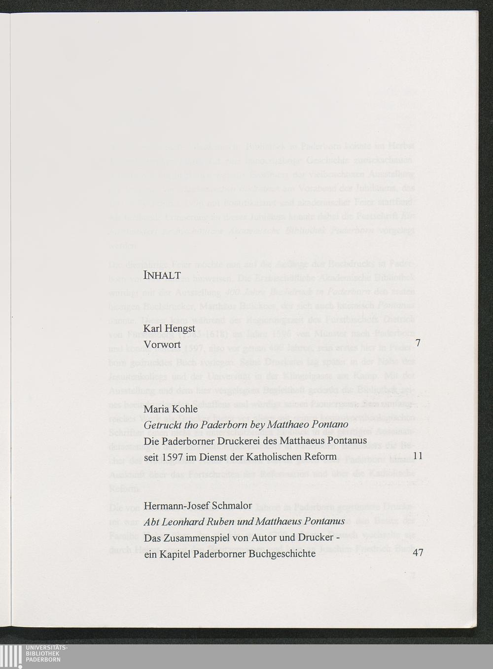 400 Jahre Buchdruck in Paderborn : 1597 - 1997 ; Begleitheft zur Ausstellung der Erzbischöflichen Akademischen Bibliothek Paderborn zum Gesamtwerk des ersten Druckers Matthäus Pontanus (Brückner) ; [die Ausstellung findet statt vom 25. April bis 23. Mai 1997 im Foyer und im Lesesaalbereich der Erzbischöflichen Akademischen Bibliothek Paderborn] / mit Beitr. von Maria Kohle ; Hermann-Josef Schmalor. Hrsg. von Karl Hengst