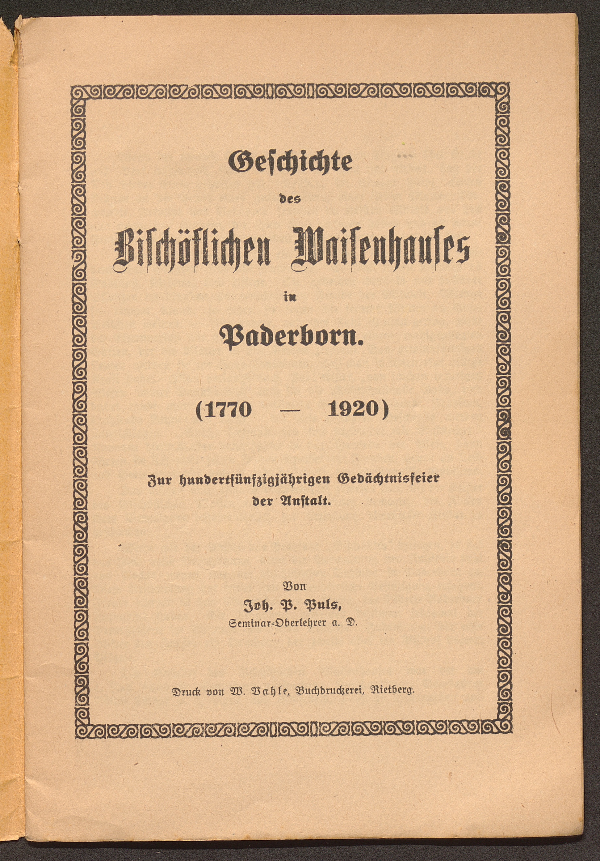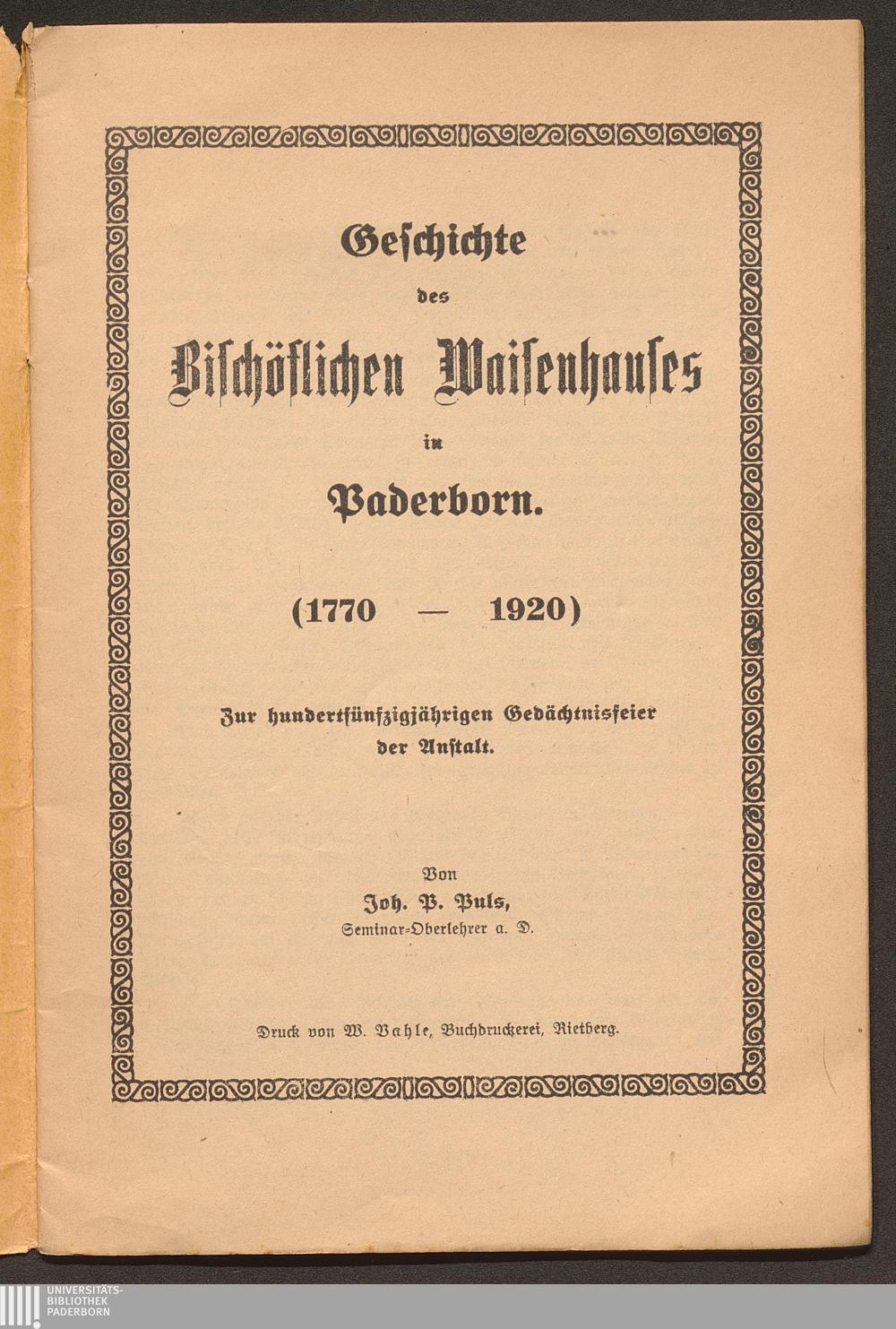 Geschichte des bischöflichen Waisenhauses in Paderborn : (1770 - 1920) ; zur hunderfünfzigjährigen Gedächtnisfeier der Anstalt / von Johann P. Puls