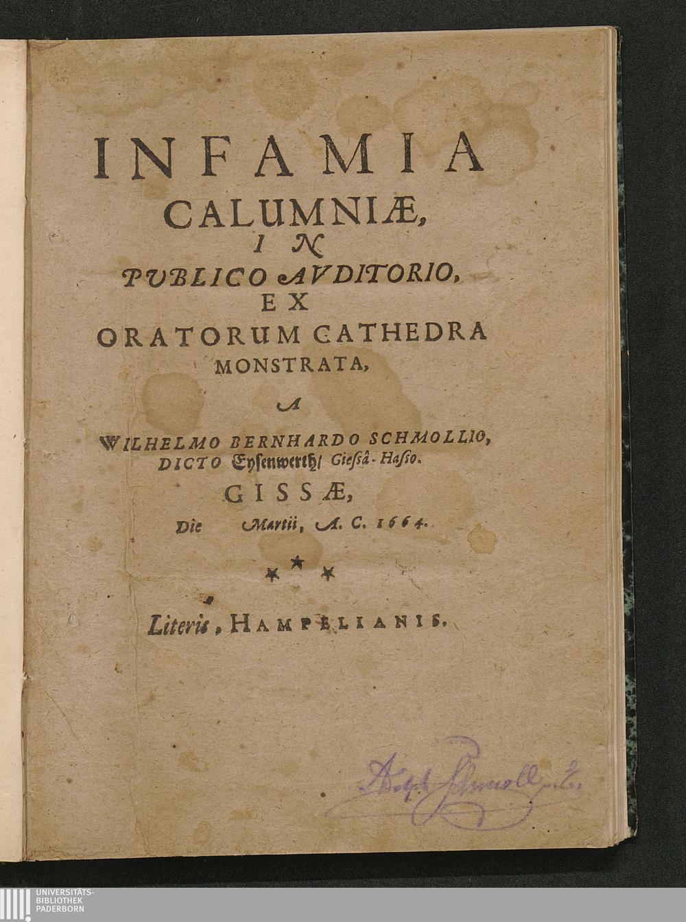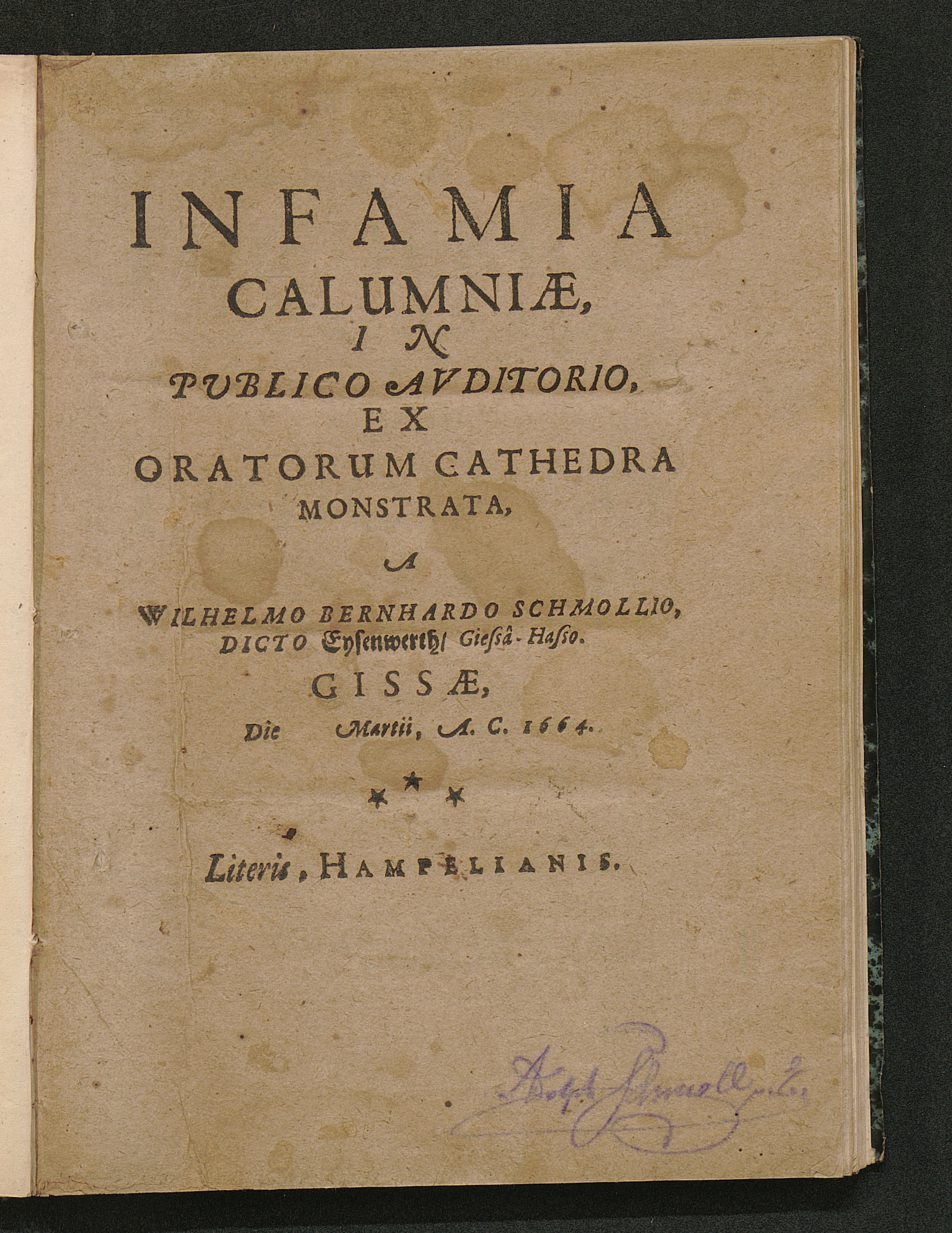 Infamia Calumniæ / In Publico Avditorio, Ex Oratorum Cathedra Monstrata, A Wilhelmo Bernhardo Schmollio, Dicto Eysenwerth/ Giessâ-Hasso. Gissæ, Die [...] Martii, A. C. 1664.