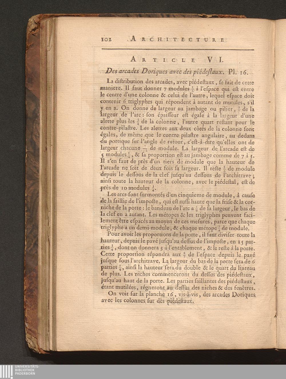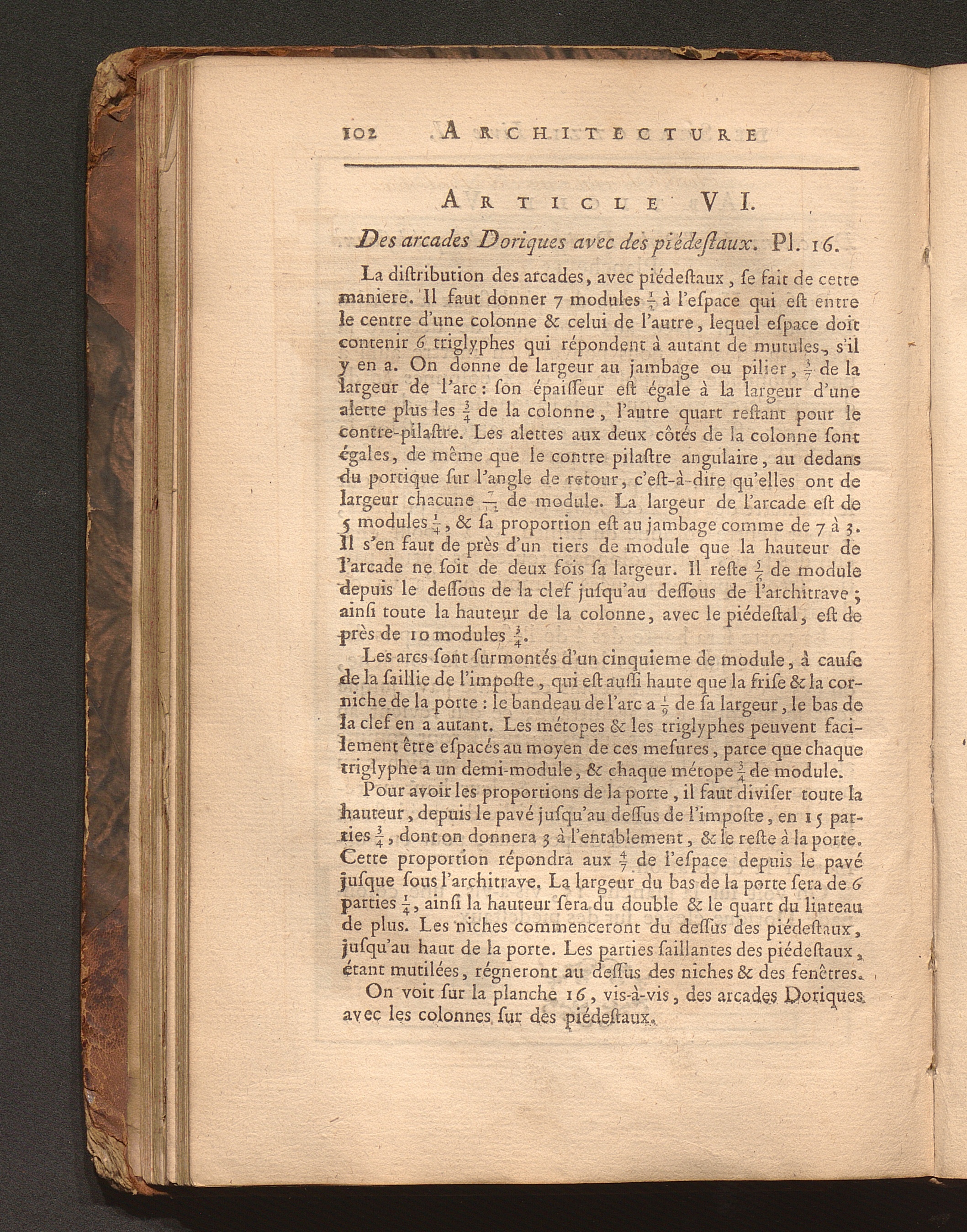 Art. VI. Des arcades Doriques avec des piédestaux.