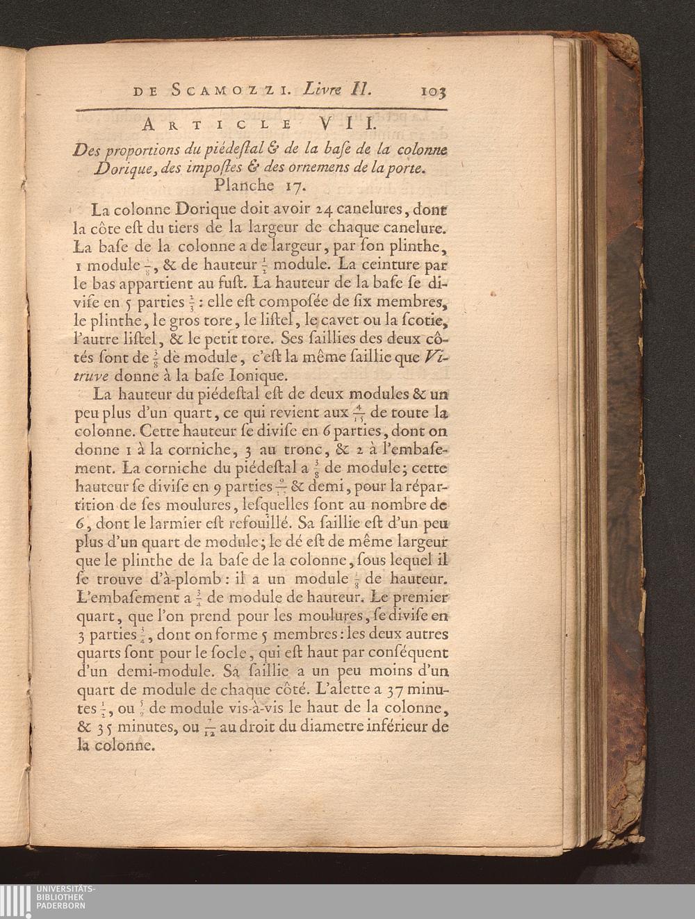 Art. VII. Des proportions du piédestal & de la base de la colonne Dorique, des impostes[...]