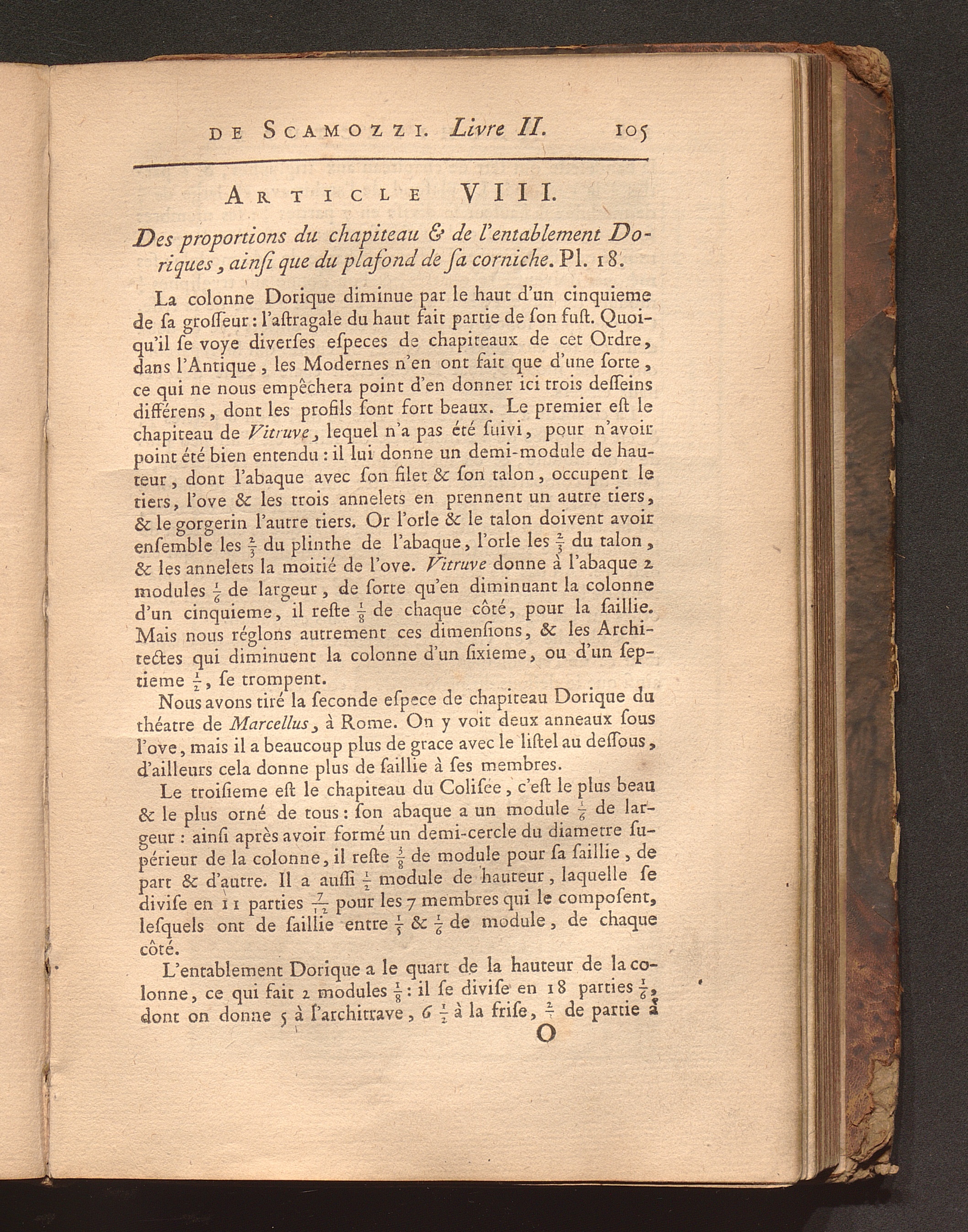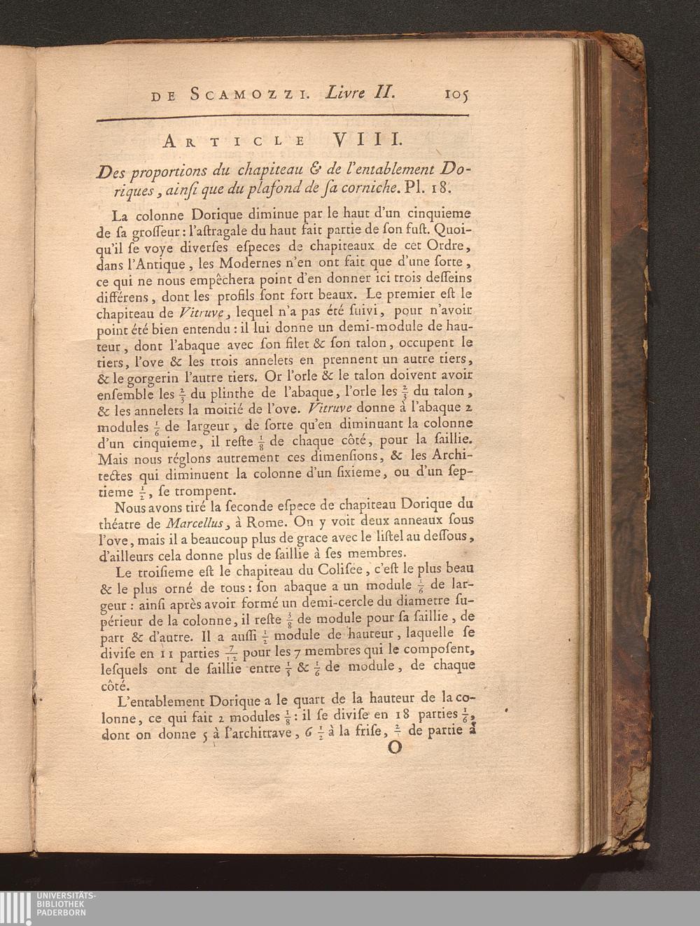 Art. VIII. Des proportions du chapiteau & de l'entablement Doriques, ainsi que du[...]