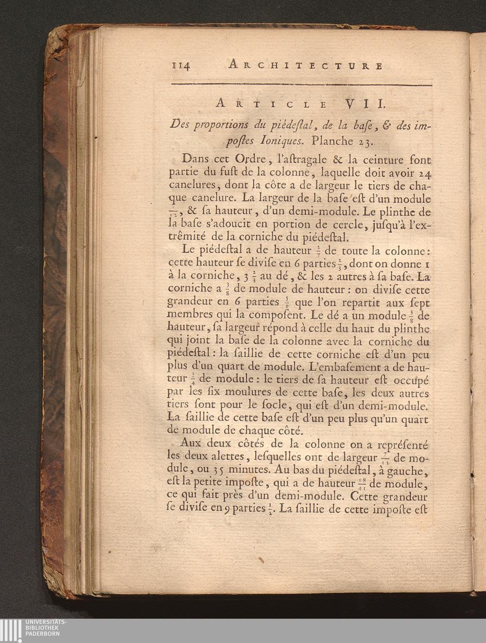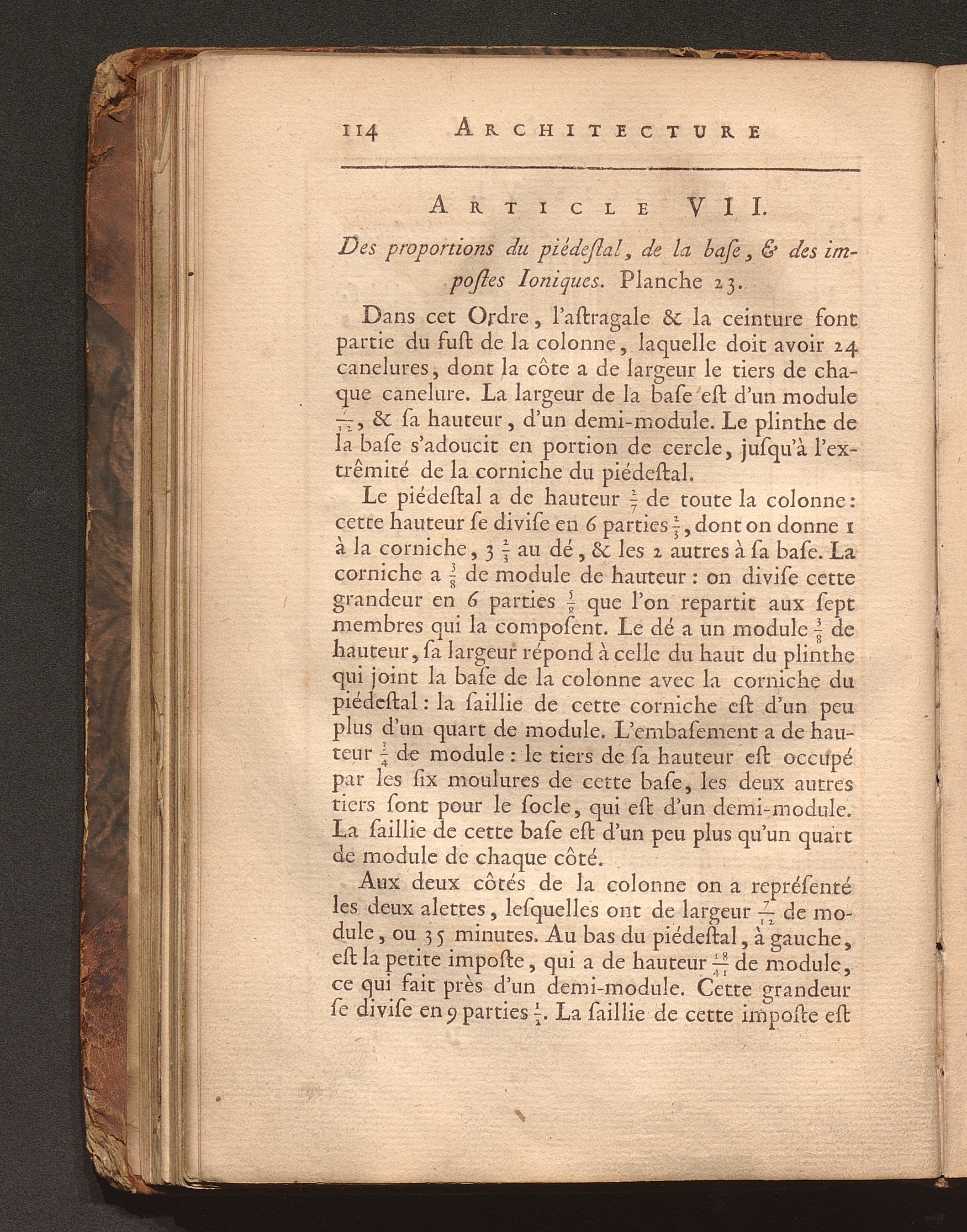 Art. VII. Des proportions du piédestal, de la base, & des impostes Ioniques.