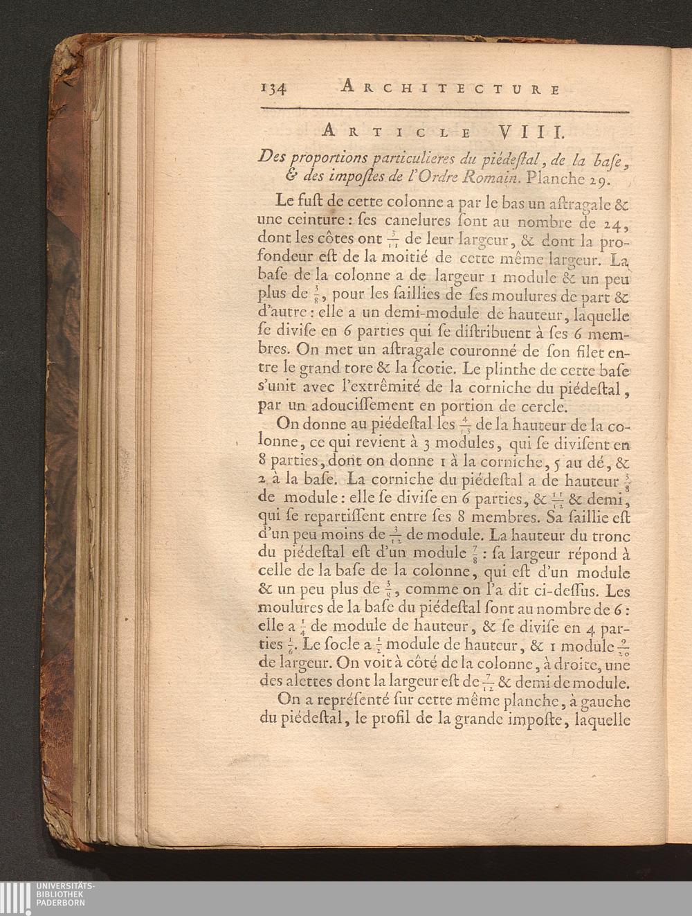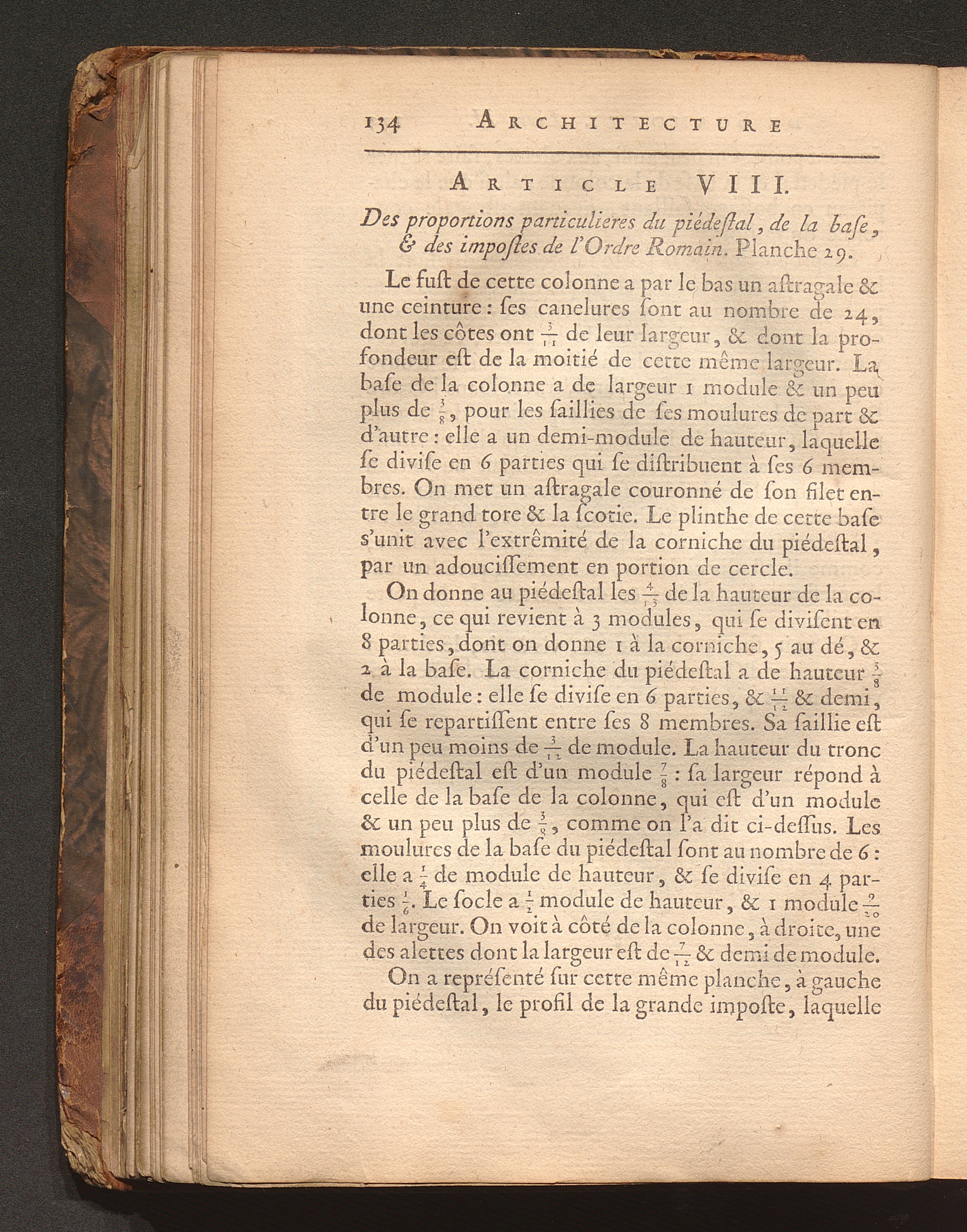 Art. VIII. Des proportions particulieres du piédestal, de la base, & des impostes[...]
