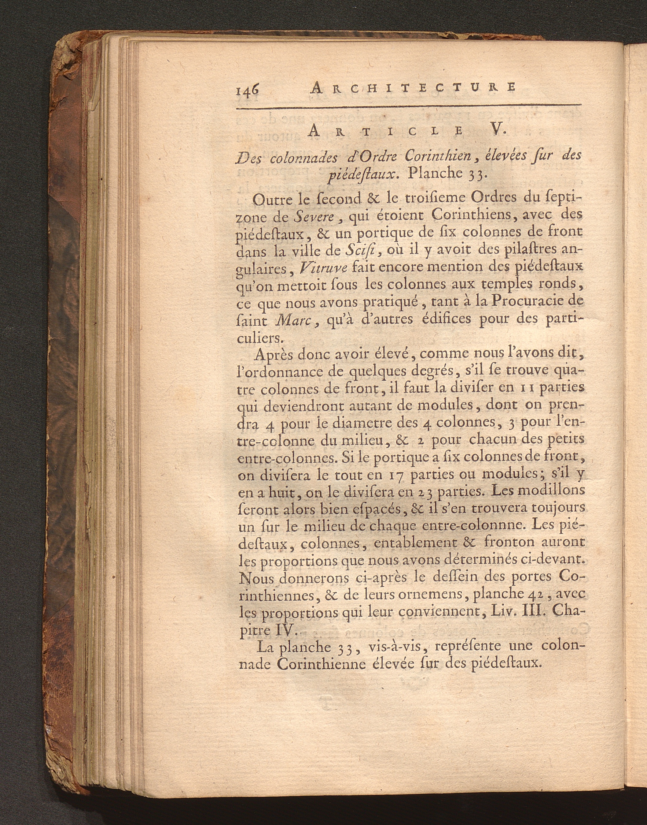 Art. V. Des colonnades d'Ordre Corinthien, élevées sur des piédestaux.