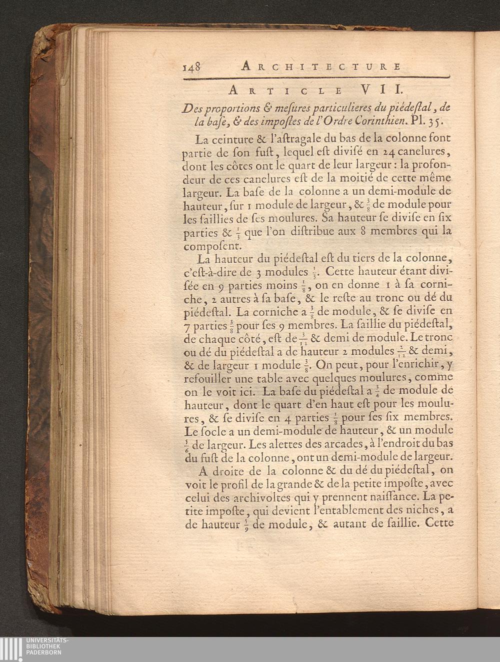 Art. VII. Des proportions & mesures particulieres du piédestal, de la base, & des[...]