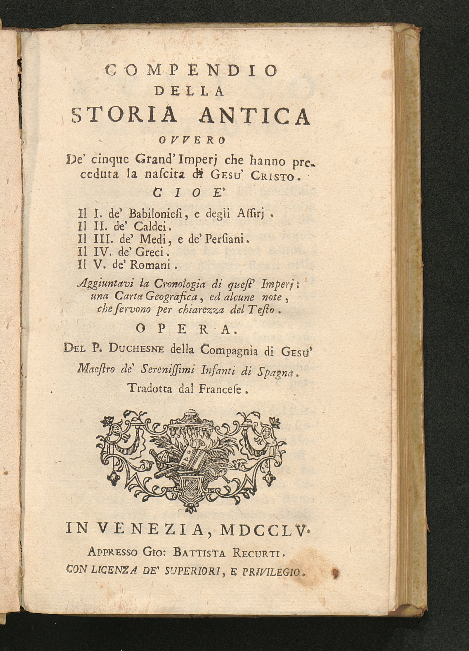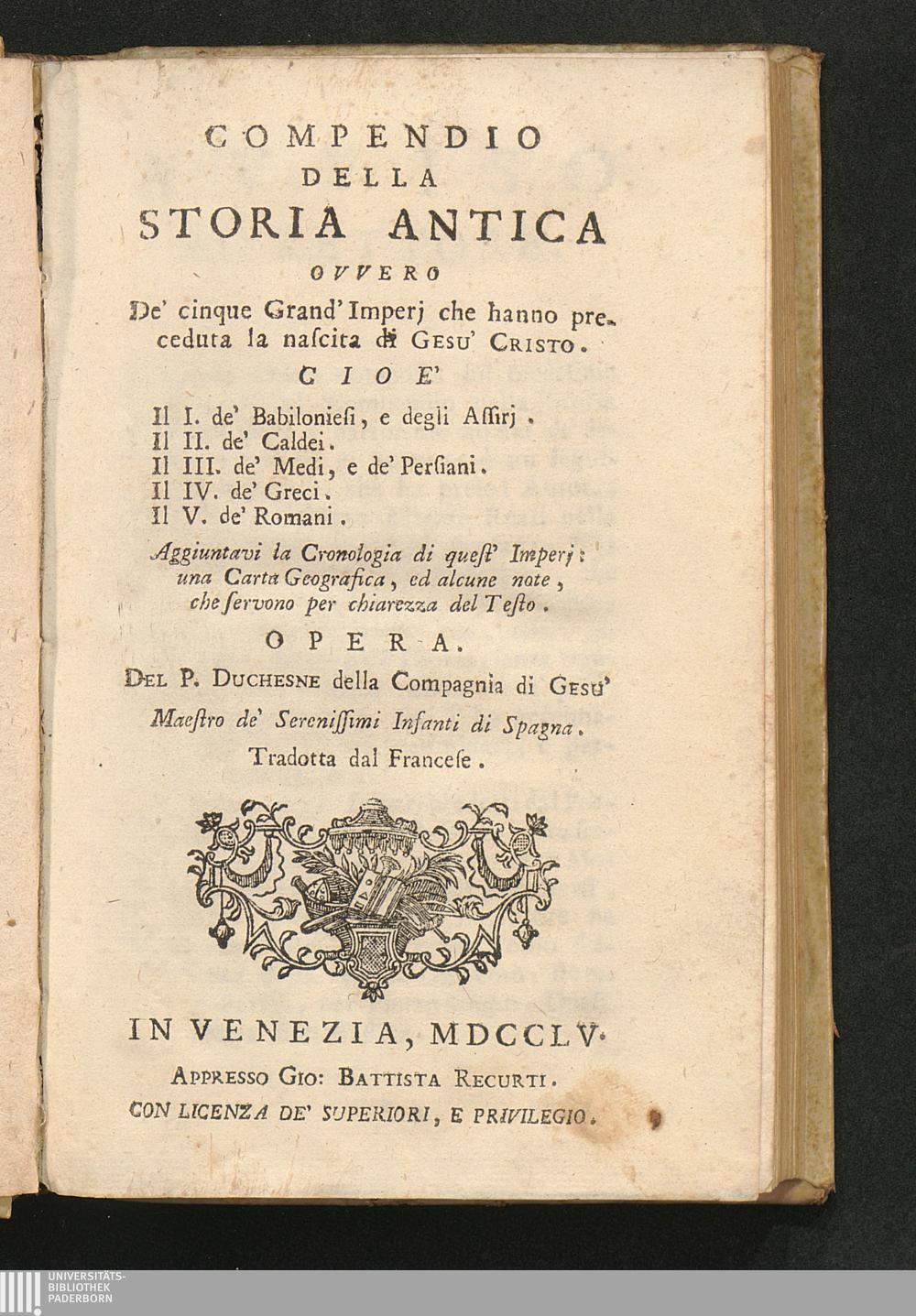 Compendio Della Storia Antica Ovvero Dè cinque Grand' Imperj che hanno preceduta la nascita di Gesù Cristo : Cioè Il I. dè Babiloniesi, e degli Assirj. Il II. dè Caldei. Il III. dè Medi, e dè Persiani. Il IV. dè Greci. Il V. dè Romani ; Aggiuntavi la Cronologia di quest' Imperj: una Carta Geografica, ed alcune note, che servono per chiarezza del Testo / Opera. Del P. Duchesne della Compagnia di Gesù Maestro dè Serenissimi Infanti di Spagna. Tradotta dal Francese