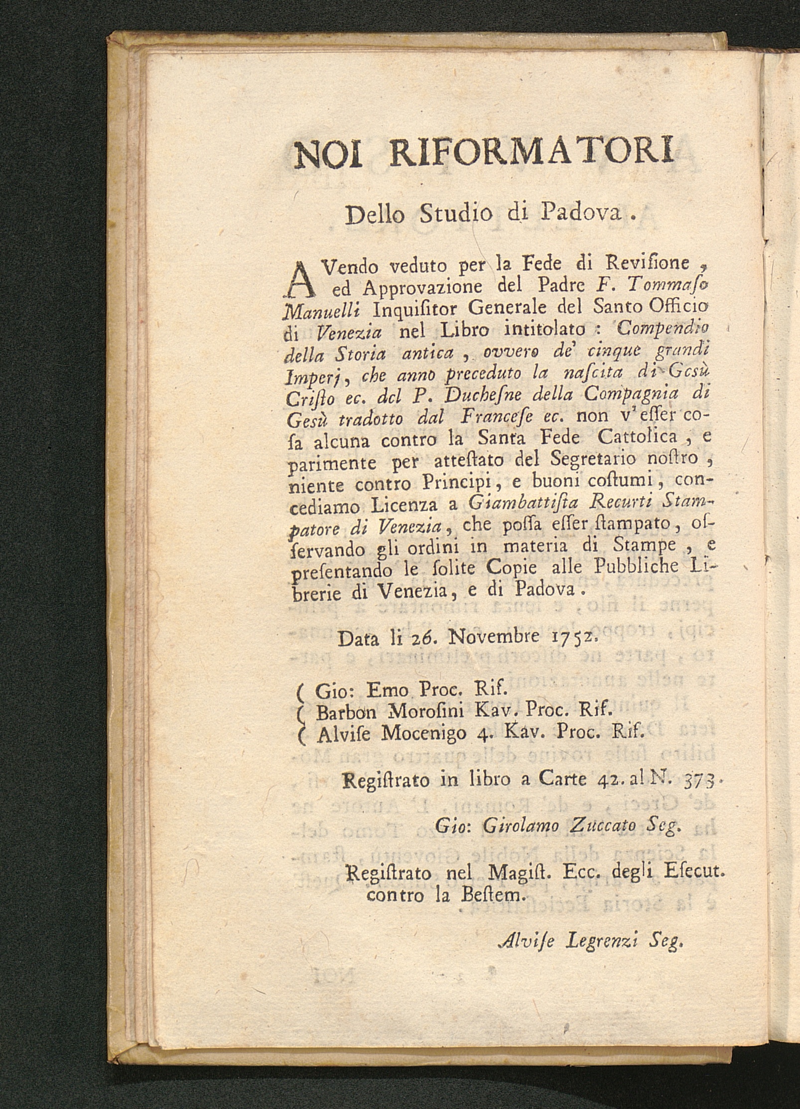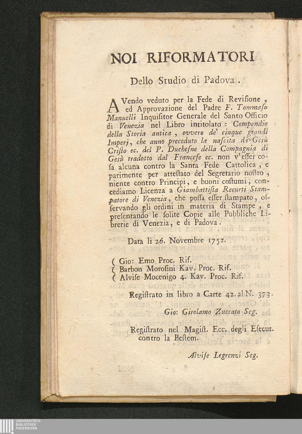 Compendio Della Storia Antica Ovvero Dè cinque Grand' Imperj che hanno preceduta la nascita di Gesù Cristo : Cioè Il I. dè Babiloniesi, e degli Assirj. Il II. dè Caldei. Il III. dè Medi, e dè Persiani. Il IV. dè Greci. Il V. dè Romani ; Aggiuntavi la Cronologia di quest' Imperj: una Carta Geografica, ed alcune note, che servono per chiarezza del Testo / Opera. Del P. Duchesne della Compagnia di Gesù Maestro dè Serenissimi Infanti di Spagna. Tradotta dal Francese