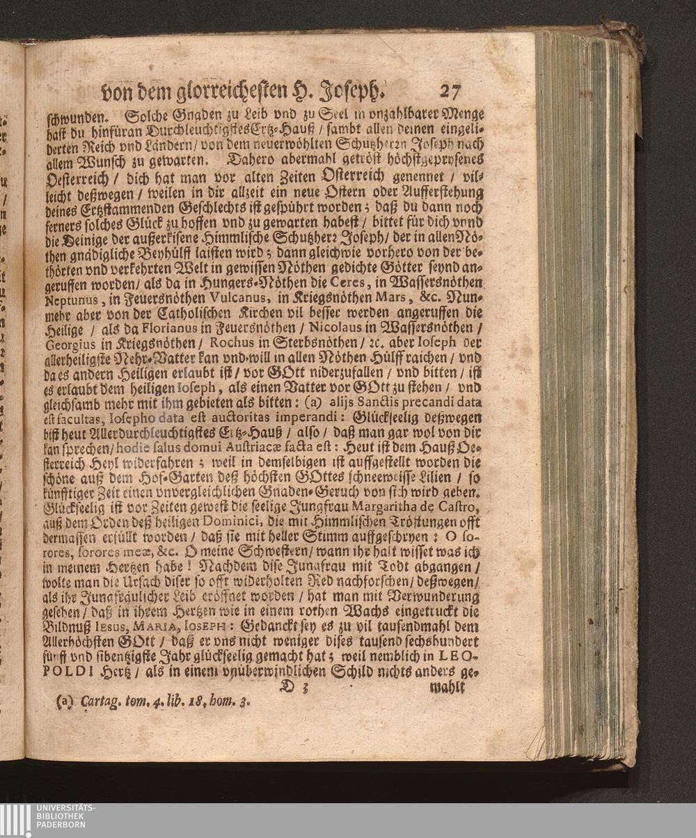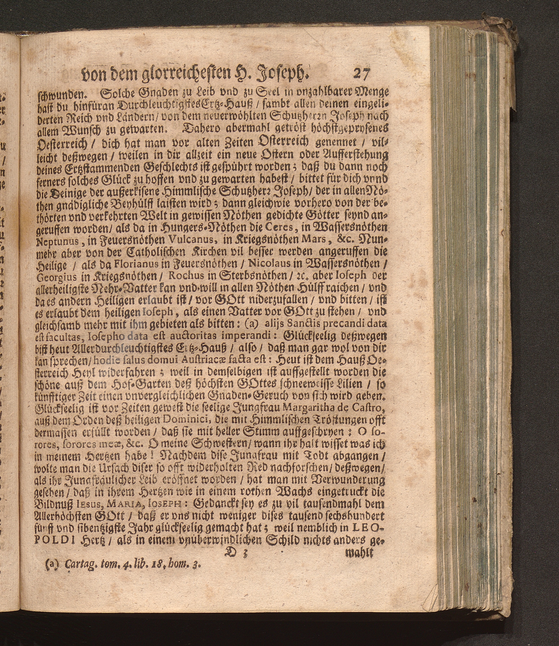 Neuerwöhlte Paradeyß-Blum/ Von dem Allerdurchleuchtigsten Ertz-Hauß Oesterreich/ vnd dessen allgehörigen Erb-Cronen vnd Provintzen/ [et]c. Das ist: Danckbarliche Lob- vnd Lieb-Verfassung von dem glorreichesten H. Joseph. Welcher hochvermögende Trost-volle Ehr- vnd Nehr-Vatter Christi für einen allgemainen Patronen vnd Schutz-Herrn mit hochfeyerlicher Solennitet vnd gröstem Eyffer/ so wol beeder Kayserl. Majest. als deß häuffig versambleten hohen Adels/ wie auch deß Geistreichen Cleri, &c. ist offentlich an- vnd auffgenomen worden den 12. Tag May/ 1675 / Jn Truck verfertiget/ Durch Pr. Fr. Abraham à S. Clara, Augustiner Baarfüsser/ [et]c.