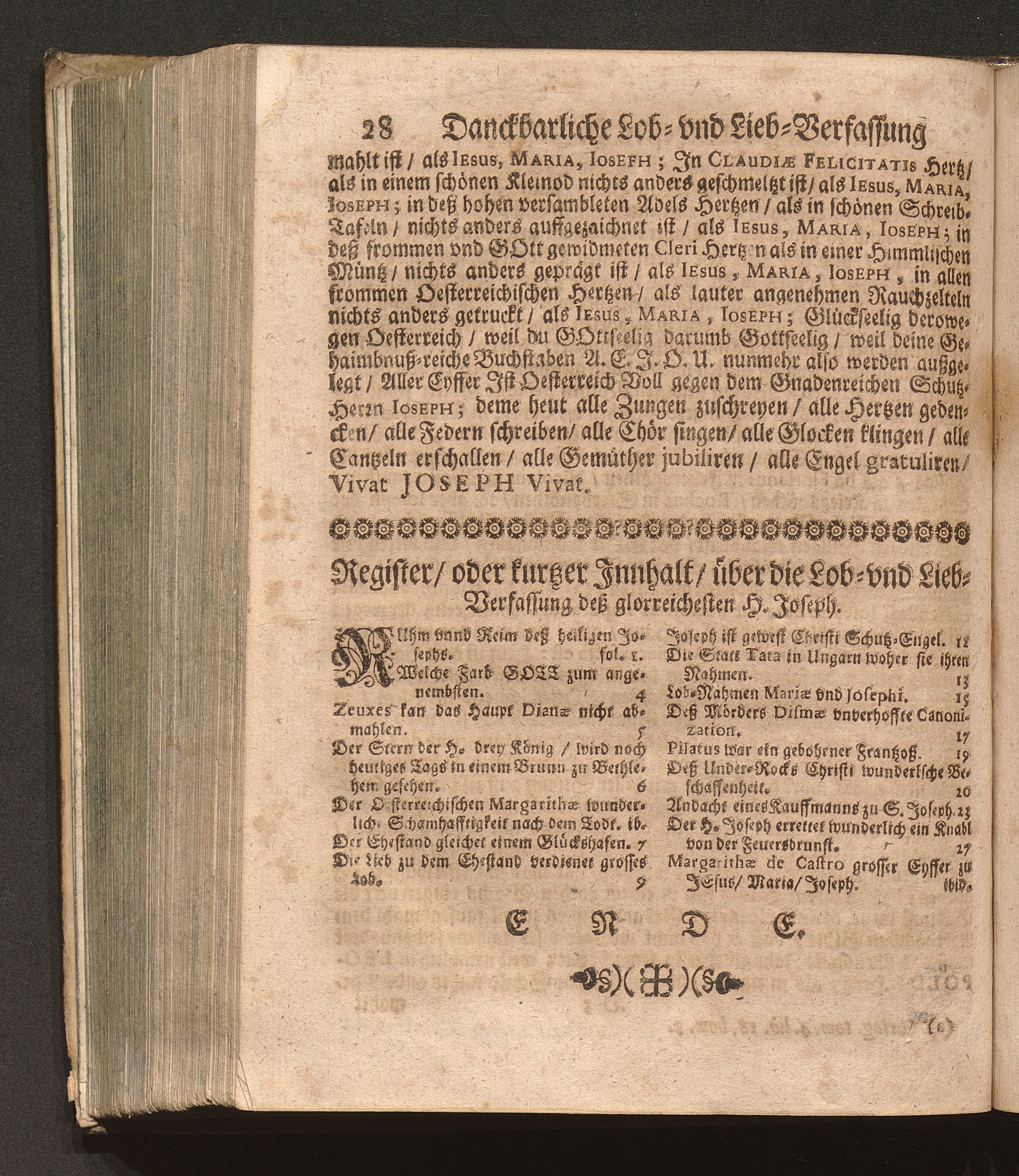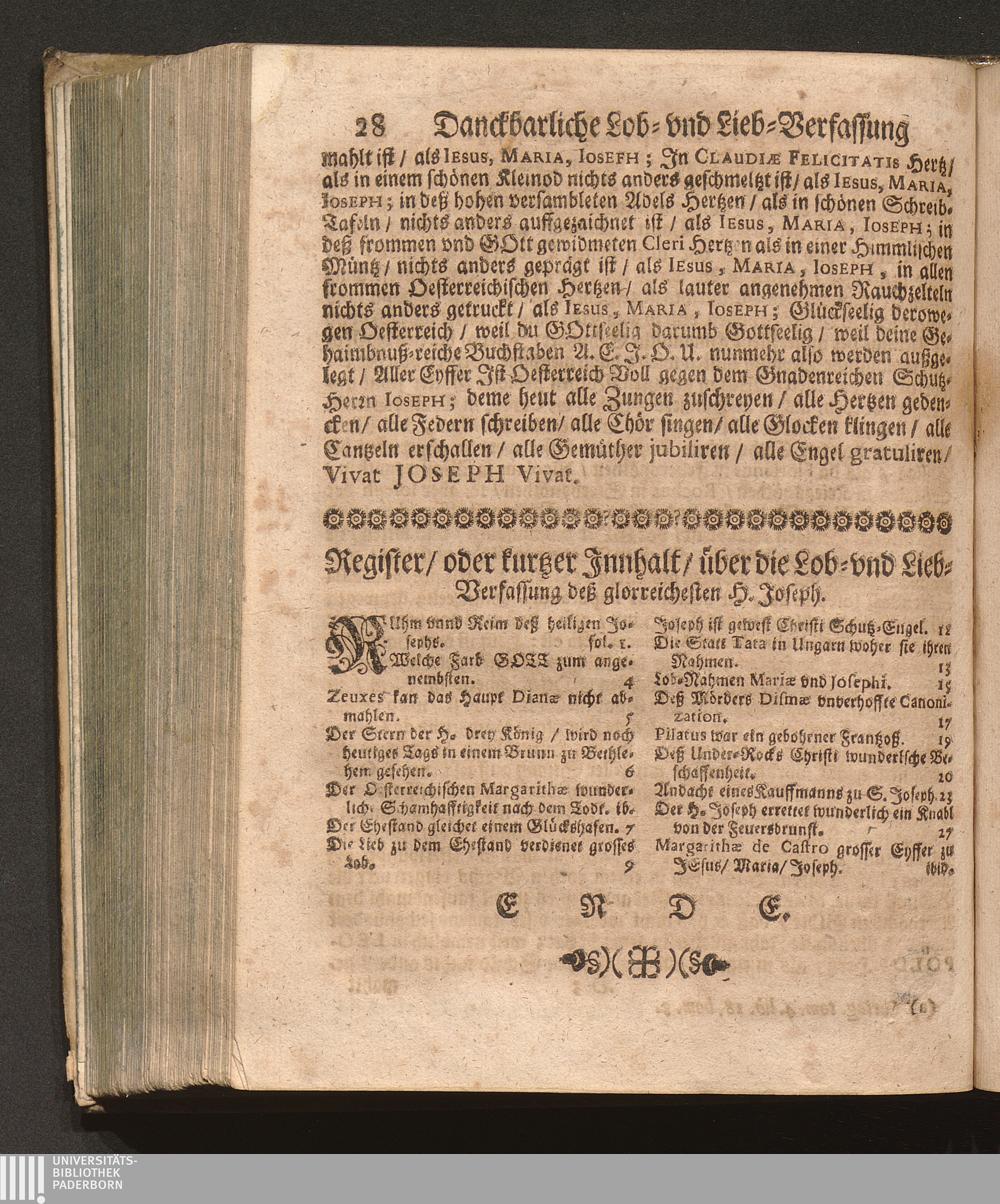 Neuerwöhlte Paradeyß-Blum/ Von dem Allerdurchleuchtigsten Ertz-Hauß Oesterreich/ vnd dessen allgehörigen Erb-Cronen vnd Provintzen/ [et]c. Das ist: Danckbarliche Lob- vnd Lieb-Verfassung von dem glorreichesten H. Joseph. Welcher hochvermögende Trost-volle Ehr- vnd Nehr-Vatter Christi für einen allgemainen Patronen vnd Schutz-Herrn mit hochfeyerlicher Solennitet vnd gröstem Eyffer/ so wol beeder Kayserl. Majest. als deß häuffig versambleten hohen Adels/ wie auch deß Geistreichen Cleri, &c. ist offentlich an- vnd auffgenomen worden den 12. Tag May/ 1675 / Jn Truck verfertiget/ Durch Pr. Fr. Abraham à S. Clara, Augustiner Baarfüsser/ [et]c.