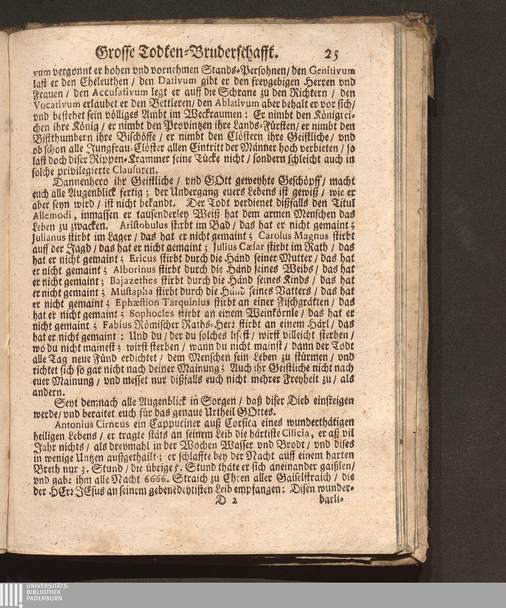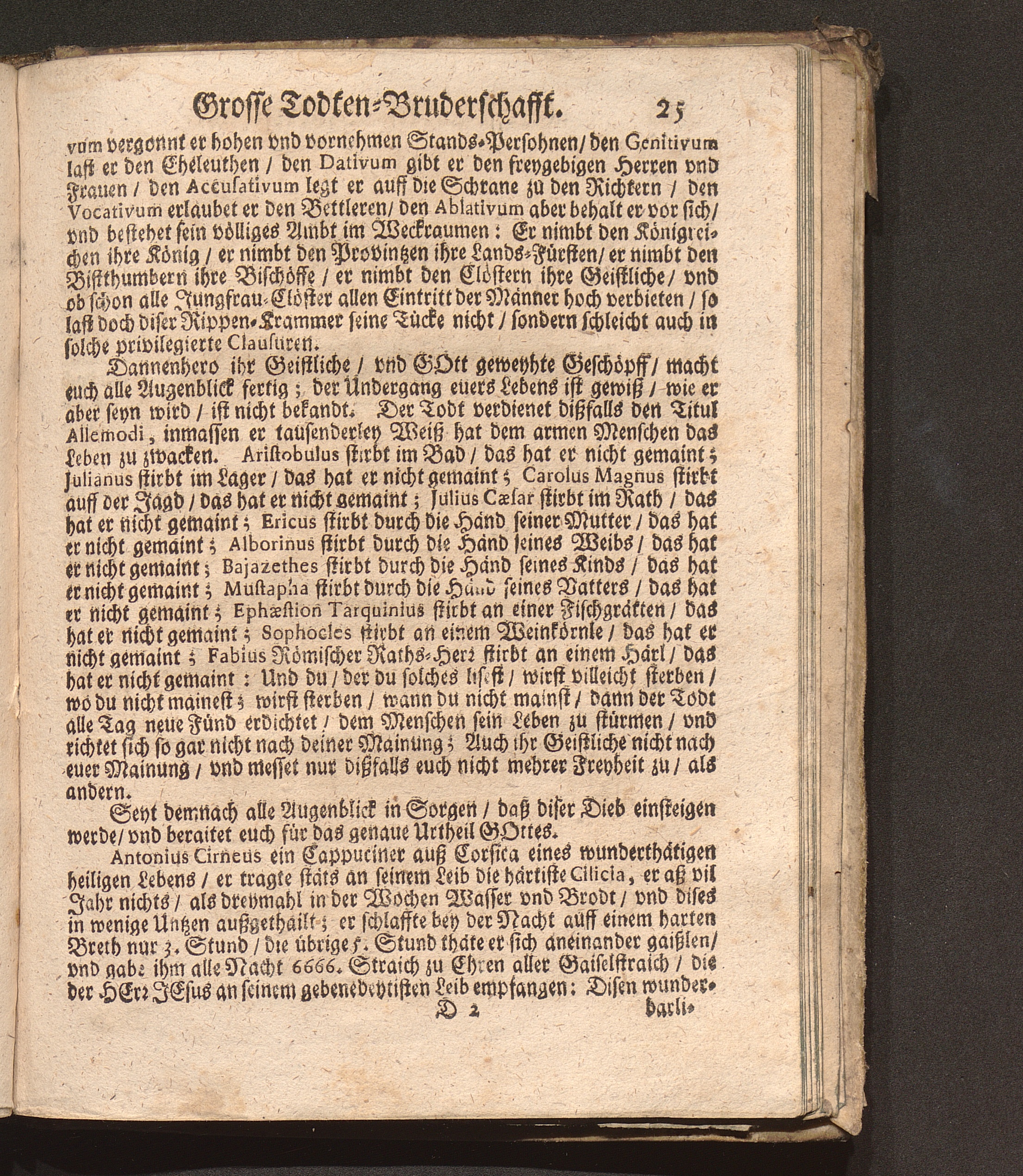 Grosse Todten-Bruderschafft/ Das ist: Ein kurtzer Entwurff Deß Sterblichen Lebens / Zusammen gesetzt Durch P. Abraham, Augustiner Baarfüsser/ Kayserlicher Prediger/ vnd dazumahl Prior/ [et]c.