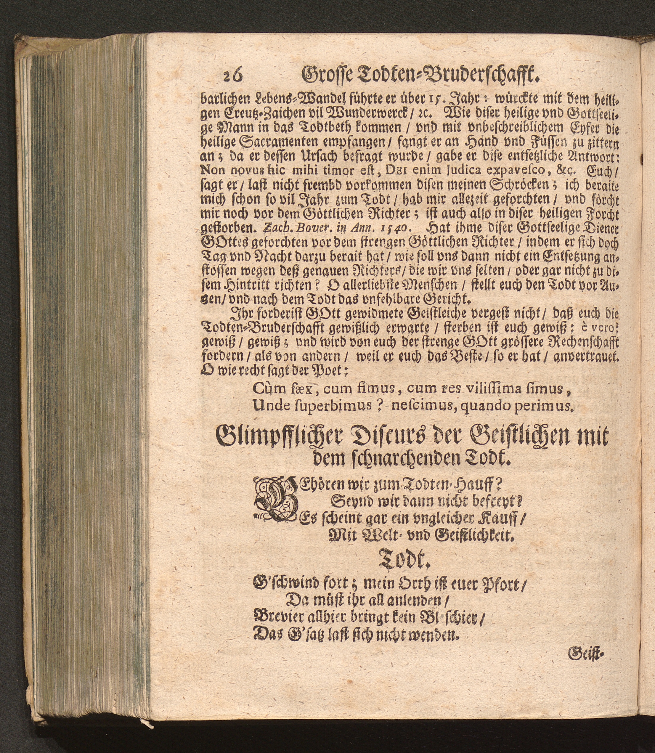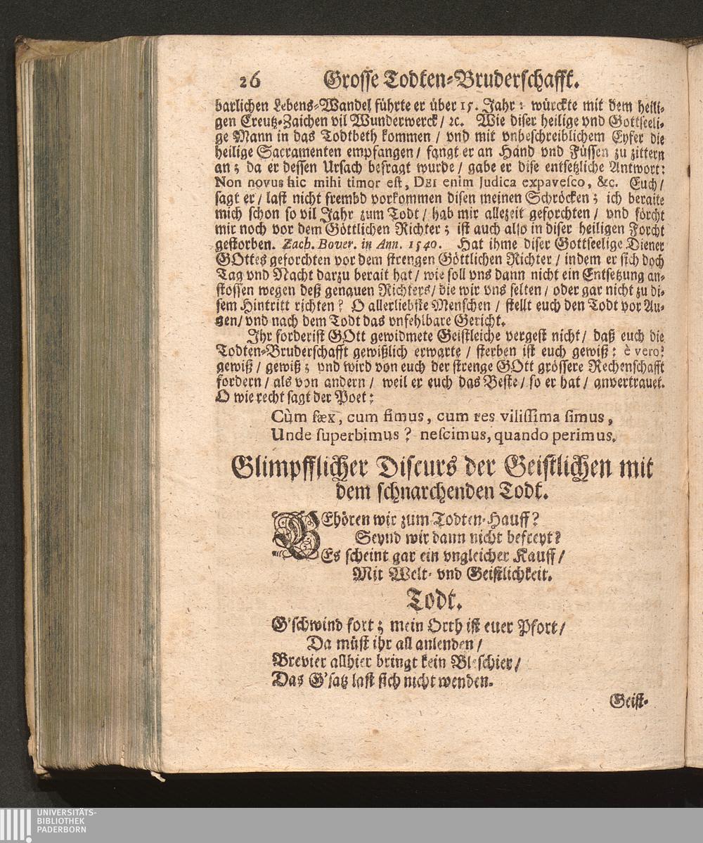 Grosse Todten-Bruderschafft/ Das ist: Ein kurtzer Entwurff Deß Sterblichen Lebens / Zusammen gesetzt Durch P. Abraham, Augustiner Baarfüsser/ Kayserlicher Prediger/ vnd dazumahl Prior/ [et]c.