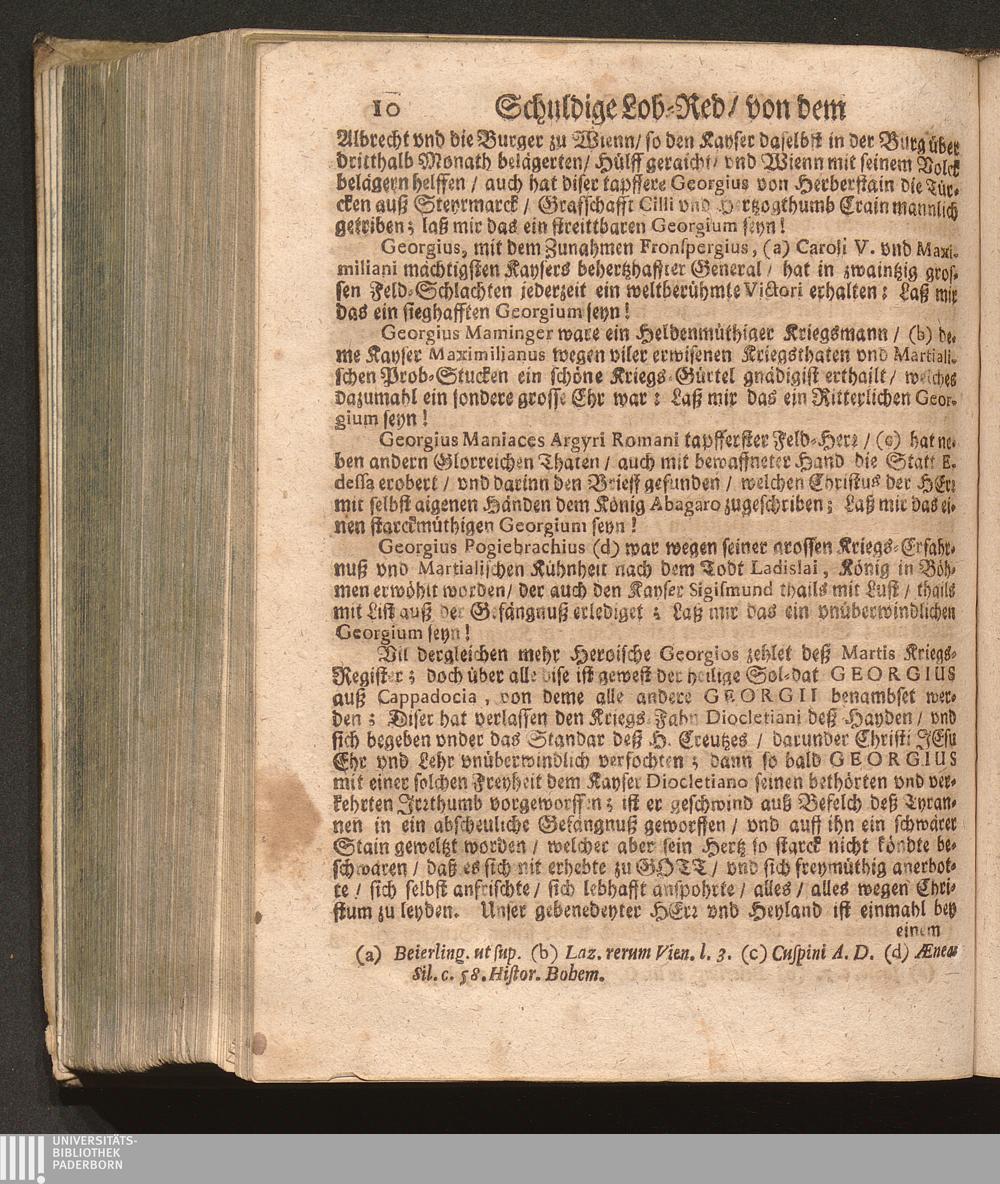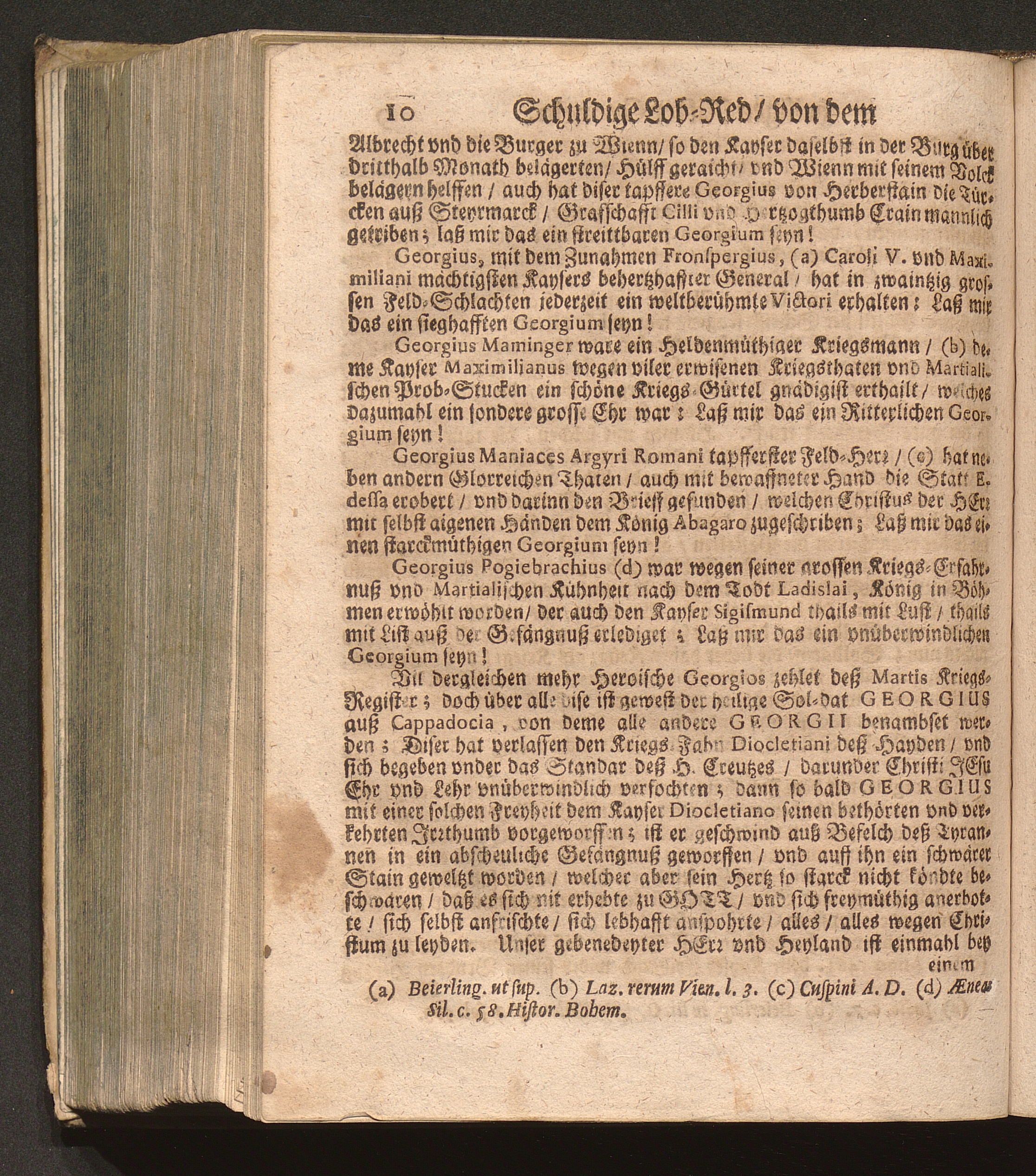 Soldaten-Glory/ Das ist: Von dem heiligen Ritter Und Haylsamen Vorbitter Georgio Schuldige Lob-Red : Welche An seinem Jährlichen Fest-Tag in dem Freysinger-Hof mitten in der Kayserlichen Residentz-Statt Wienn/ vor einem Volckreichen Auditorio, vnder dem freyen Himmel/ hoffentlich aber nicht im Lufft gesagt worden/ Und nunmehr in Truck verfertiget / Durch P. Fr. Abraham à S. Clara, Augustiner Baarfüsser/ [et]c.