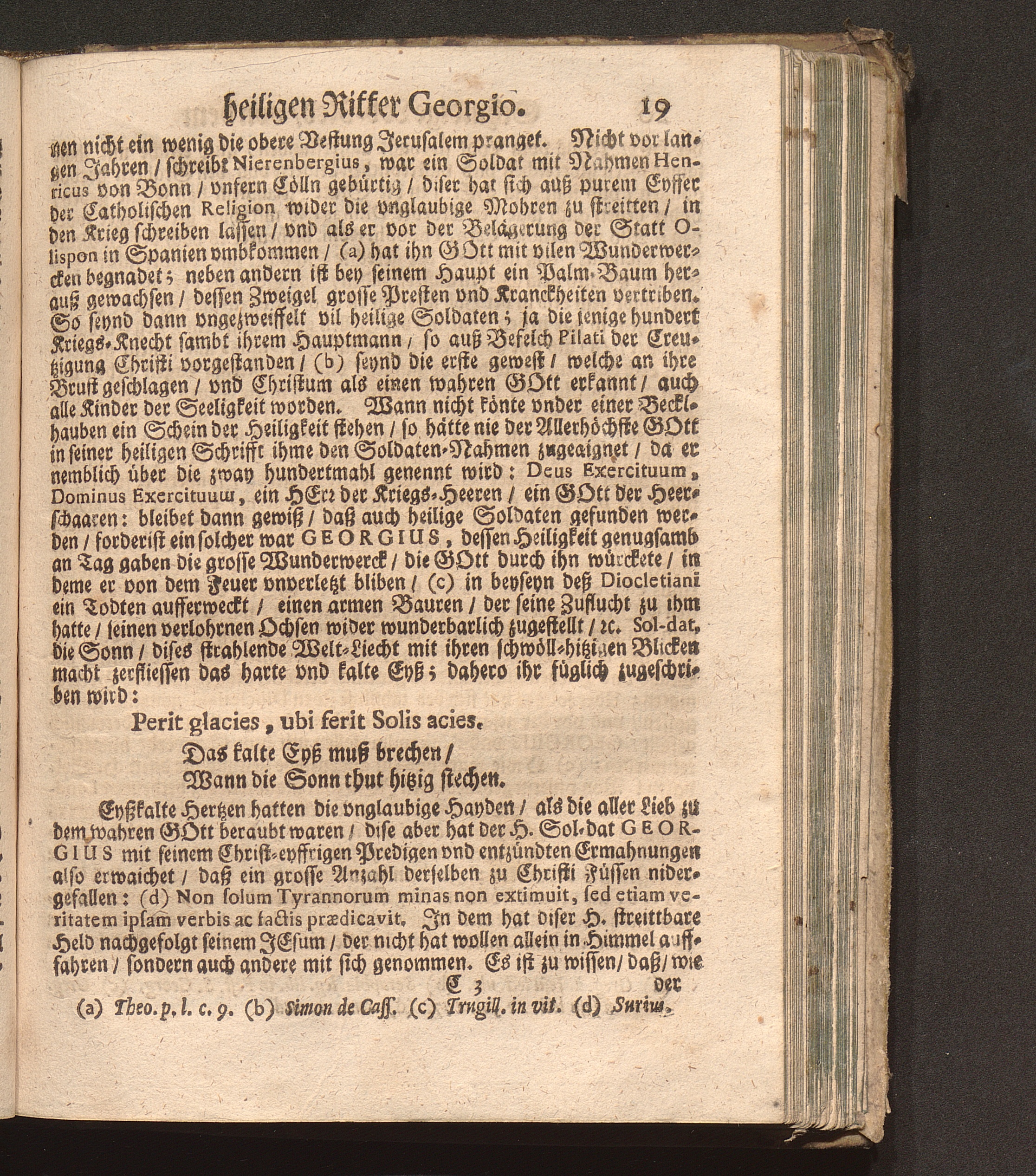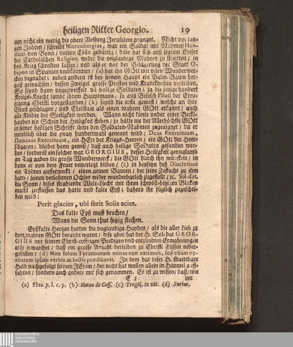 Soldaten-Glory/ Das ist: Von dem heiligen Ritter Und Haylsamen Vorbitter Georgio Schuldige Lob-Red : Welche An seinem Jährlichen Fest-Tag in dem Freysinger-Hof mitten in der Kayserlichen Residentz-Statt Wienn/ vor einem Volckreichen Auditorio, vnder dem freyen Himmel/ hoffentlich aber nicht im Lufft gesagt worden/ Und nunmehr in Truck verfertiget / Durch P. Fr. Abraham à S. Clara, Augustiner Baarfüsser/ [et]c.