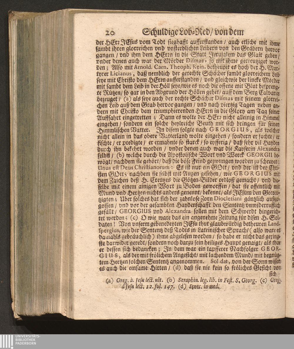 Soldaten-Glory/ Das ist: Von dem heiligen Ritter Und Haylsamen Vorbitter Georgio Schuldige Lob-Red : Welche An seinem Jährlichen Fest-Tag in dem Freysinger-Hof mitten in der Kayserlichen Residentz-Statt Wienn/ vor einem Volckreichen Auditorio, vnder dem freyen Himmel/ hoffentlich aber nicht im Lufft gesagt worden/ Und nunmehr in Truck verfertiget / Durch P. Fr. Abraham à S. Clara, Augustiner Baarfüsser/ [et]c.