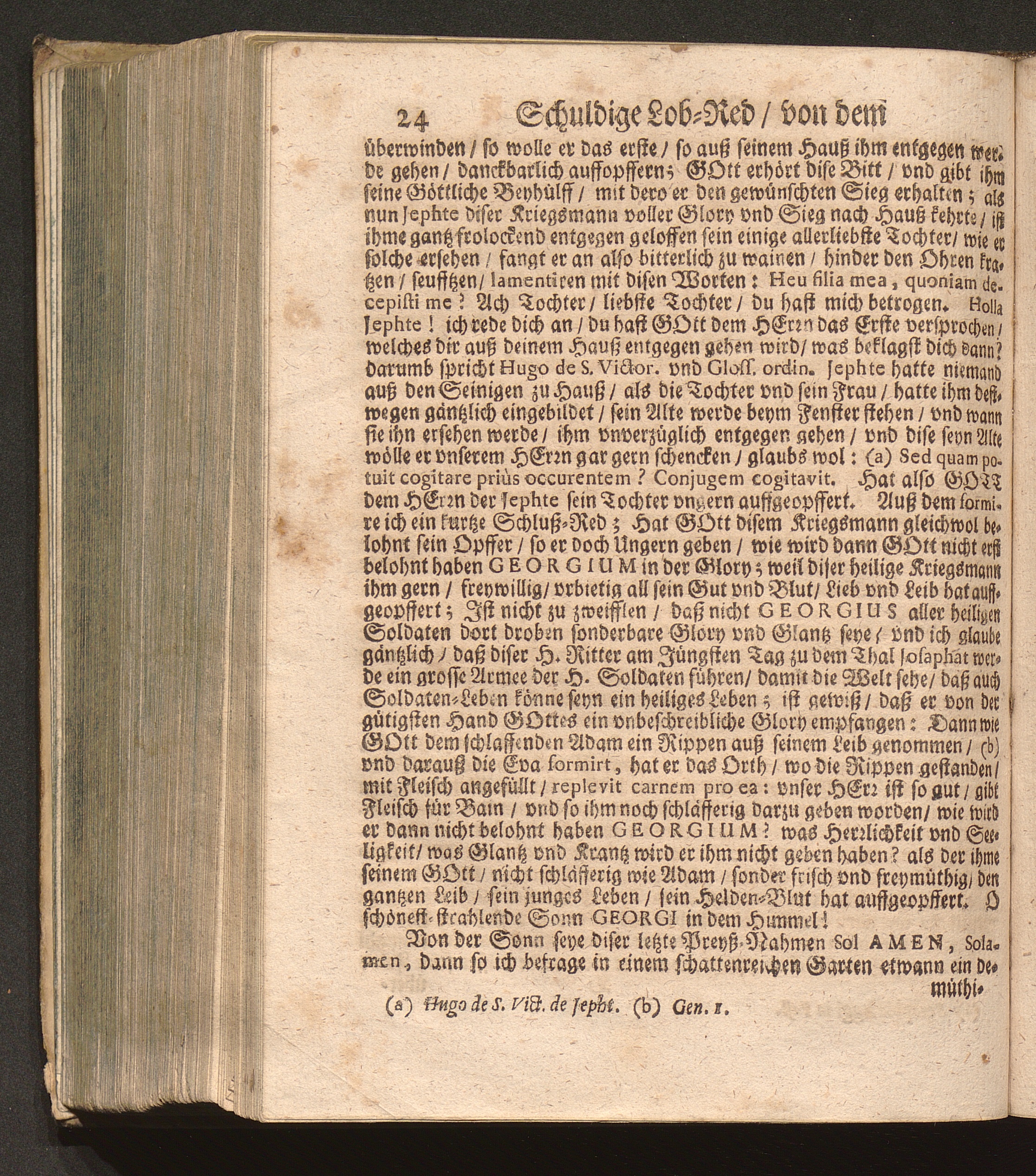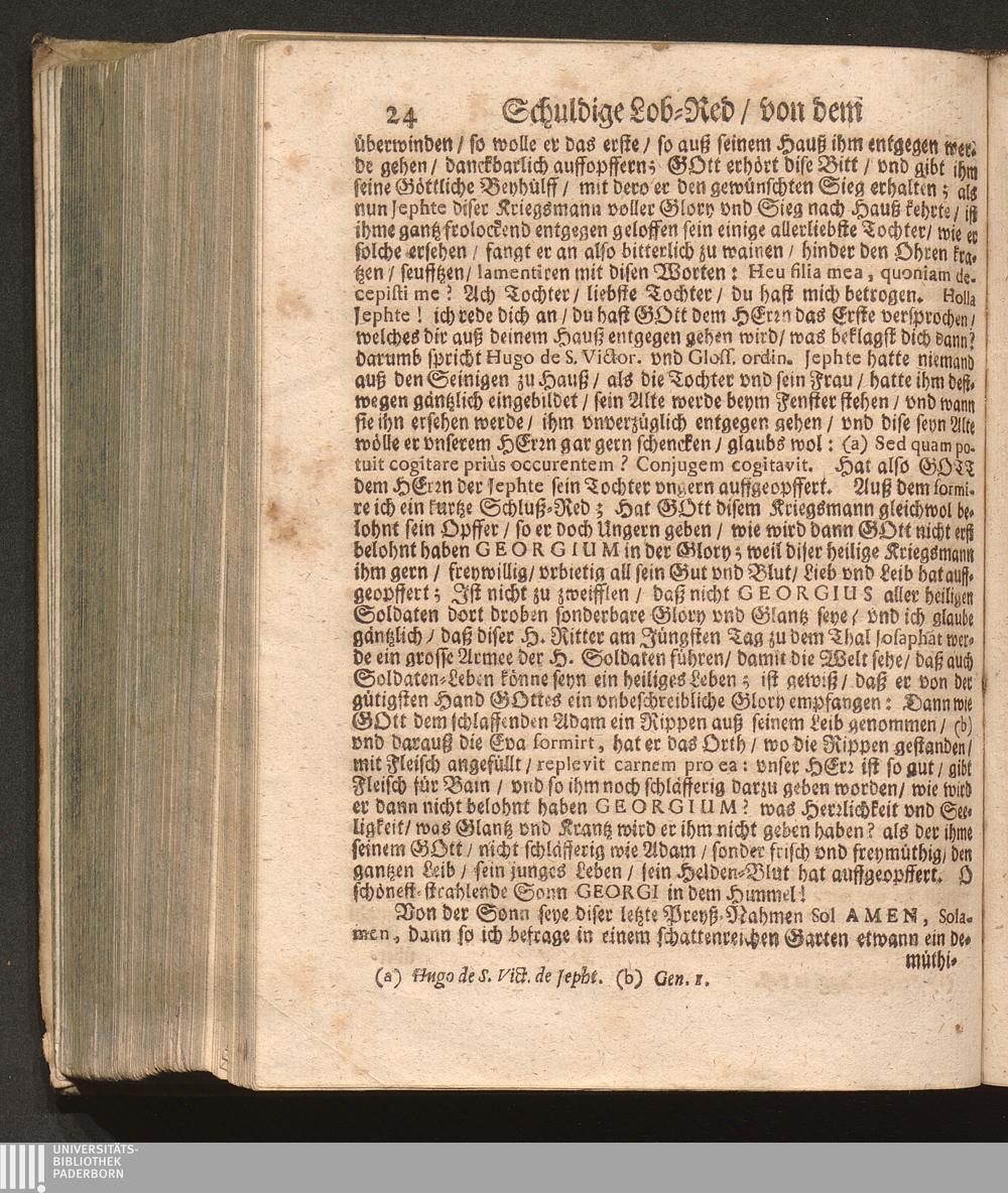 Soldaten-Glory/ Das ist: Von dem heiligen Ritter Und Haylsamen Vorbitter Georgio Schuldige Lob-Red : Welche An seinem Jährlichen Fest-Tag in dem Freysinger-Hof mitten in der Kayserlichen Residentz-Statt Wienn/ vor einem Volckreichen Auditorio, vnder dem freyen Himmel/ hoffentlich aber nicht im Lufft gesagt worden/ Und nunmehr in Truck verfertiget / Durch P. Fr. Abraham à S. Clara, Augustiner Baarfüsser/ [et]c.