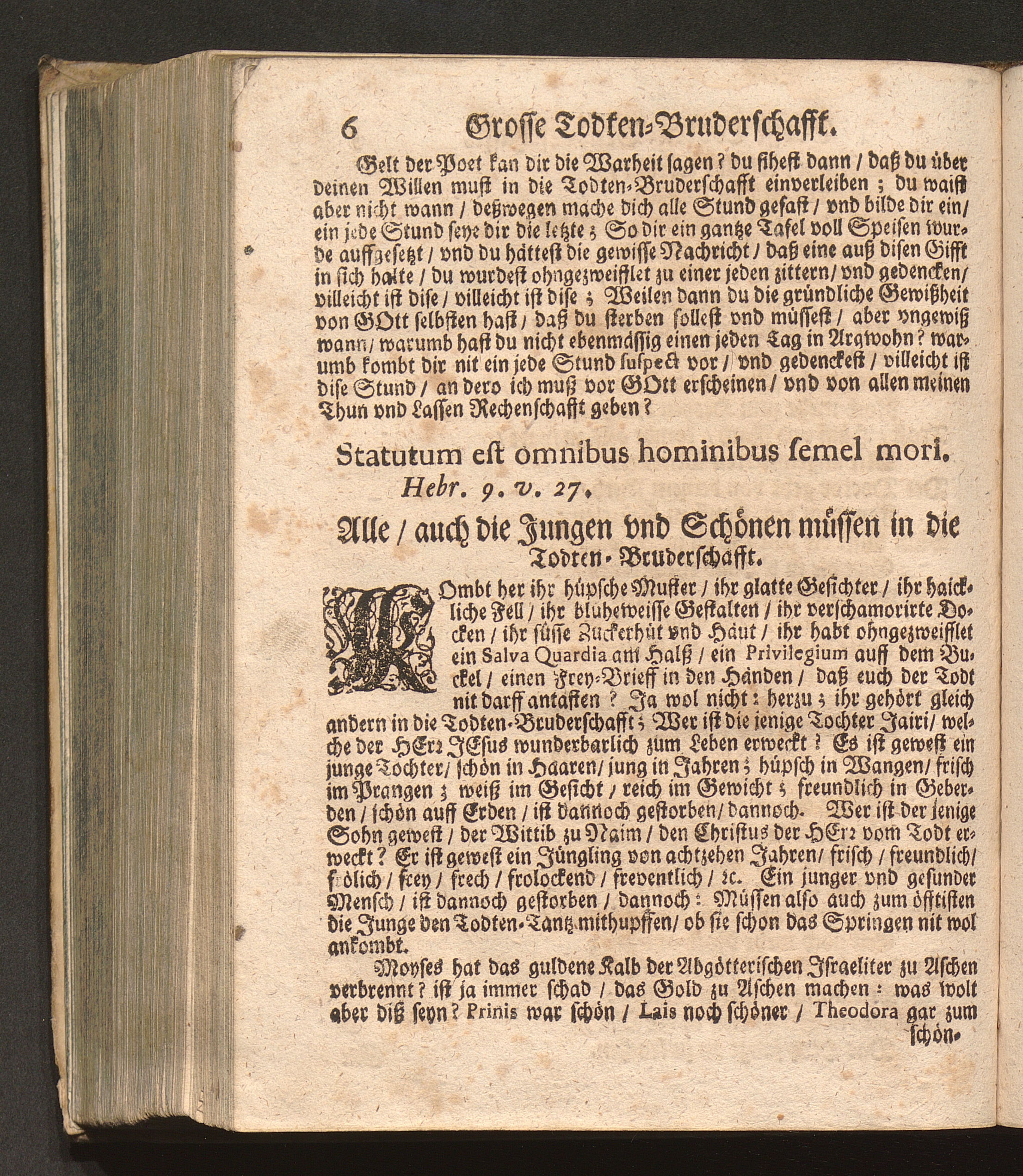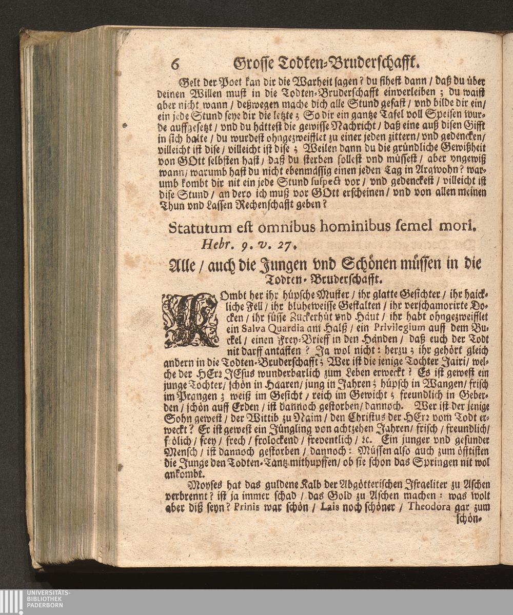 Grosse Todten-Bruderschafft/ Das ist: Ein kurtzer Entwurff Deß Sterblichen Lebens / Zusammen gesetzt Durch P. Abraham, Augustiner Baarfüsser/ Kayserlicher Prediger/ vnd dazumahl Prior/ [et]c.