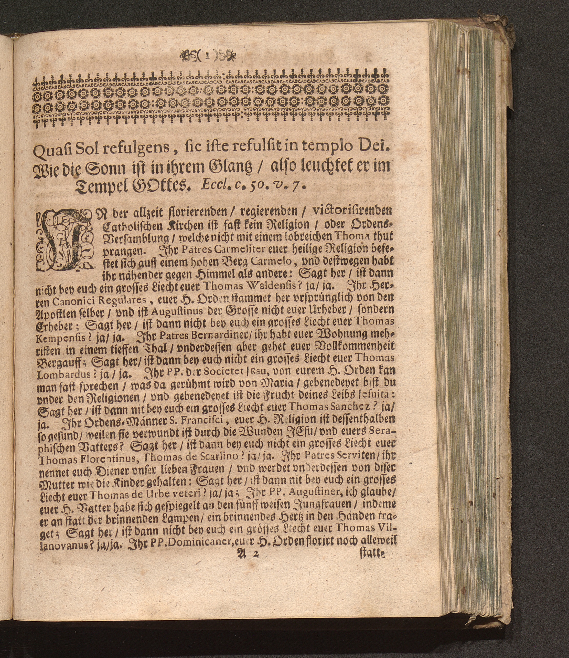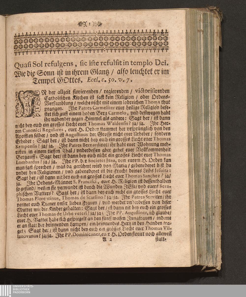 Der klare Sonnen-Schein/ An dem heiligen/ vnd berühmten Dominicaner-Orden. Das ist: Ein kurtze Lob-Predig von dem glorreichen/ vnd Englischen Doctore Thoma Aquinate / Welche Jn Gegenwart eines hohen/ vnd häuffigen Adels/ wie auch eines Volckreichen Auditorij an dessen H. Fest-Tag auff der Cantzel in der Herren P. P. Prediger Kirchen zu Grätz in Steyrmarck hat vorgetragen P. Fr. Abraham à S. Clara, Augustiner Baarfüsser/ [et]c.