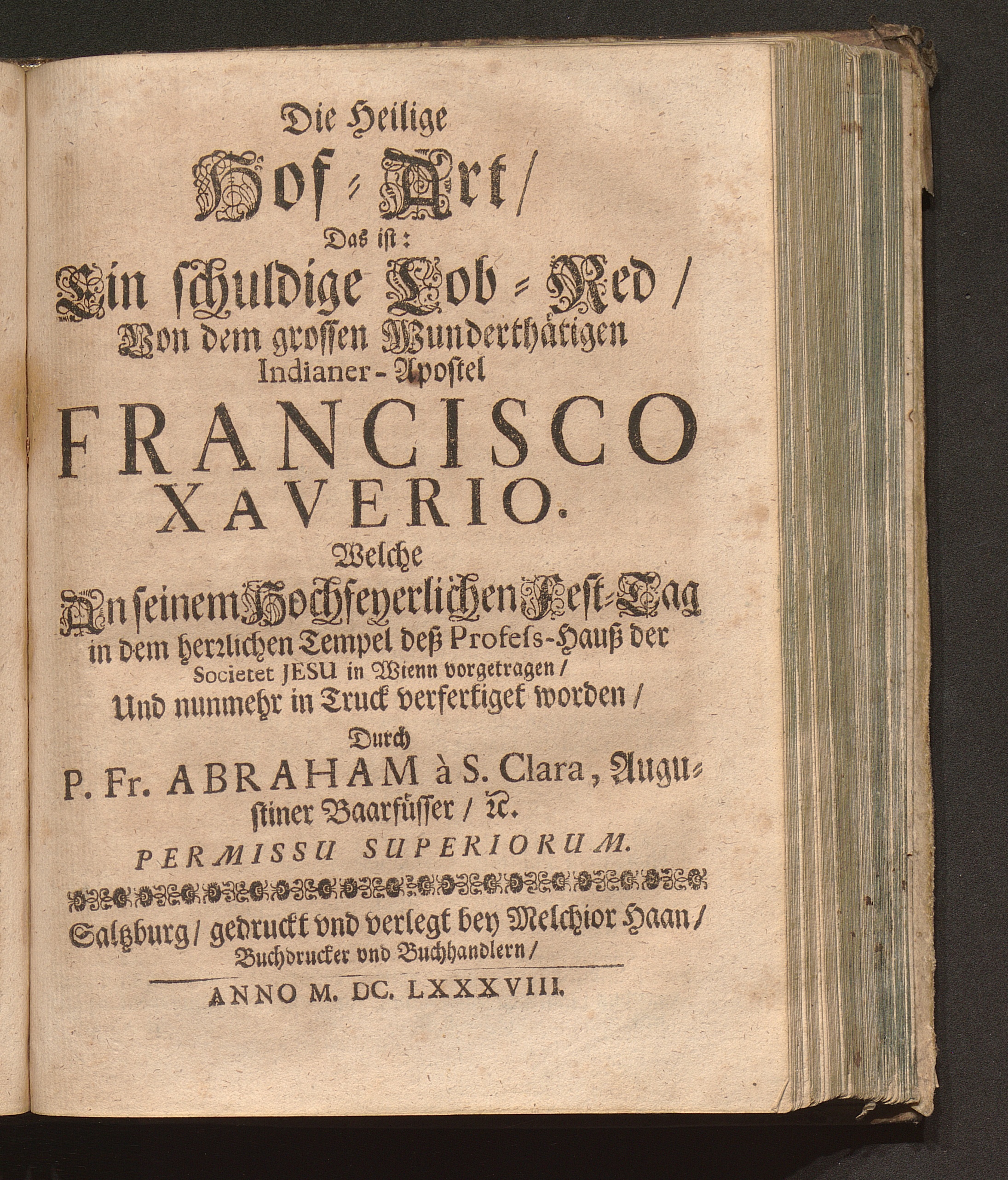 Die Heilige Hof-Art/ Das ist: Ein schuldige Lob-Red/ Von dem grossen Wunderthätigen Indianer-Apostel Francisco Xaverio : Welche An seinem Hochfeyerlichen Fest-Tag in dem herrlichen Tempel deß Profess-Hauß der Societet Jesu in Wienn vorgetragen/ Und nunmehr in Truck verfertiget worden / Durch P. Fr. Abraham à S. Clara, Augustiner Baarfüsser/ [et]c.