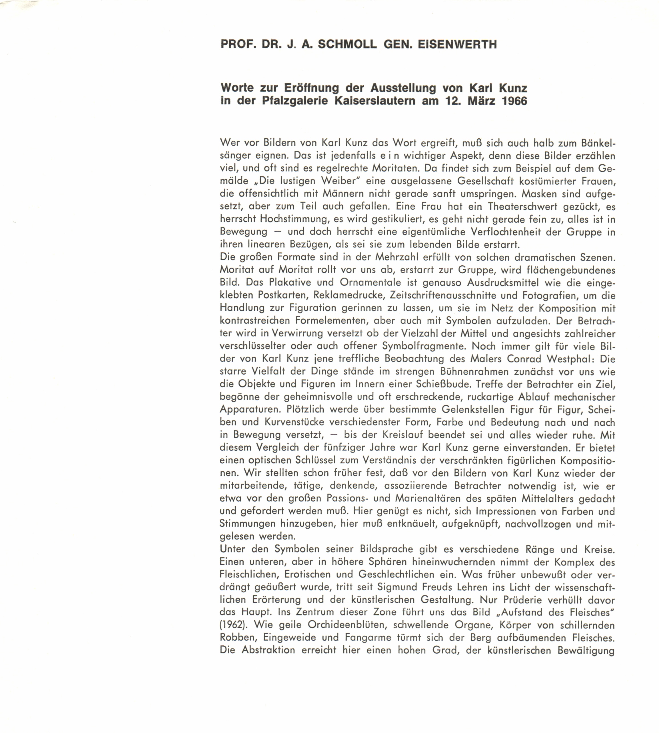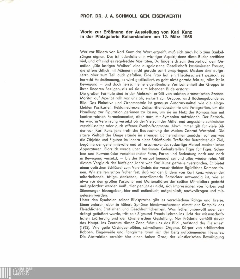 Worte zur Eröffnung der Ausstellung von Karl Kunz in der Pfalzgalerie Kaiserslautern am 12. März 1966 / Prof. Dr. J.A. Schmoll gen. Eisenwerth