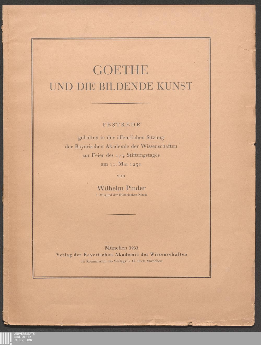 Goethe und die bildende Kunst : Festrede gehalten in der öffentlichen Sitzung der Bayerischen Akademie der Wissenschaften zur Feier des 173. Stiftungstages am 11. Mai 1932 / von Wilhelm Pinder