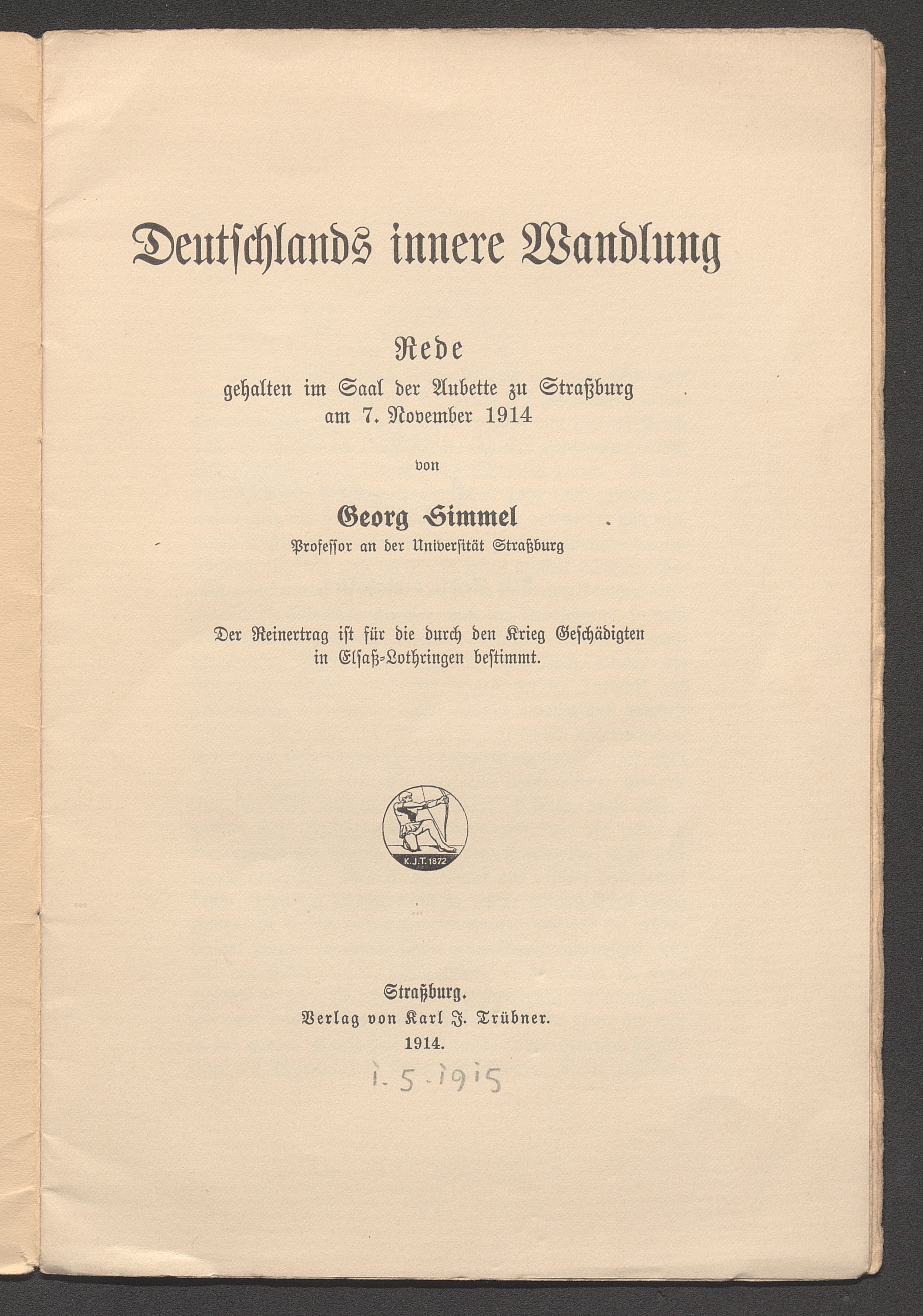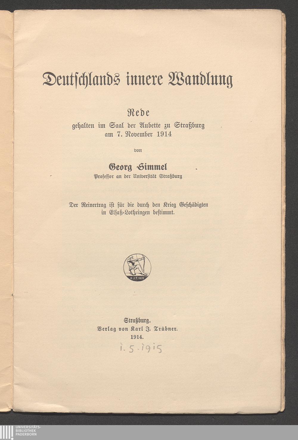 Deutschlands innere Wandlung : Rede gehalten im Saal der Aubette zu Strassburg am 7. November 1914 / von Georg Simmel