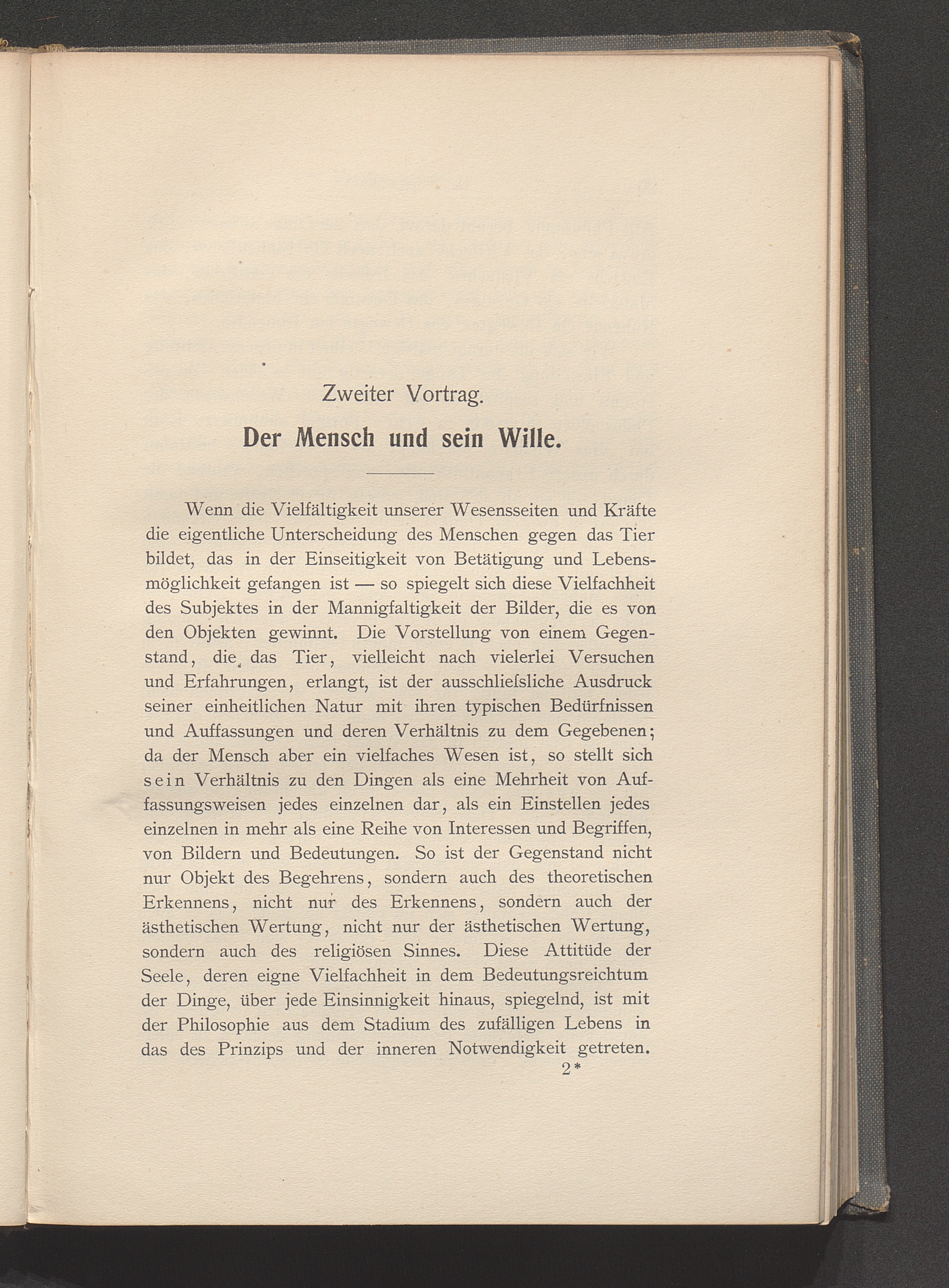 Die erkennbare Welt als Erscheinung in unserm Bewusstsein gegenüber dem unerkennbaren Sein der Dinge an sich. Die menschliche Seele als Treffpunkt beider Welten. Unser Wille als die absolute Realität unser selbst, als der einzige Inhalt unserer Existenz ausserhalb unseres Vorstellens. Scheidung dieses Grundwillens von seiner psychologischen Erscheinung in einzelnen Begehrungen. Die Deutung des Menschen als Vernunftwesen, die moderne und die Schopenhauersche Reform dieses Begriffes.