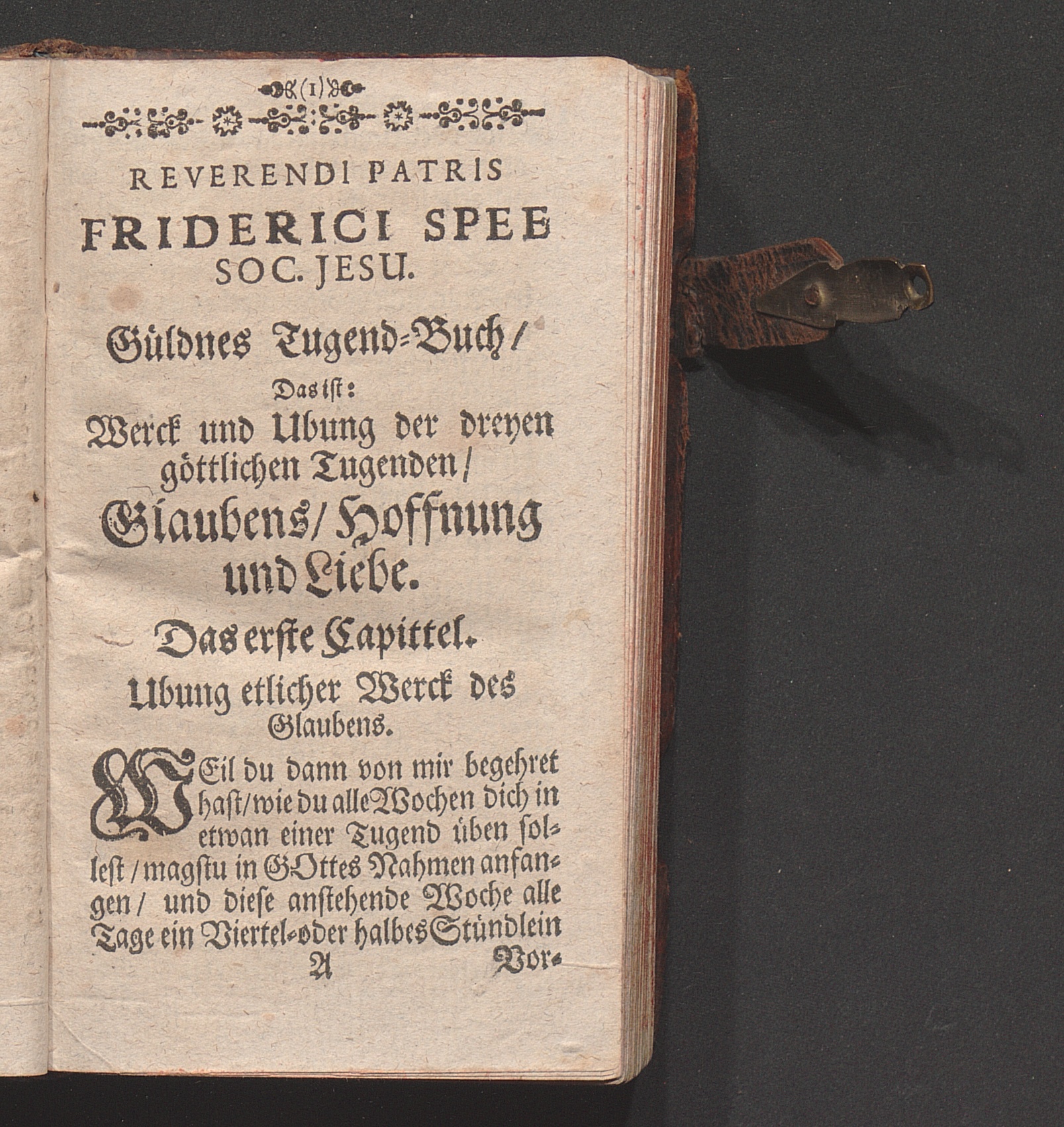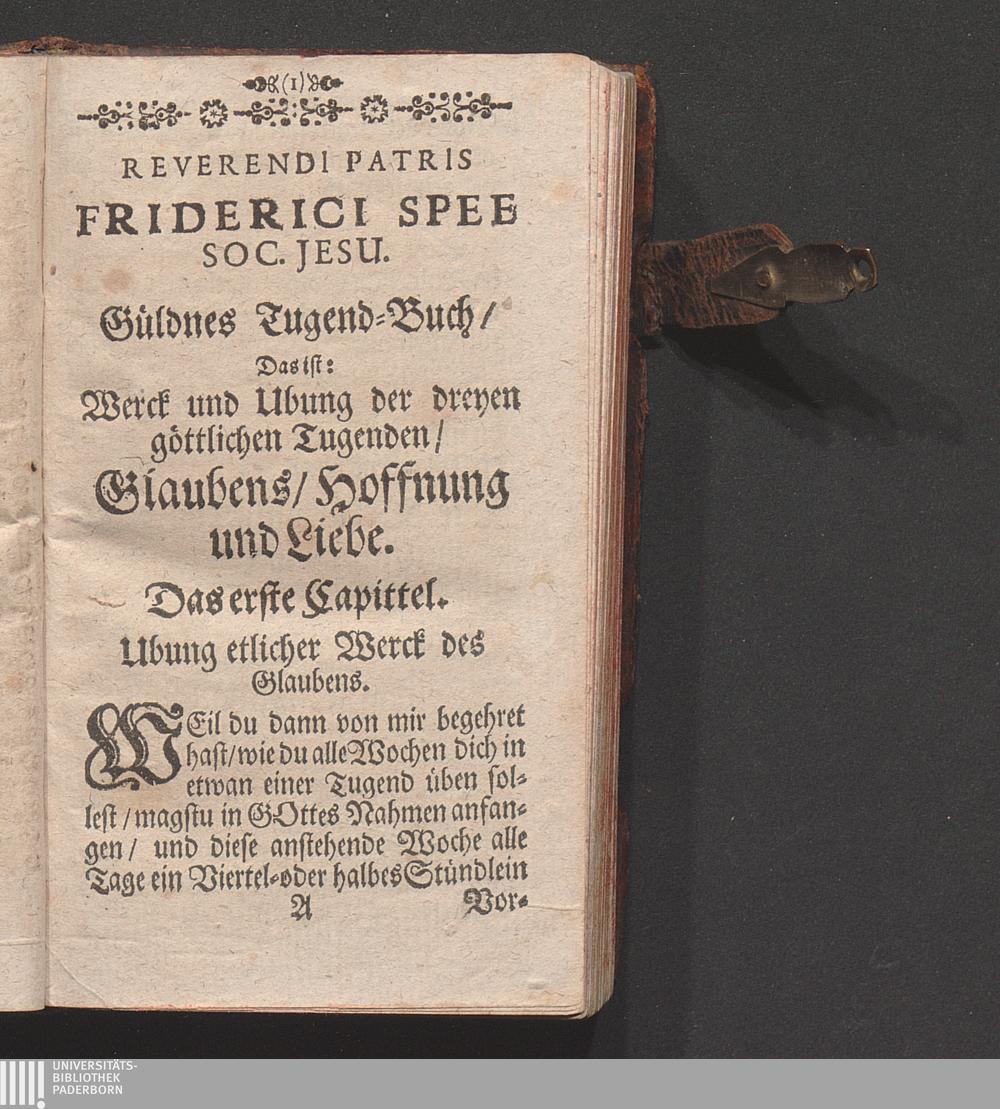 Rdi Patris Friderici Spee Societatis Iesv Güldenes TugentBuch. Das ist/ Werck und Ubung der dreyen Göttlichen Tugenden: Glaubens/ Hoffnung/ und Liebe : Allen Gottliebenden Seelen sonderlich Geistlichen Personen mit mercklichem Nutz zugebrauchen
