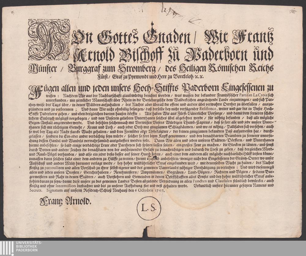Von Gottes Gnaden/ Wir Frantz Arnold Bischoff zu Paderborn und Münster/ Burggraf zum Stromberg/ des Heiligen Römischen Reichs Fürst/ Graf zu Pyrmondt und Herr zu Borckeloh/ [et]c. [et]c. Fügen allen und jeden unsers Hoch-Stiffts Paderborn Eingesessenen zu wissen: Nachdem Wir aus der Nachbarschafft glaubwürdig berichtet worden/ was massen der bekandter Frantzösischer Partisan La Croix sich unterstanden/ mit ziemlicher Mannschafft über Rhein in die Berleburgische dem Waldeckischen angräntzende Lande einzutringen ... haben Wir ... für nöhtig befunden/ daß alle mögliche Gegen-Anstalt angewendet werde ... : Signatum auf unserm Residentz-Schloß Neuhauß den 6 Octobris 1707