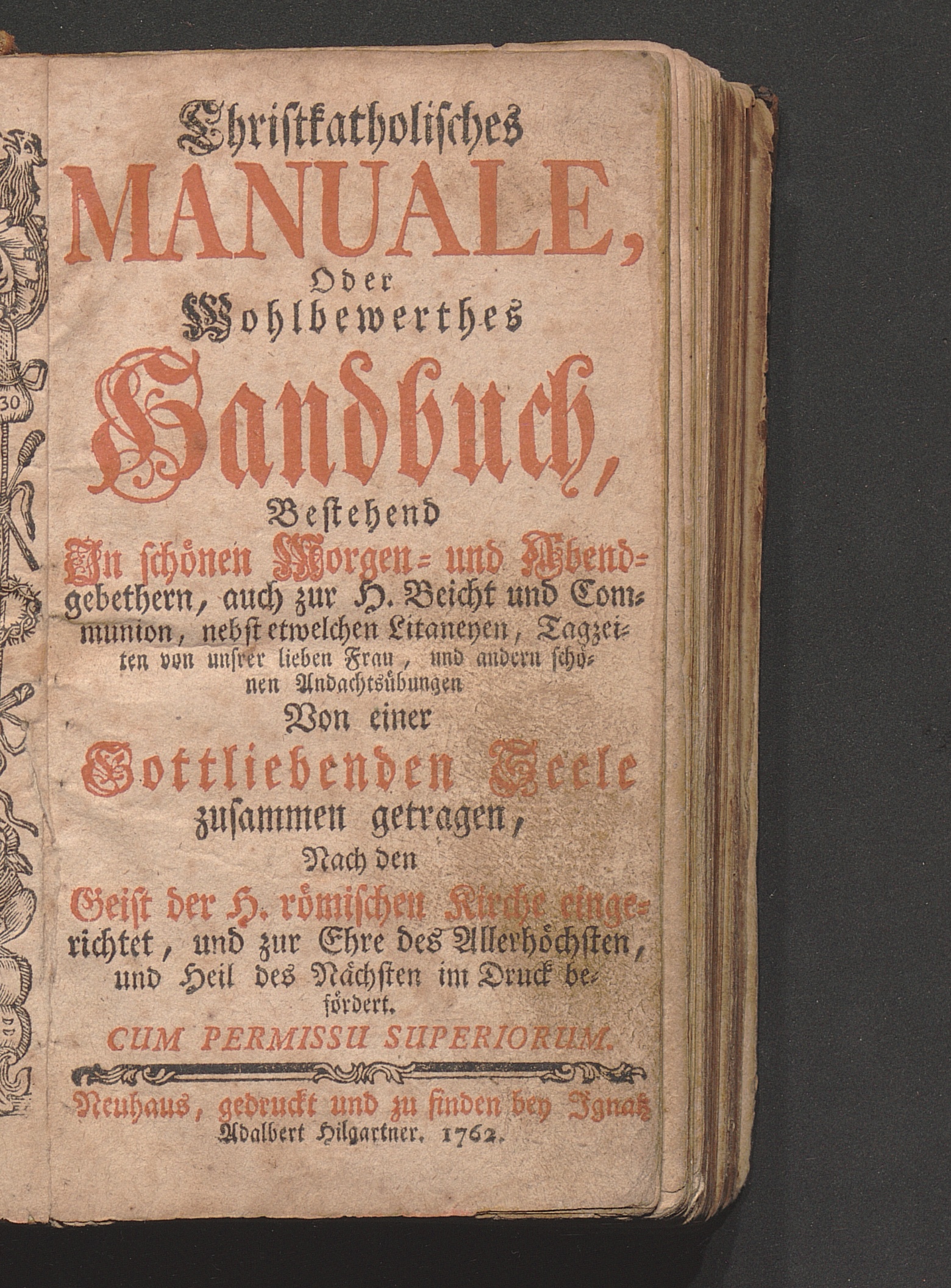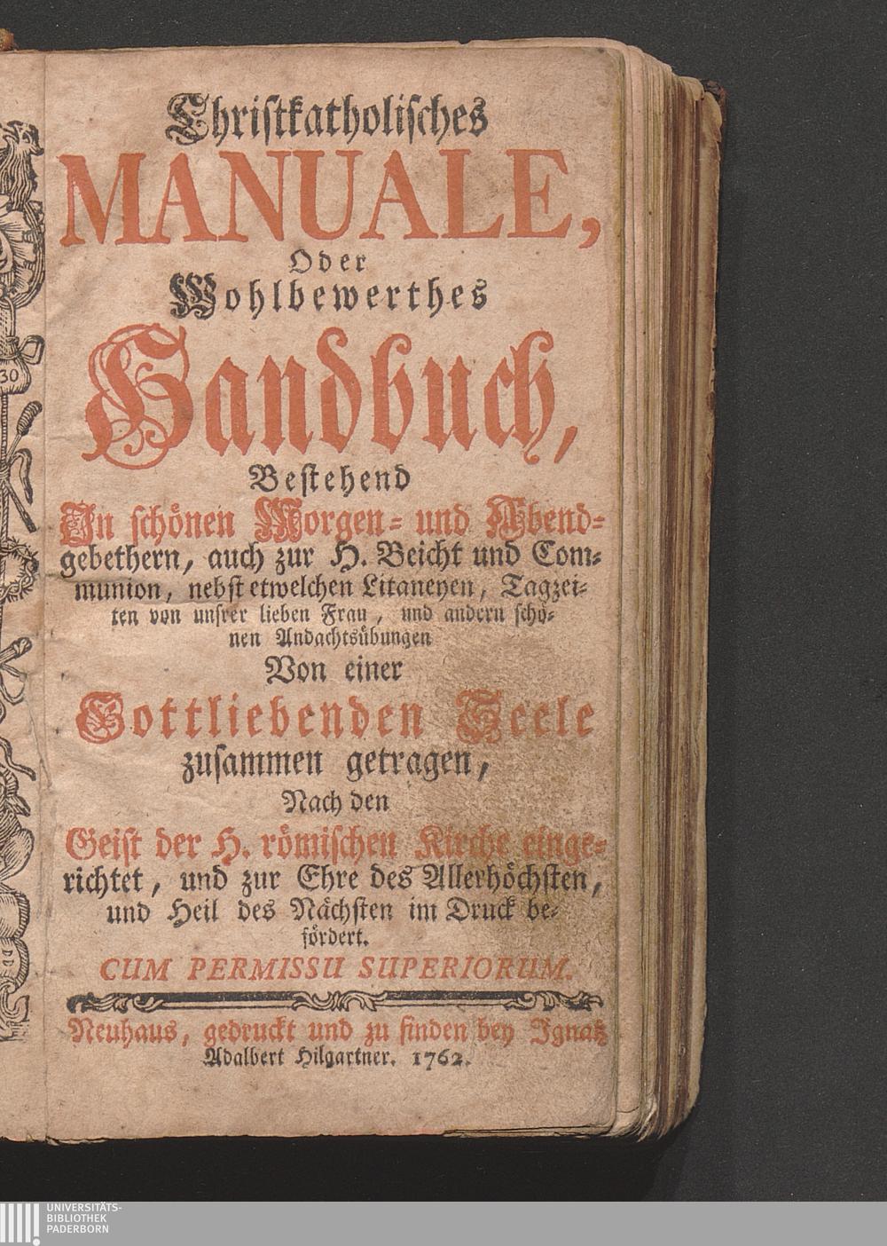 Christkatholisches Manuale, Oder Wohlbewerthes Handbuch : Bestehend Jn schönen Morgen- und Abendgebethern, auch zur H. Beicht und Communion, nebst etwelchen Litaneyen, Tagzeiten von unsrer lieben Frau, und andern schönen Andachtsübungen / Von einer Gottliebenden Seele zusammen getragen