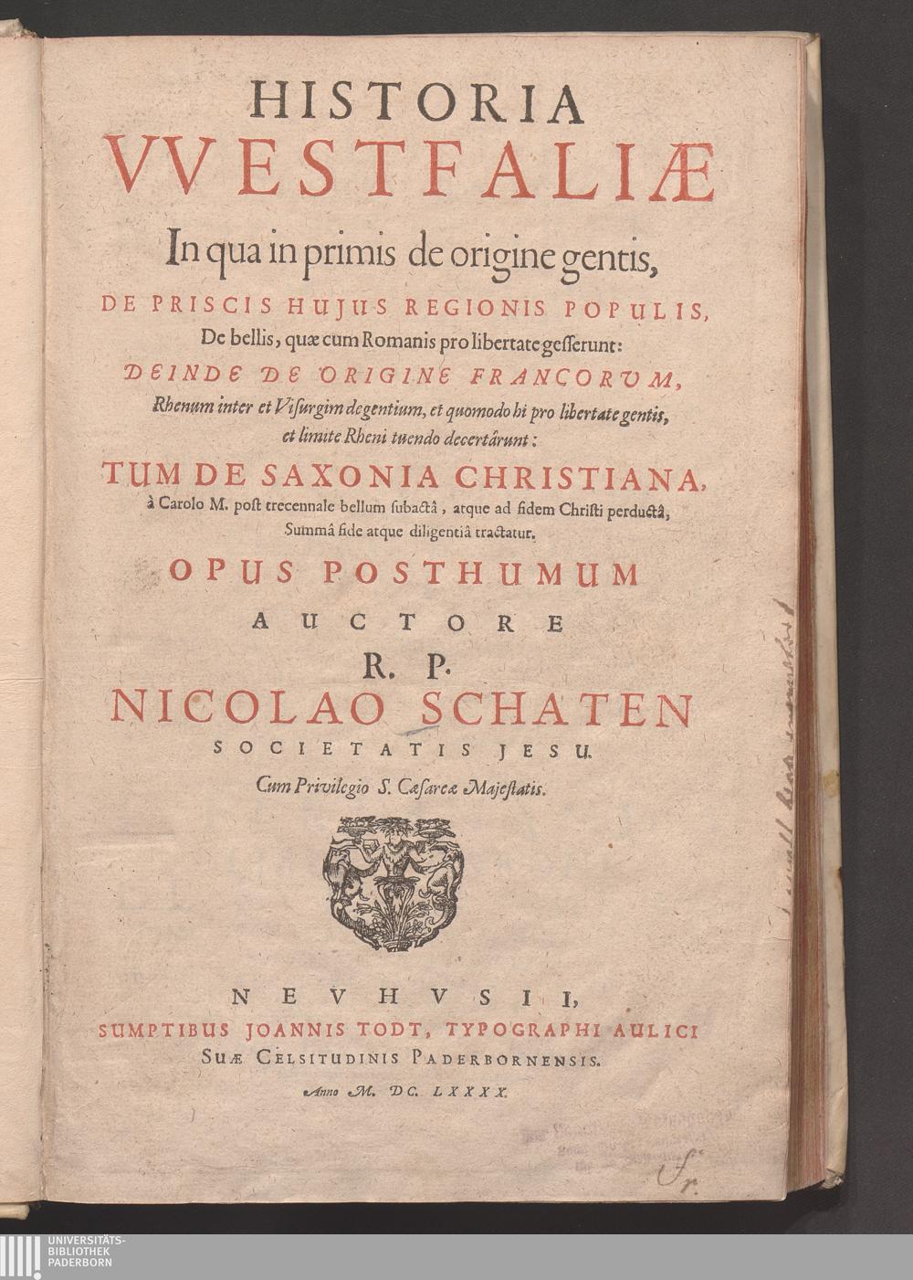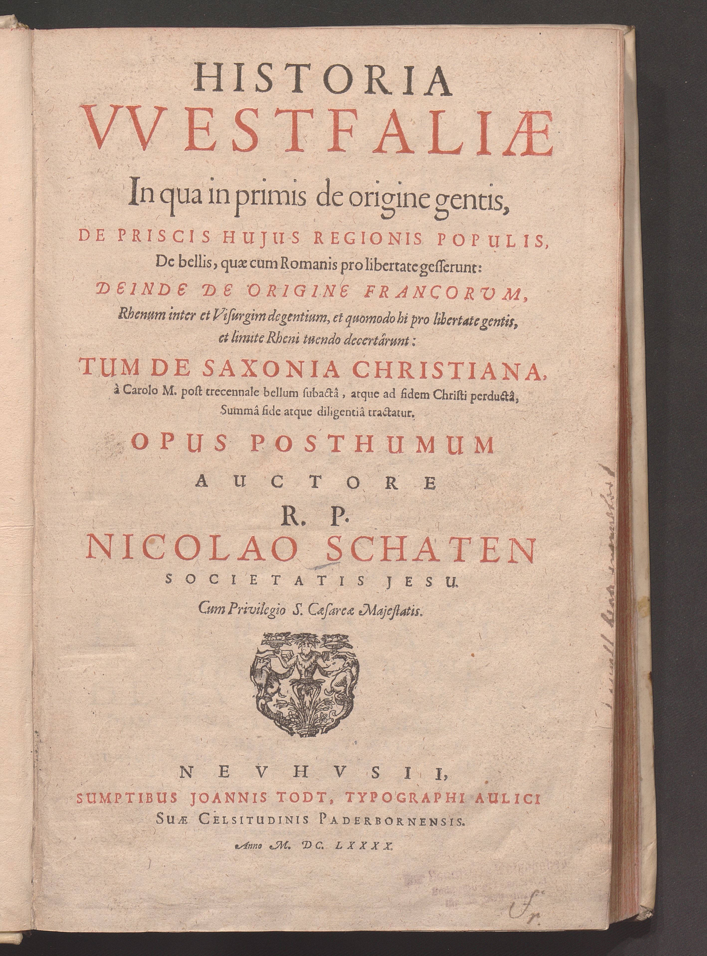 Historia VVestfaliæ : In qua in primis de origine gentis, De Priscis Hujus Regionis Populis, De bellis, quæ cum Romanis pro libertate gesserunt: Deinde De Origine Francorvm, Rhenum inter et Visurgim degentium, et quomodo hi pro libertate gentis, et limite Rheni tuendo decertârunt: Tum De Saxonia Christiana, à Carolo M. post trecennale bellum subactâ, atque ad fidem Christi perductâ ... tractatur. Opus Posthumum / Auctore R. P. Nicolao Schaten Societatis Jesu