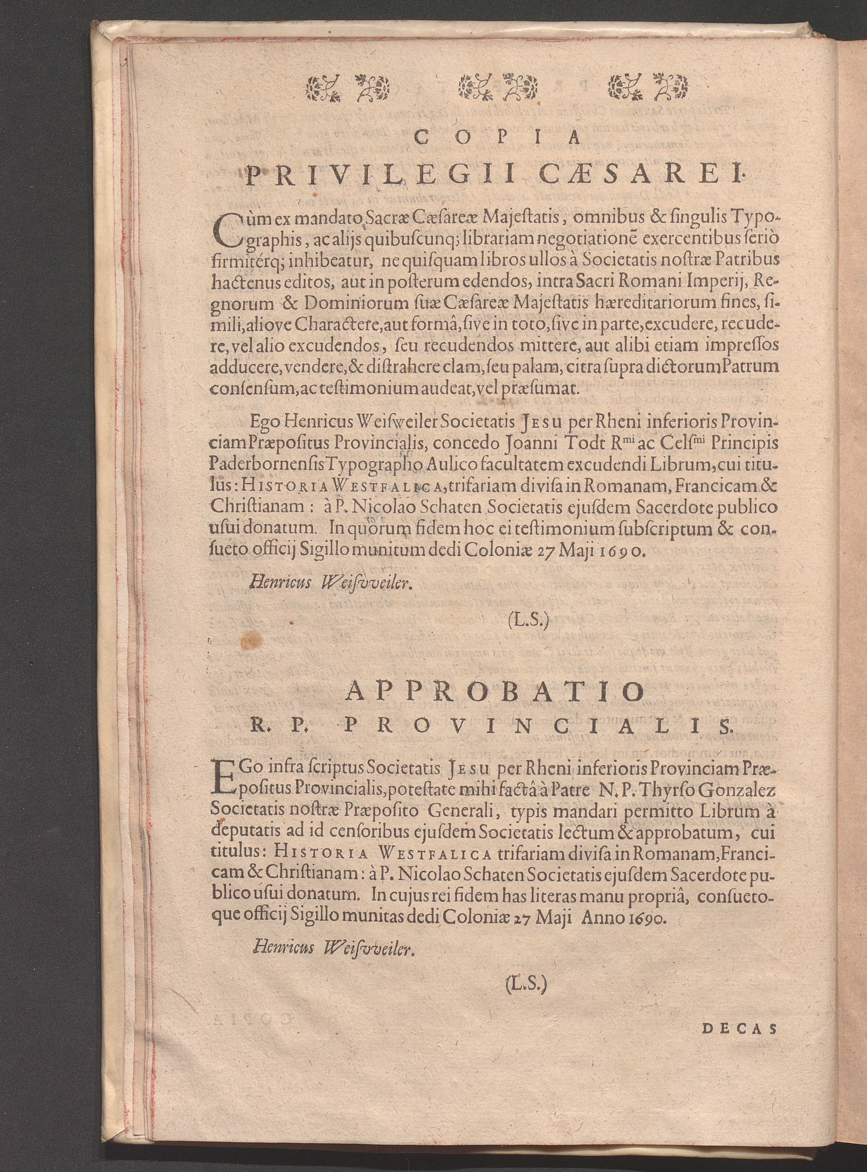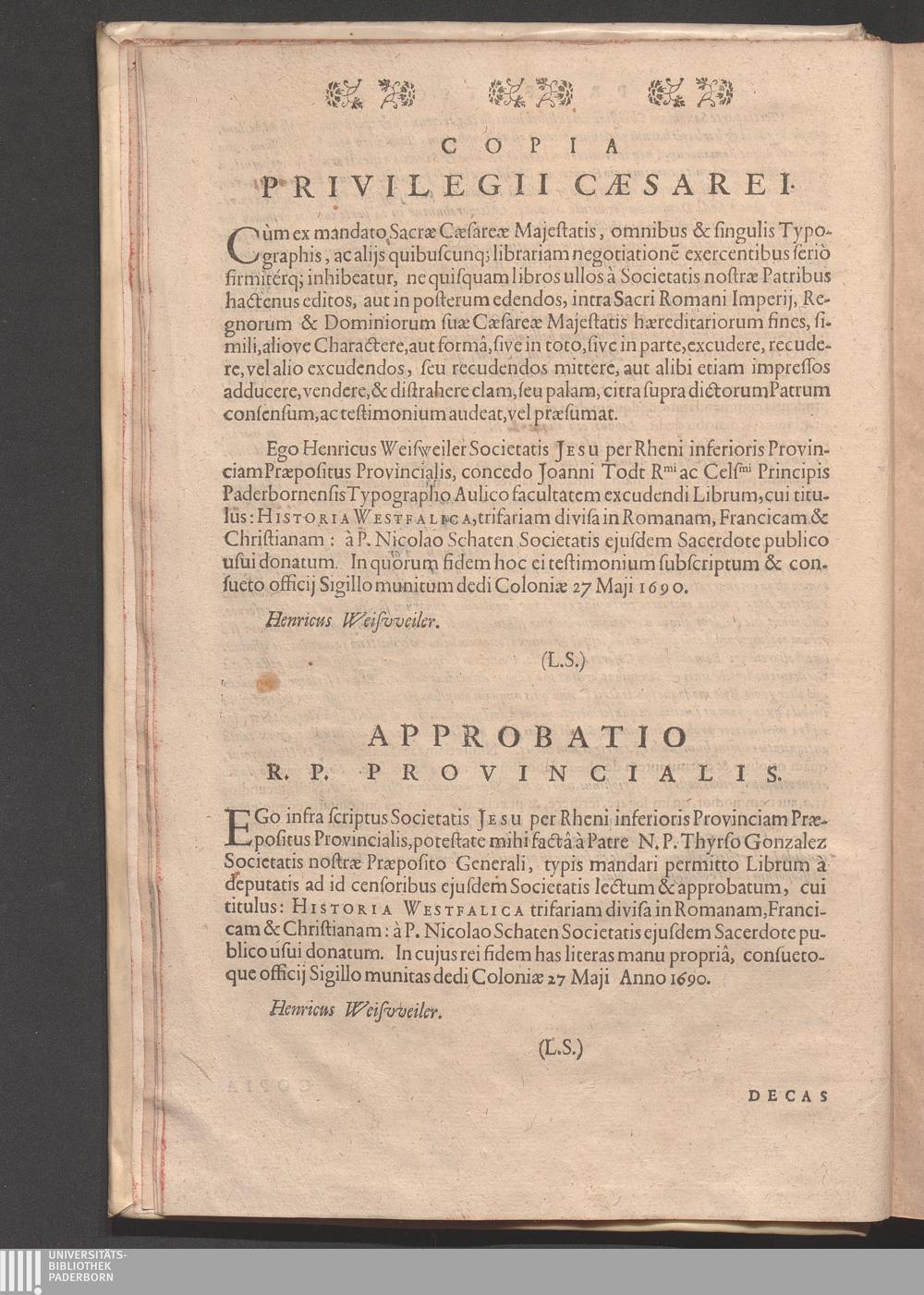Historia VVestfaliæ : In qua in primis de origine gentis, De Priscis Hujus Regionis Populis, De bellis, quæ cum Romanis pro libertate gesserunt: Deinde De Origine Francorvm, Rhenum inter et Visurgim degentium, et quomodo hi pro libertate gentis, et limite Rheni tuendo decertârunt: Tum De Saxonia Christiana, à Carolo M. post trecennale bellum subactâ, atque ad fidem Christi perductâ ... tractatur. Opus Posthumum / Auctore R. P. Nicolao Schaten Societatis Jesu