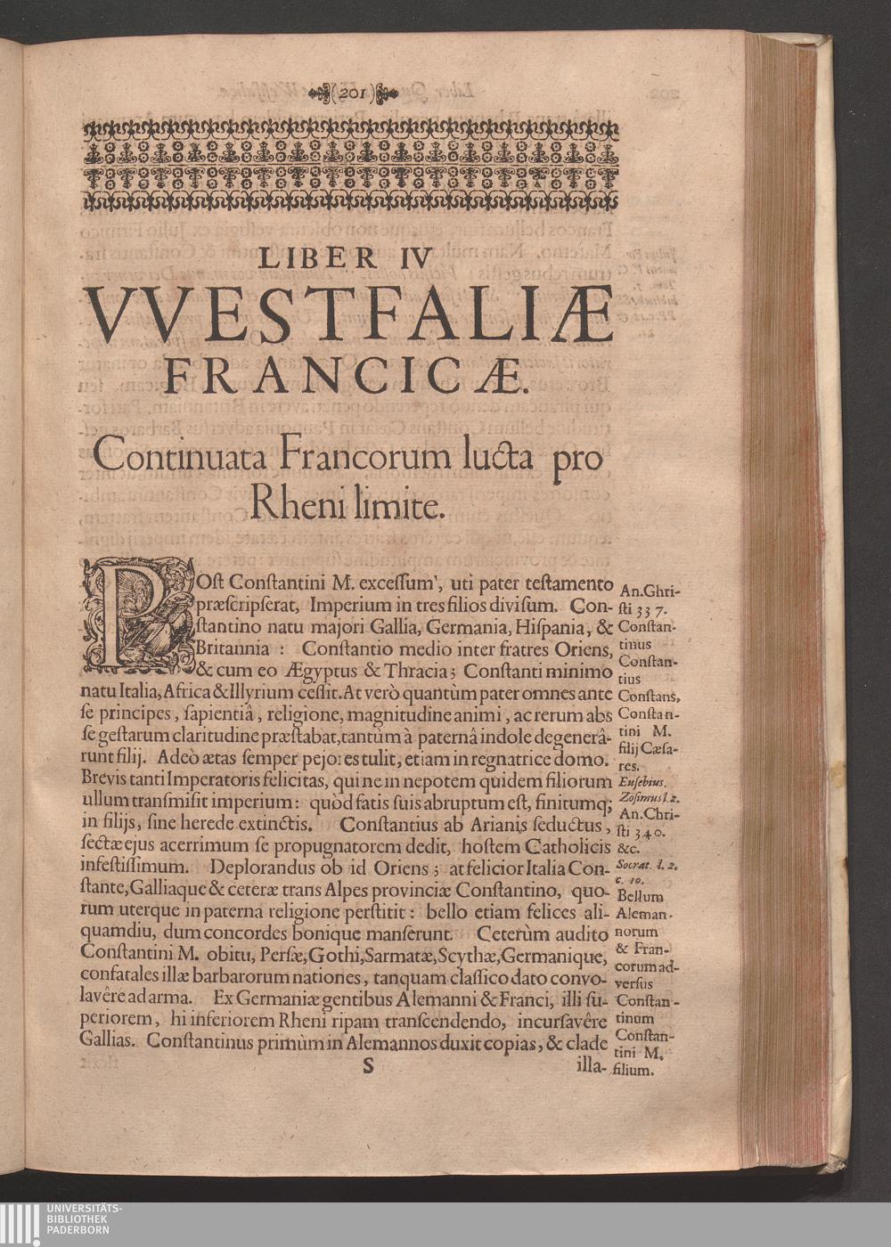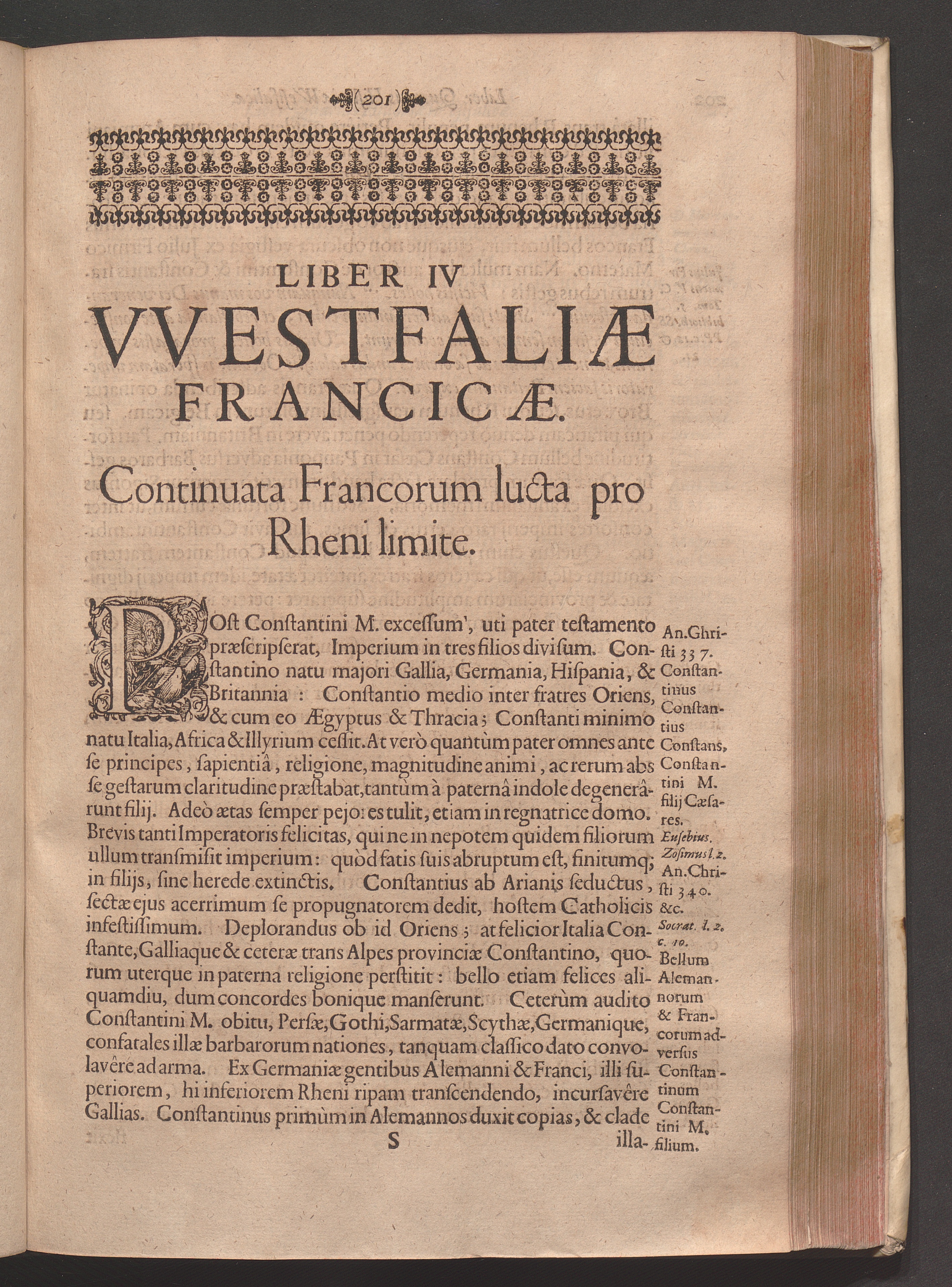 Historia VVestfaliæ : In qua in primis de origine gentis, De Priscis Hujus Regionis Populis, De bellis, quæ cum Romanis pro libertate gesserunt: Deinde De Origine Francorvm, Rhenum inter et Visurgim degentium, et quomodo hi pro libertate gentis, et limite Rheni tuendo decertârunt: Tum De Saxonia Christiana, à Carolo M. post trecennale bellum subactâ, atque ad fidem Christi perductâ ... tractatur. Opus Posthumum / Auctore R. P. Nicolao Schaten Societatis Jesu