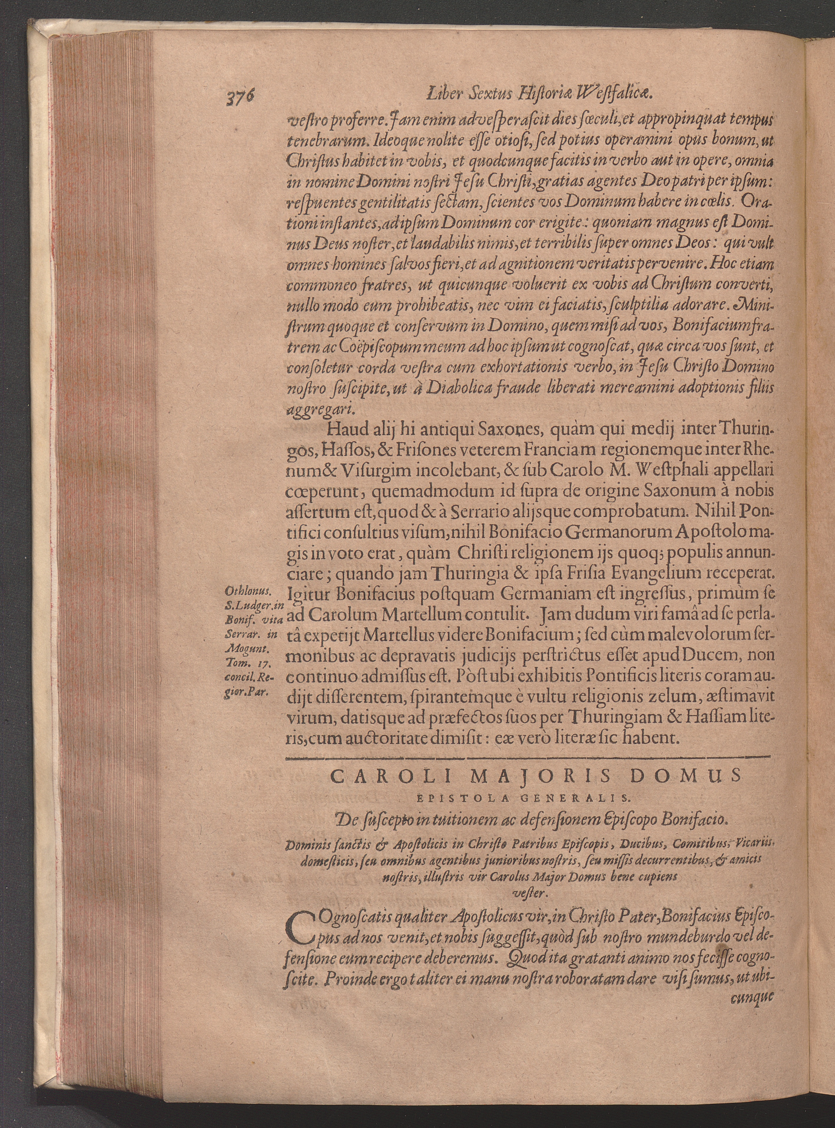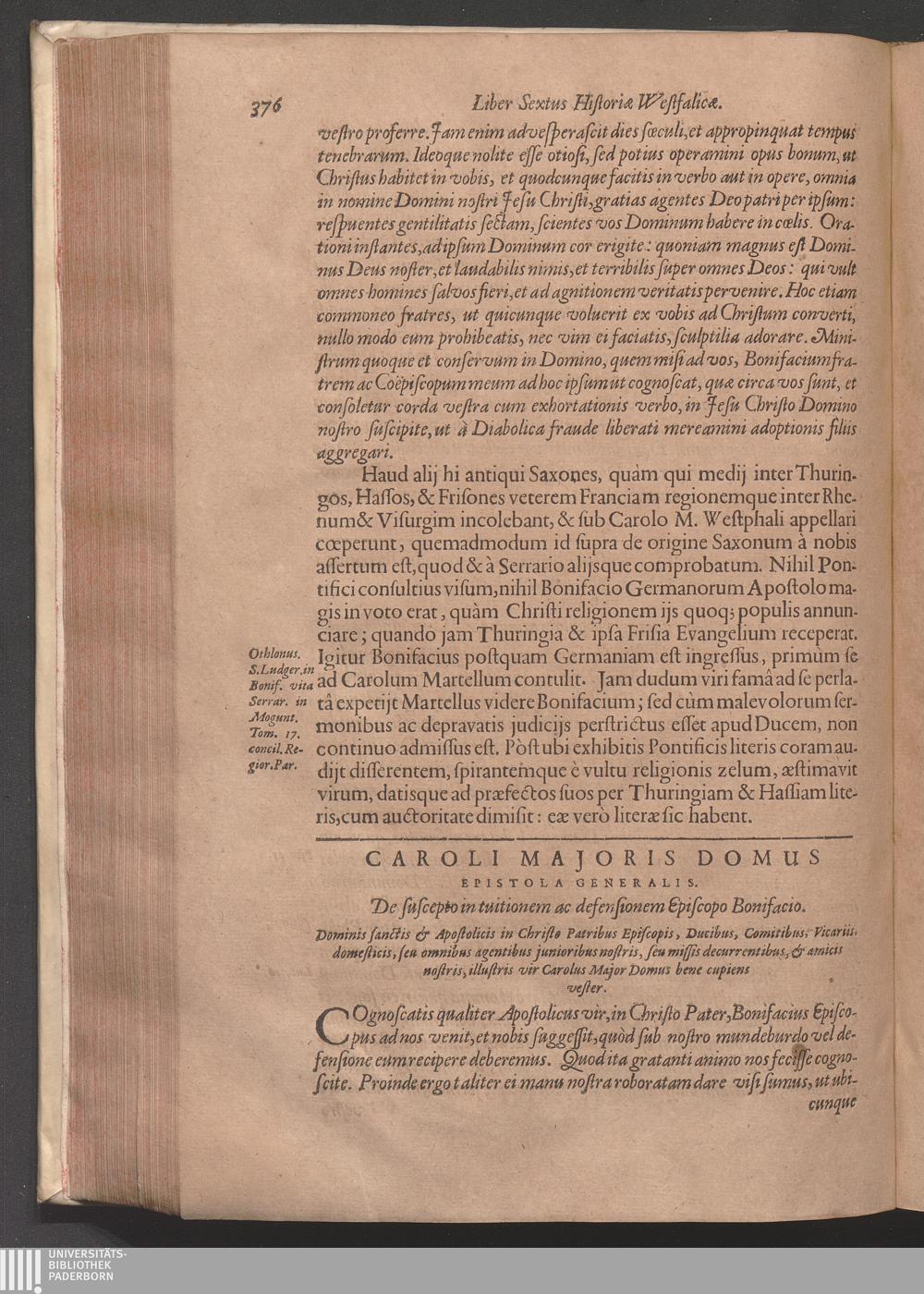 Historia VVestfaliæ : In qua in primis de origine gentis, De Priscis Hujus Regionis Populis, De bellis, quæ cum Romanis pro libertate gesserunt: Deinde De Origine Francorvm, Rhenum inter et Visurgim degentium, et quomodo hi pro libertate gentis, et limite Rheni tuendo decertârunt: Tum De Saxonia Christiana, à Carolo M. post trecennale bellum subactâ, atque ad fidem Christi perductâ ... tractatur. Opus Posthumum / Auctore R. P. Nicolao Schaten Societatis Jesu