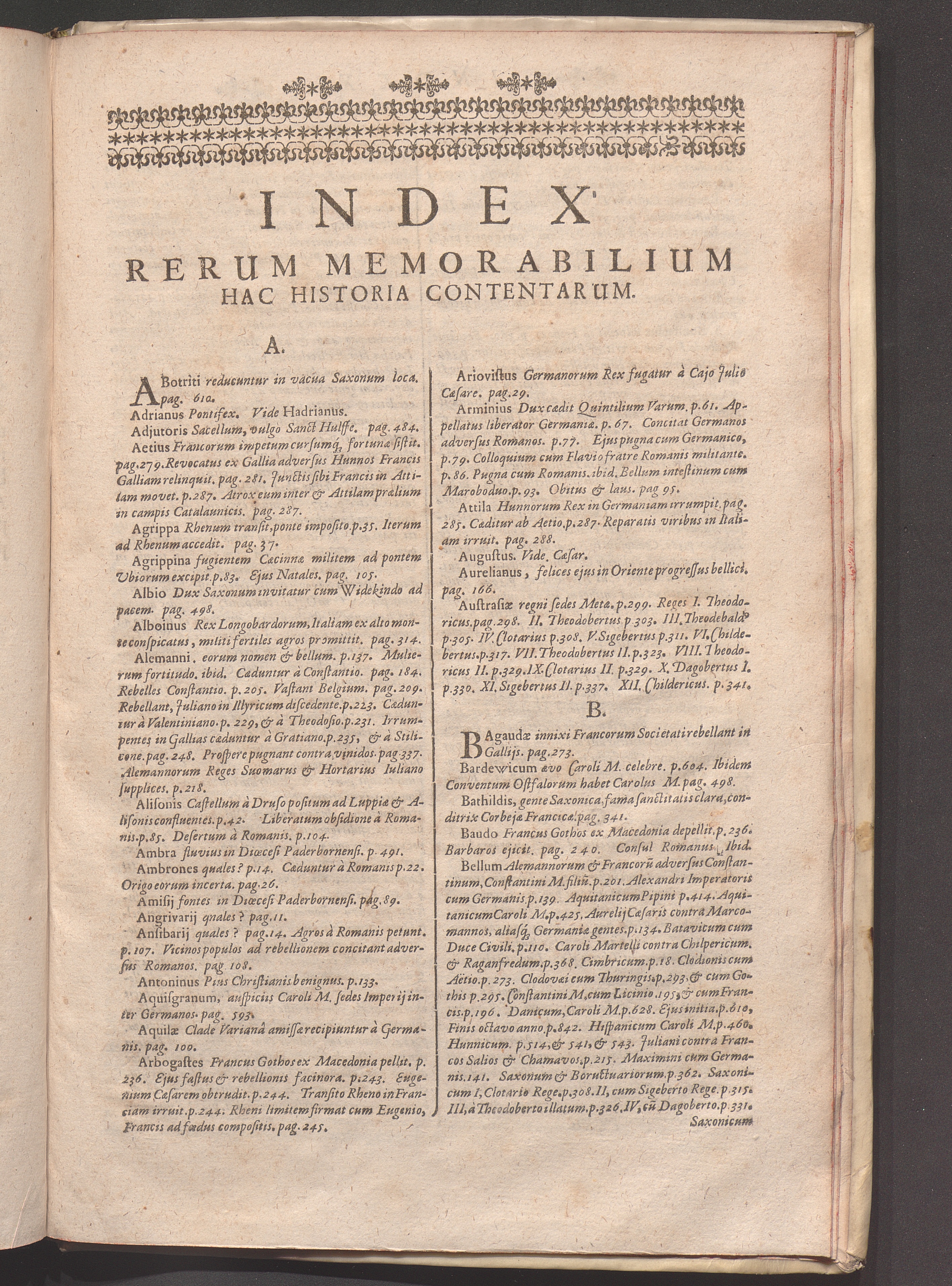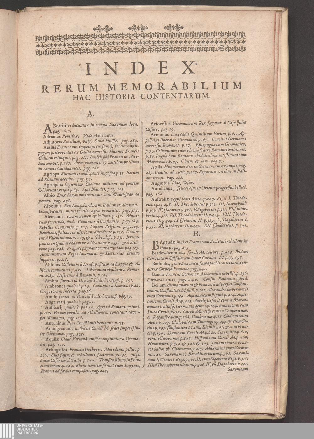 Historia VVestfaliæ : In qua in primis de origine gentis, De Priscis Hujus Regionis Populis, De bellis, quæ cum Romanis pro libertate gesserunt: Deinde De Origine Francorvm, Rhenum inter et Visurgim degentium, et quomodo hi pro libertate gentis, et limite Rheni tuendo decertârunt: Tum De Saxonia Christiana, à Carolo M. post trecennale bellum subactâ, atque ad fidem Christi perductâ ... tractatur. Opus Posthumum / Auctore R. P. Nicolao Schaten Societatis Jesu
