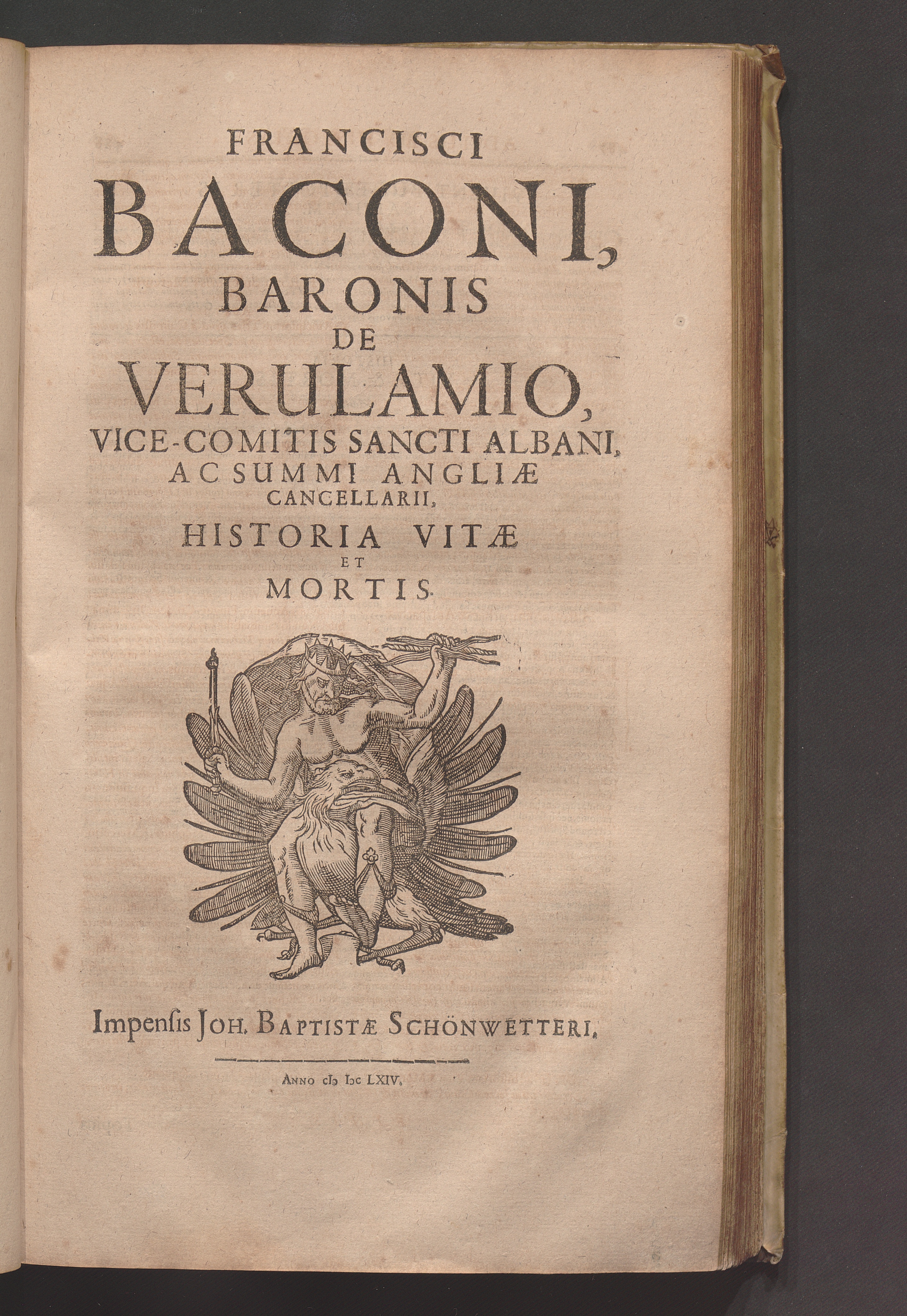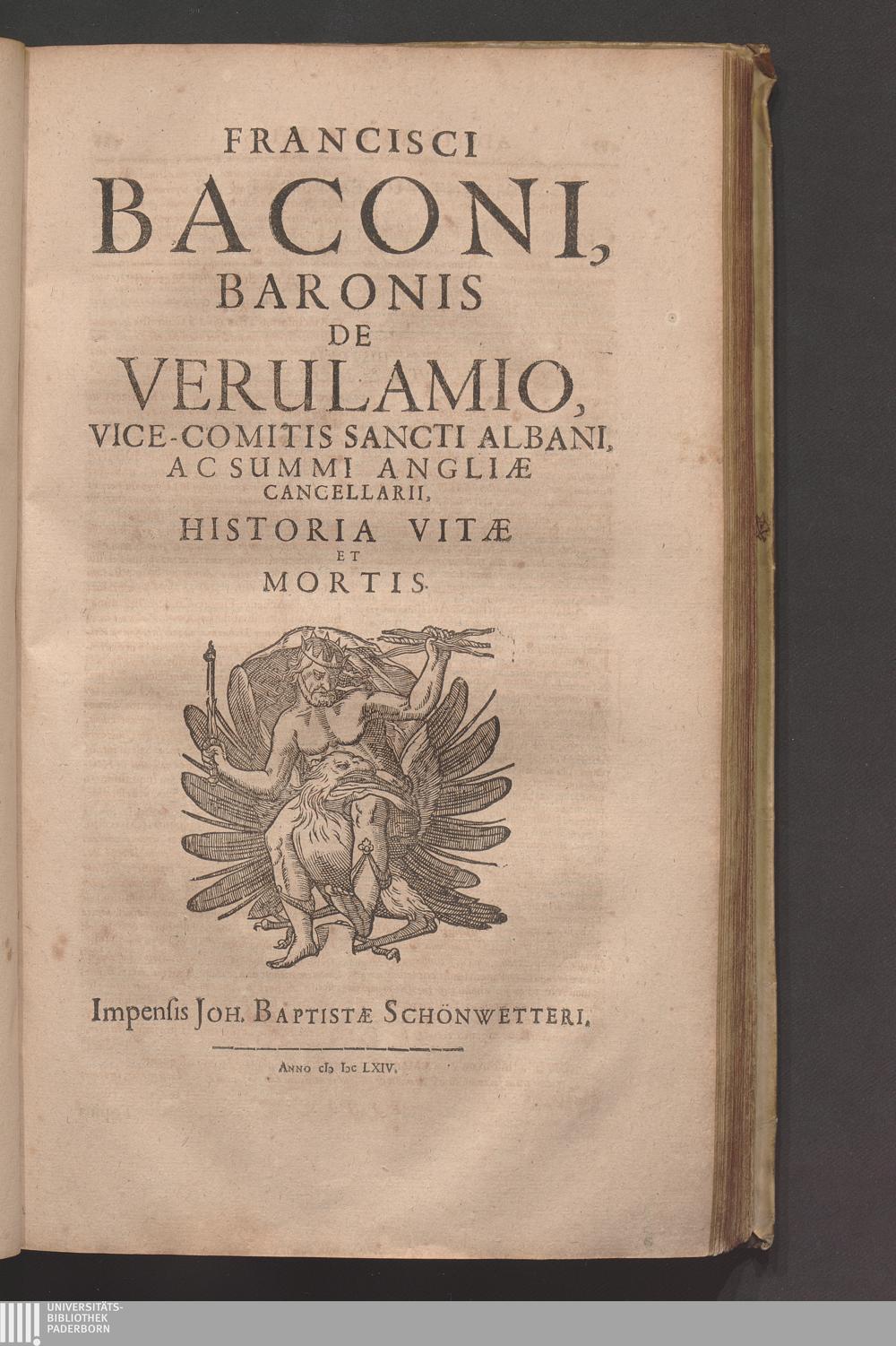 Francisci Baconi Baronis de Verulamio, Vice-Comitis S. Albani, Summi Angliæ Cancellarii, Opera omnia, Quæ extant: Philosophica, Moralia, Politica, Historica ... : In Quibus Complures Alii Tractatus, Quos Brevitatis Causa prætermittere visum est, comprehensi sunt ; Hactenus Nunquam Conjunctim Edita, Iam vero Summo Studio Collecta, Uno Volumine Comprehensa, & ab innumeris Mendis repurgata ; Cum Indice Rerum ac Verborum Vniversali absolutissimo ; His Præfixa Est Auctoris Vita