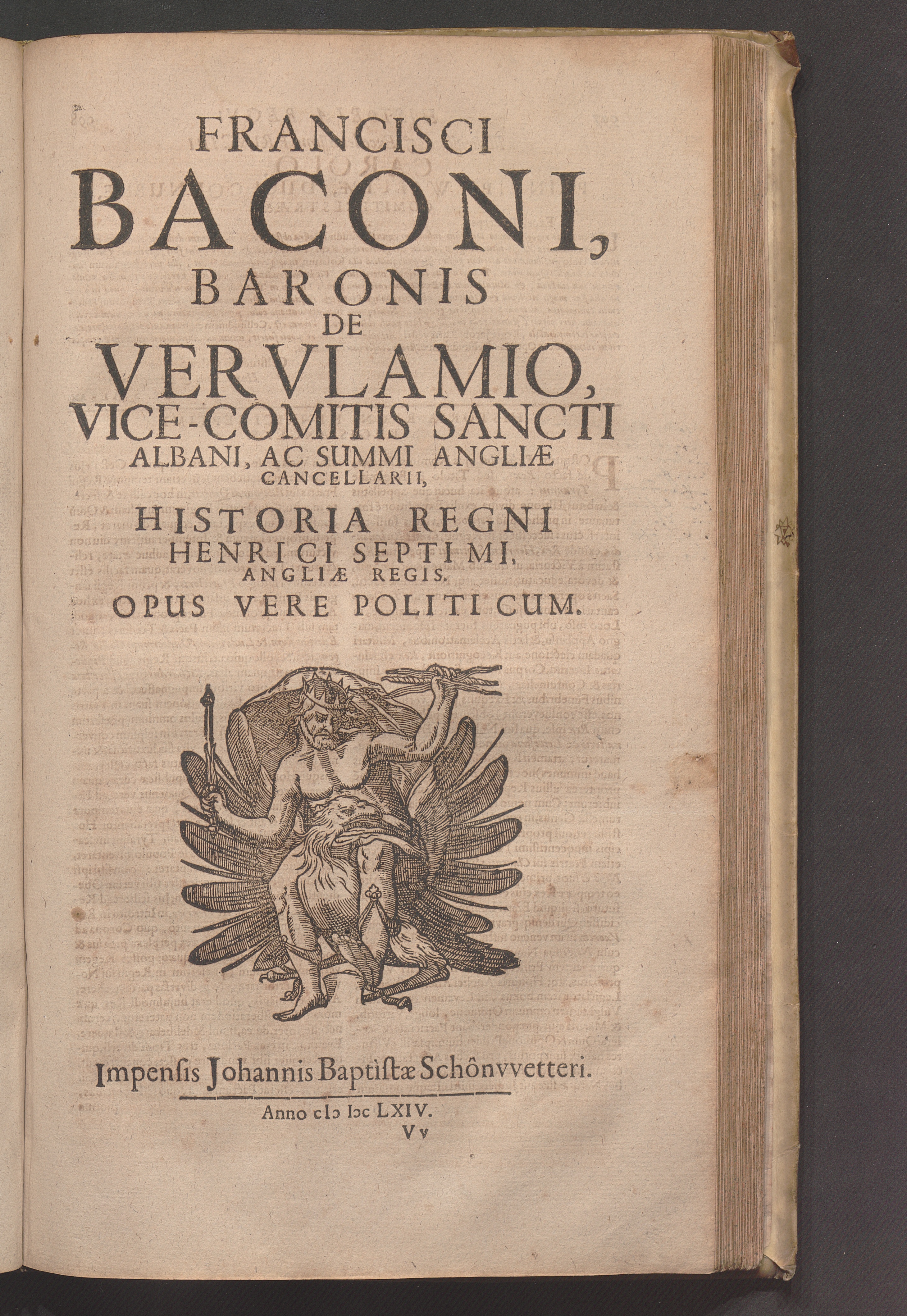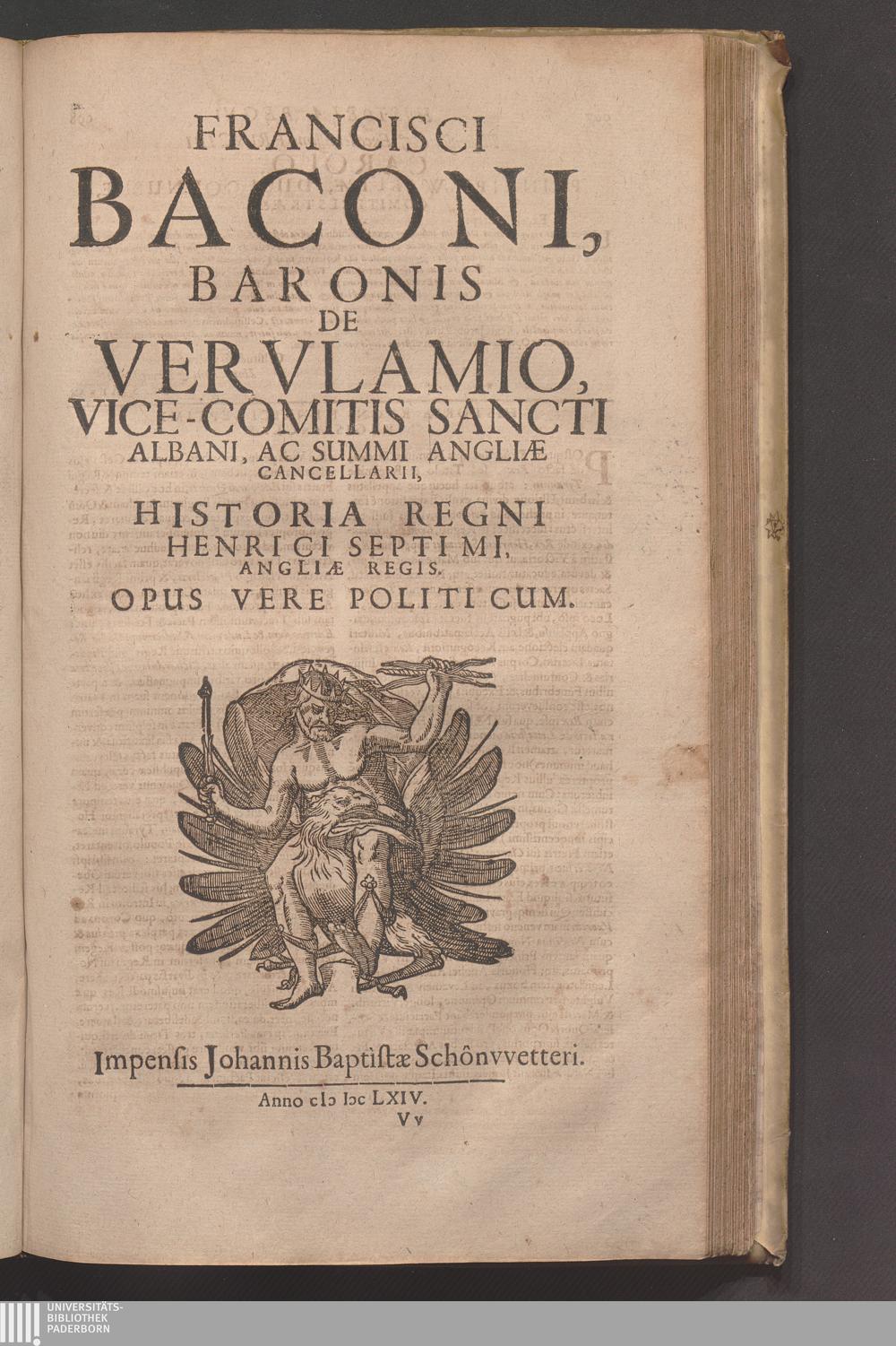 Francisci Baconi Baronis de Verulamio, Vice-Comitis S. Albani, Summi Angliæ Cancellarii, Opera omnia, Quæ extant: Philosophica, Moralia, Politica, Historica ... : In Quibus Complures Alii Tractatus, Quos Brevitatis Causa prætermittere visum est, comprehensi sunt ; Hactenus Nunquam Conjunctim Edita, Iam vero Summo Studio Collecta, Uno Volumine Comprehensa, & ab innumeris Mendis repurgata ; Cum Indice Rerum ac Verborum Vniversali absolutissimo ; His Præfixa Est Auctoris Vita