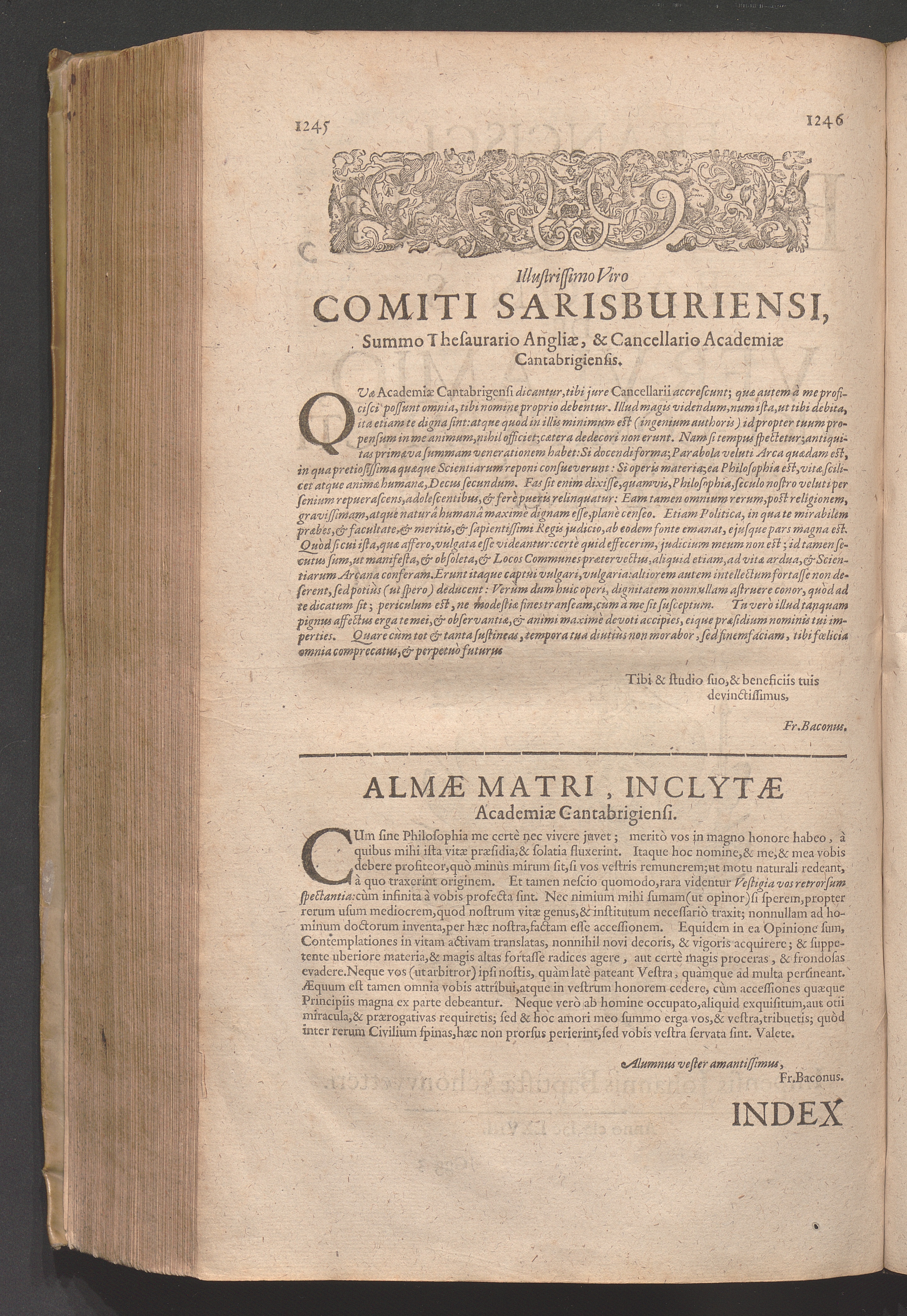 Francisci Baconi Baronis de Verulamio, Vice-Comitis S. Albani, Summi Angliæ Cancellarii, Opera omnia, Quæ extant: Philosophica, Moralia, Politica, Historica ... : In Quibus Complures Alii Tractatus, Quos Brevitatis Causa prætermittere visum est, comprehensi sunt ; Hactenus Nunquam Conjunctim Edita, Iam vero Summo Studio Collecta, Uno Volumine Comprehensa, & ab innumeris Mendis repurgata ; Cum Indice Rerum ac Verborum Vniversali absolutissimo ; His Præfixa Est Auctoris Vita