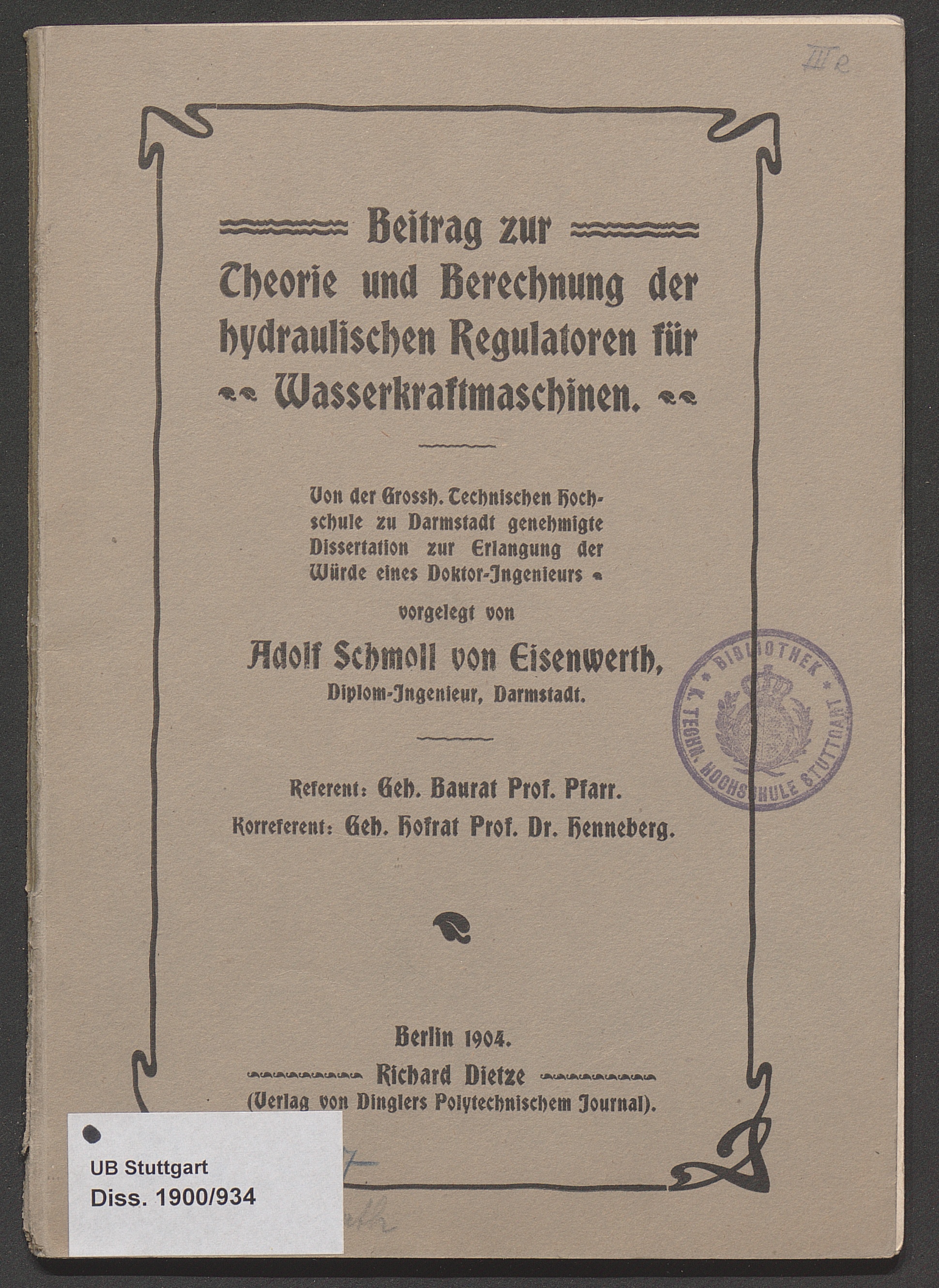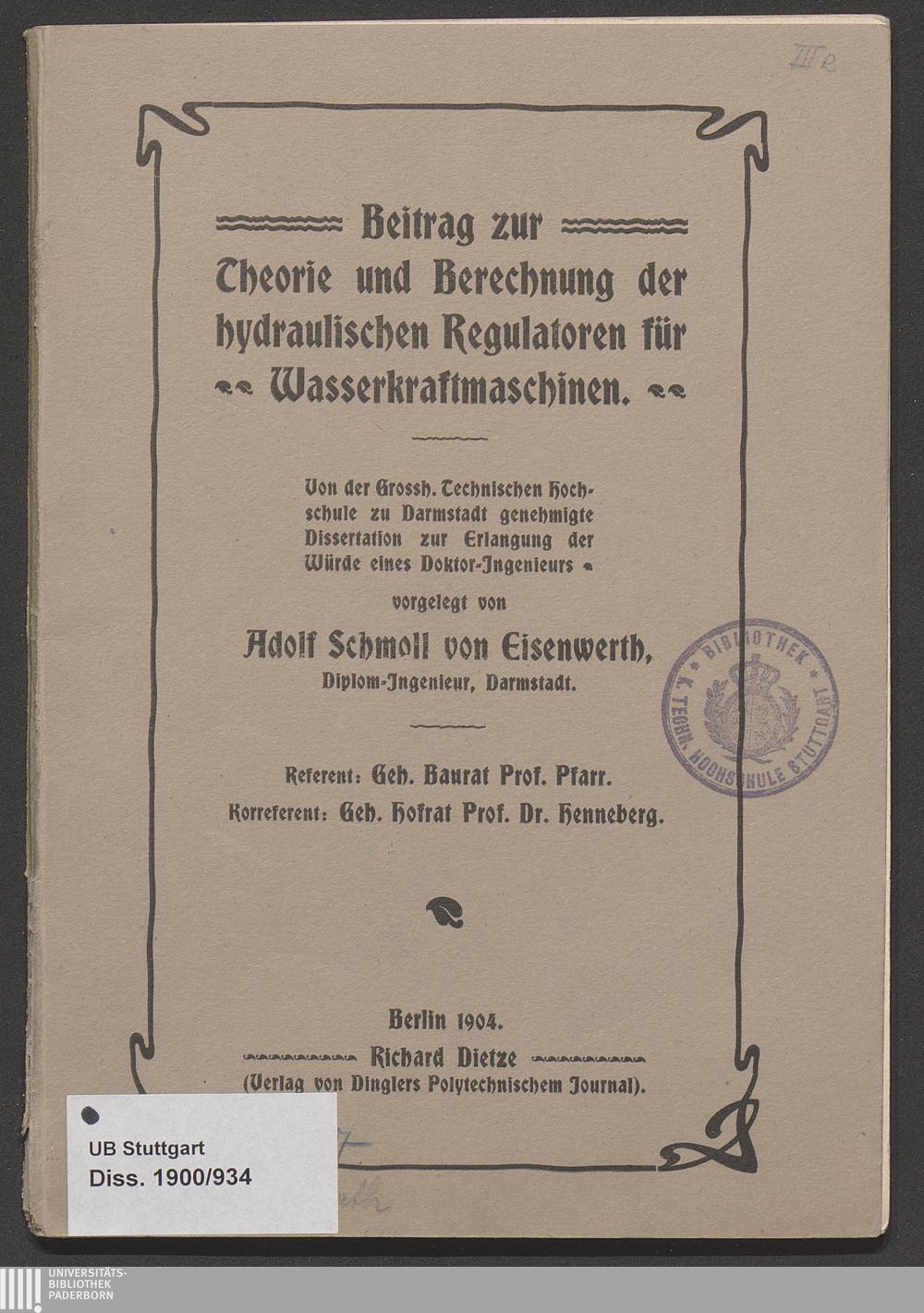 Beitrag zur Theorie und Berechnung der hydraulischen Regulatoren für Wasserkraftmaschinen / von Adolf Schmoll von Eisenwerth