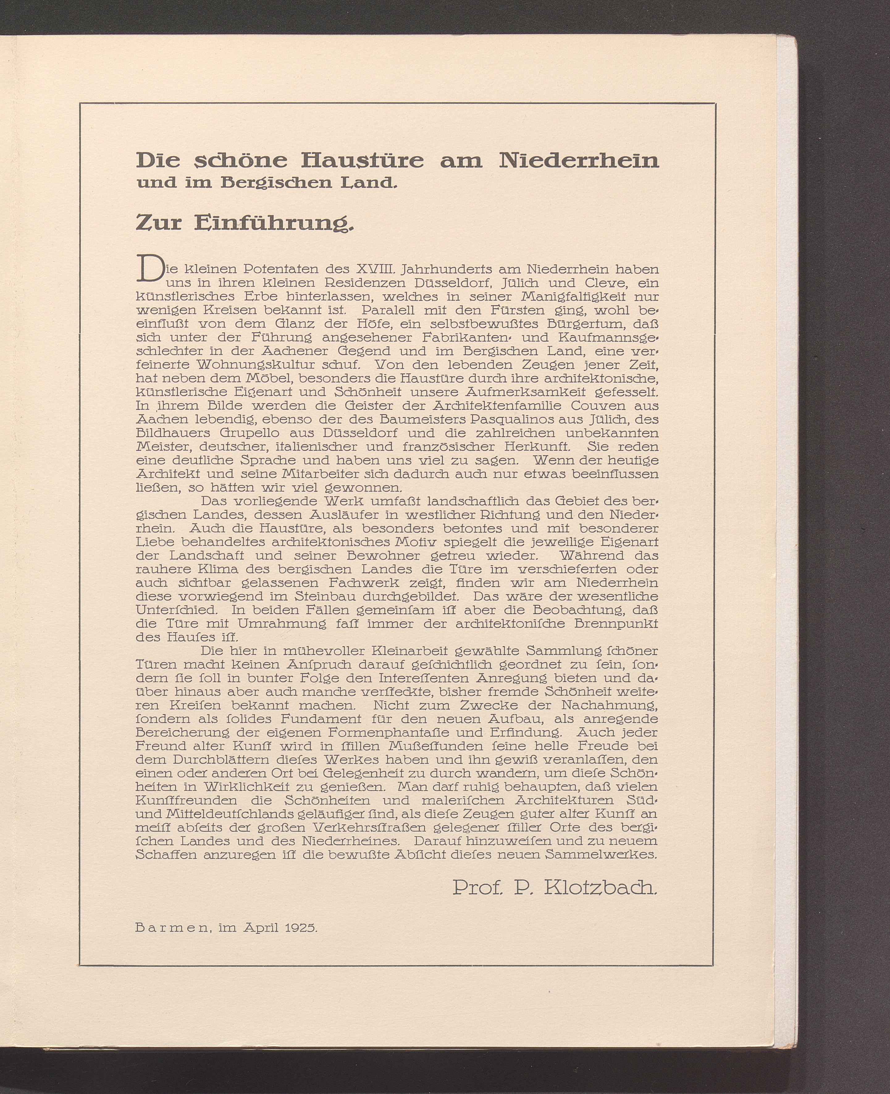 Die schöne Haustüre am Niederrhein und im Bergischen Land / mit einer Einf. von Peter Klotzbach