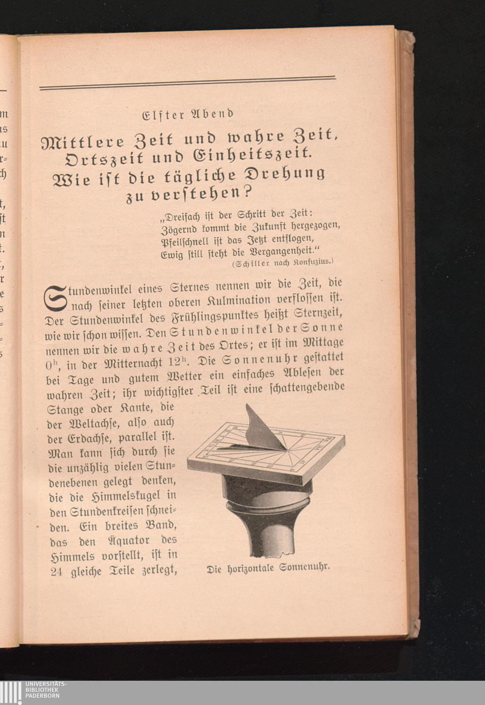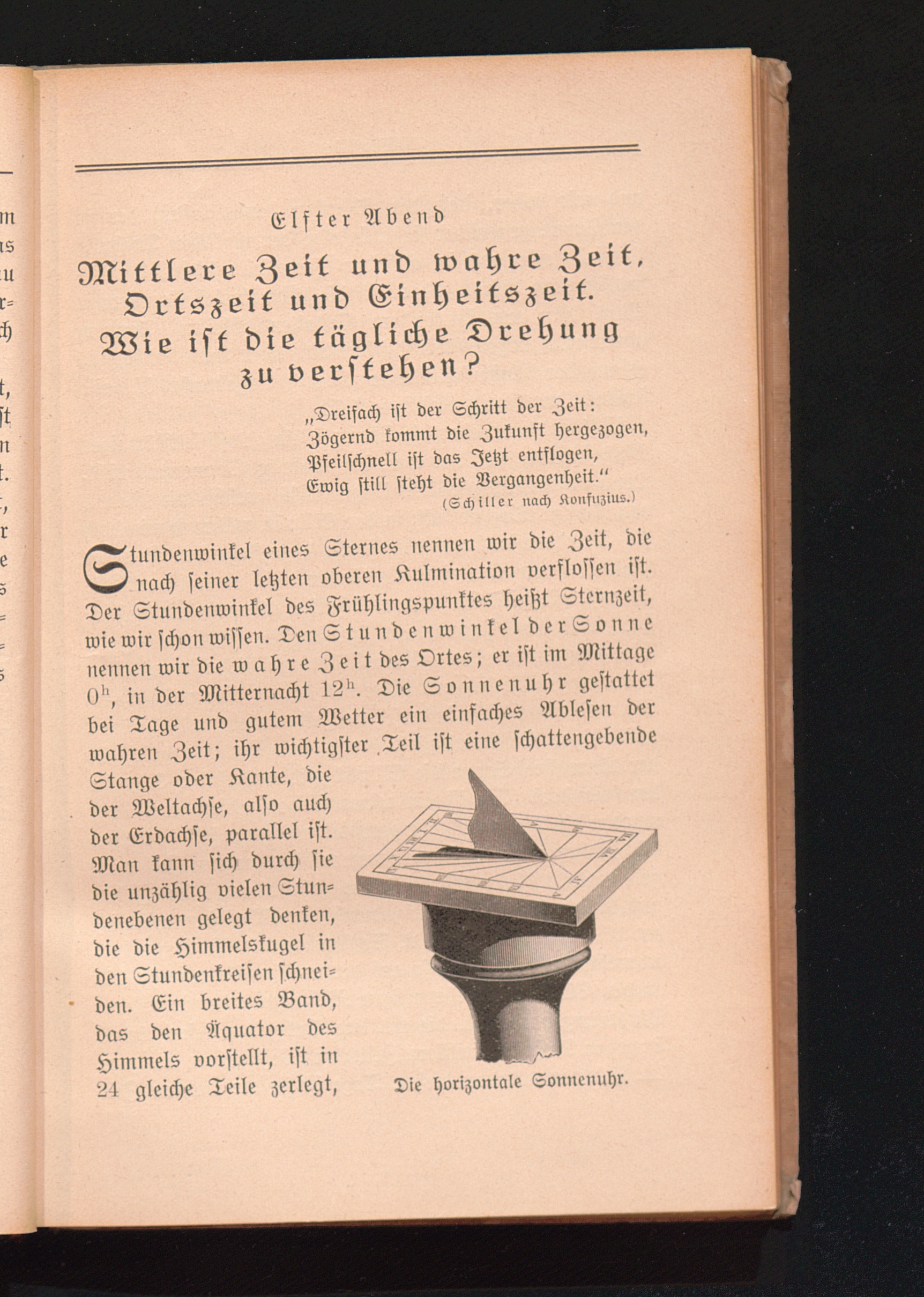 11. Abend: Mittlere Zeit und wahre Zeit, Ortszeit und Einheitszeit. Wie ist die tägliche[...]