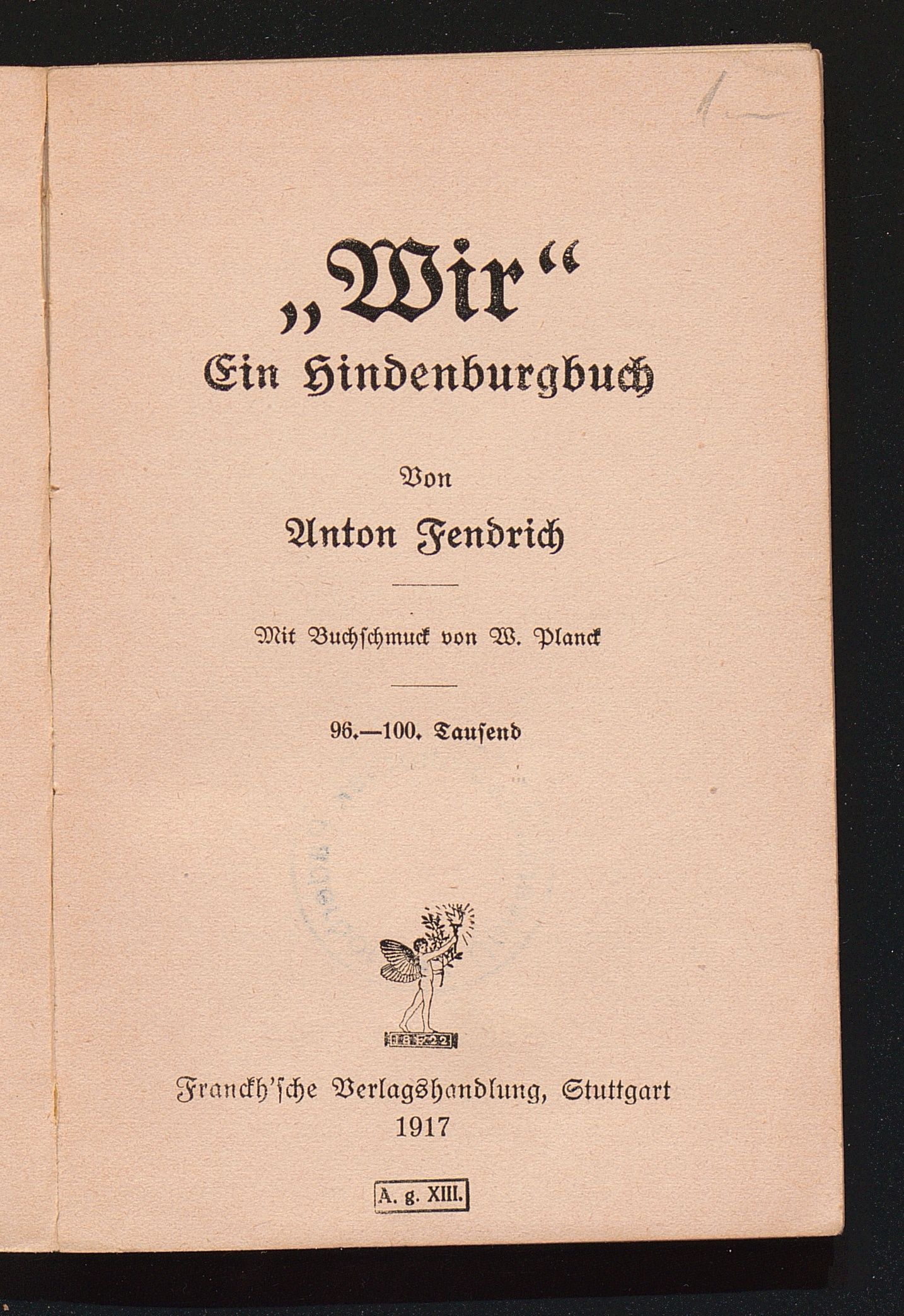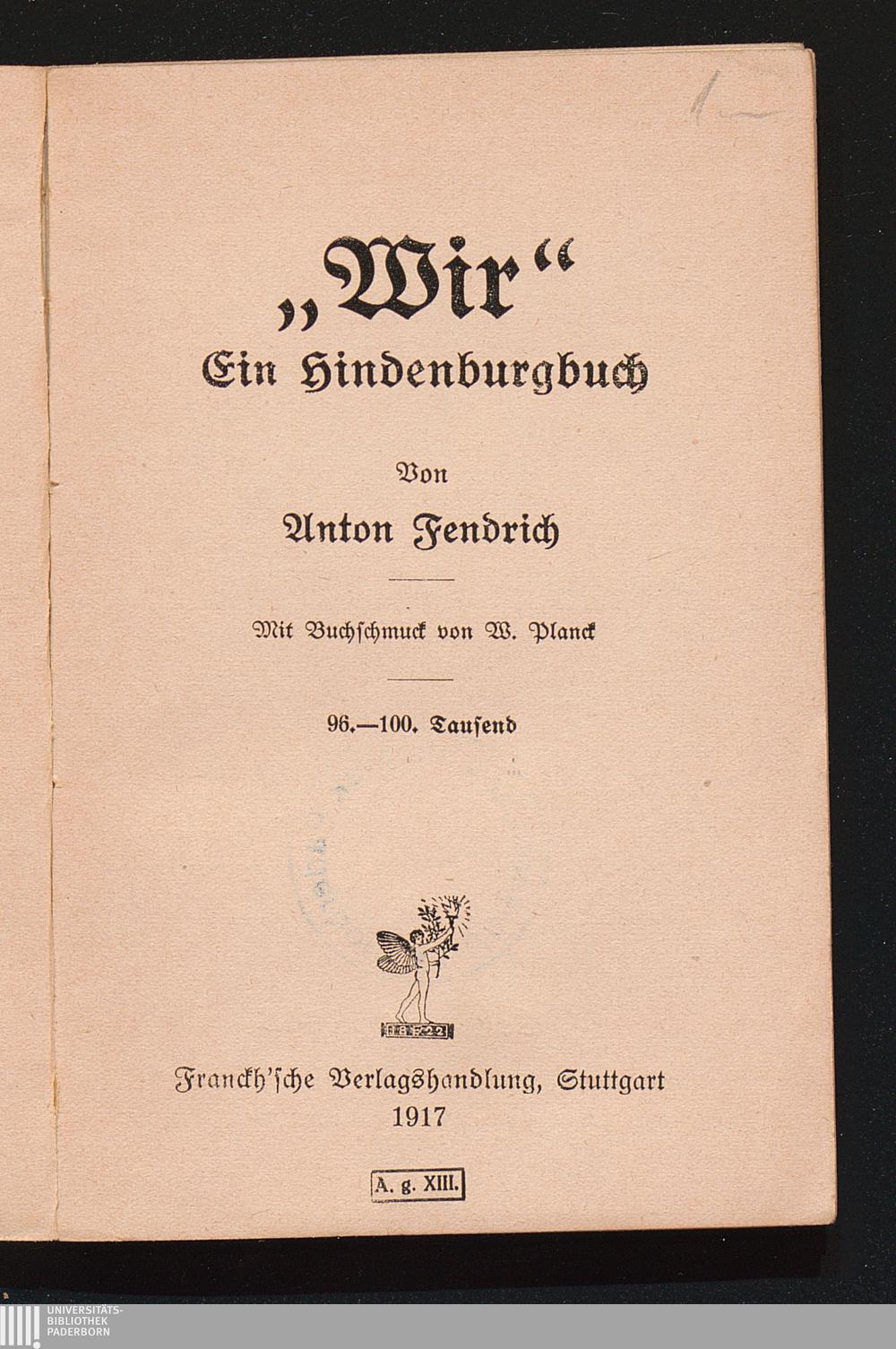 Wir : ein Hindenburgbuch / von Anton Fendrich. Mit Buchschmuck von W. Planck